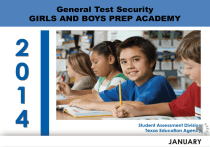 General Test Security GIRLS AND BOYS PREP ACADEMY GENERAL INFORMATION Student Assessment Division Texas Education Agency General Information • TEST DATES (GRADES 3-8) o April 1, 2014 – Math (5th & 8th Grades) o April 2, 2014 – Reading (5th & 8th Grades) o April 1-2, 2014 – Writing (4th & 7th Grades) o April 22, 2014 – Math (3rd, 4th, 6th & 7th Grades) o April 22, 2014 – Social Studies (8th Grade) o April 23, 2014 – Reading (3rd, 4th, 6th & 7th Grades) o April 23, 2014 – Science(5th & 8th Grades) o April 24, 2014 – Make-Up Testing o April 25, 2014 – Make-Up Testing Student Assessment Division Texas Education Agency General Information • STAAR EOC TEST DATES o March 31, 2014 – English I o April 1, 2014 – English II o April 2, 2014 – Makeup o Tuesday, May 6, 2014 – Algebra I o Wednesday, May 7, 2014 – Biology o Thursday, May 8, 2014 – US History o Friday, May 9, 2014 – Makeup Student Assessment Division Texas Education Agency • STAAR and STAAR Modified English I and English II - separate reading and writing tests have been combined into one test to be administered on a single day - assessments have a time limit of five hours • Student Success Initiative - English language learners in grades 5 and 8 will be held to Student Success Initiative (SSI) requirements for both mathematics and reading - English language learners assessed with STAAR L in mathematics at grades 5 and 8 will have retest opportunities in May and June • STAAR Modified - operational EOC assessment added for U. S. history in spring 2014 - only raw scores will be reported for U.S. history • STAAR Standardized Oral Administration (SOA) - offered statewide as an online option for oral administration for eligible students in the following grades and subjects: - grade 4 reading and mathematics - grade 7 reading and mathematics - grade 8 science and social studies - features a text-to-speech panel that students can use to hear selected text in test questions, answer choices, and graphics It’s the law! Procedures for maintaining the security and confidentiality of assessments are specified in the Test Security Supplement, the District and Campus Coordinator Manual, and in the appropriate test administration materials. It’s the law! Conduct that departs from the test administration procedures as established in the Test Security Supplement, the District and Campus Coordinator Manual, and test administrator manuals is considered a testing irregularity. It’s the law! Violation of Security and Confidentiality of Assessments Conduct that constitutes a severe violation of test administration procedures (serious irregularities) may include, but is not limited to, the actions listed below. o changing or altering an examinee’s response or answer to a test item o providing, suggesting, or indicating to an examinee a response or answer to a secure test question (this includes suggesting that the examinee review or change his or her response) o aiding or assisting an examinee with a response or an answer to a test question It’s the law! Violation of Security and Confidentiality of Assessments (continued) o duplicating secure test materials o disclosing the contents of any portion of a secure test o viewing a test before, during, or after an assessment unless specifically authorized to do so o encouraging or assisting an individual to engage in the conduct described above o failing to report to the appropriate authorities that an individual engaged in any of the events listed above It’s the law! Penalties for Violation of Security and Confidentiality of Assessments Violation of security or confidentiality of any test required by the Texas Education Code (TEC) Chapter 39, Subchapter B, is prohibited. A person who engages in conduct prohibited by the Test Security Supplement and in other test administration materials may be subject to a sanction of credentials. This includes any person who violates, assists in the violation of, or solicits another to participate in the violation of test security or confidentiality. Additionally, this includes any person who fails to report such a violation. It’s the law! Penalties for Violation of Security and Confidentiality of Assessments Penalties for participation in a serious violation of test security or confidentiality may include the following reprimands: o placement of restrictions on the issuance, renewal, or holding of a Texas teacher certificate o issuance of an inscribed or non-inscribed reprimand o suspension of a Texas teacher certificate o revocation or cancellation of a Texas teacher certificate It’s the law! Penalties for Violation of Security and Confidentiality of Assessments Release or disclosure of confidential test content is a Class C misdemeanor and could result in criminal prosecution under TEC §39.0303, Section 552.352 of the Texas Government Code, and section 37.10 of the Texas Penal Code. In addition, any irregularities in test security or confidentiality may result in the invalidation of student results. 2014 Security Supplement Policy and Procedure Highlights STAAR Test Session Time Limits • Test administrators must use a clock or timer. • Test administrators must communicate (orally or in writing) the amount of time left to test in one-hour intervals. • Students must record all responses by the end of the test session time period. • Start and stop times must be recorded on the seating chart. 2014 Security Supplement Policy and Procedure Highlights STAAR Test Session Time Limits • Multiple test sessions are allowed as long as the test session time limit is maintained. • Breaks are allowed during the administration of STAAR assessments. - Some breaks are included in the time limit and the time clock cannot be stopped (e.g., water breaks, snack breaks, bathroom breaks, short physical or mental breaks) - Some breaks are NOT included in the time limit and the time clock should be stopped and restarted when the stude