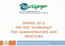 1 SPRING 2015 PRE-TEST WORKSHOP TEST ADMINISTRATORS AND PROCTORS Assessment, Research & Evaluation Training Overview 2 Overview of CAASPP Administration of paper and pencil tests (CST/CMA/CAPA) Administration of computer based tests (SBAC) Administration of performance tasks (SBAC) Universal tools, designated support, and accommodations Test security Resources 3 About CAASPP In spring 2015, CAASPP will include: Smarter Balanced computer adaptive test for grades 3-8 and 11 in ELA and math CST and CMA exams in grades 5, 8, and 10 in science (paperpencil) CAPA grades 5, 8, and 10 in science Alternate Assessment (replaces CAPA) grades 3 – 8 and 11 in ELA and math EAP will be determined from the SBAC grade 11 tests. No additional tests needed (TAM pg. 32) New this spring: SBAC tests are operational Orders will be based on what is in Infinite Campus - CALPADS Paper/pencil answer documents will have fewer fields to bubble Test Administrators Responsibilities 4 READ and sign affidavits MAKE SURE CORRECT TESTS ARE ADMINISTERED. Students who are not testing may not stay in the classroom where a test is being administered. If students need to be taken to another room to finish testing, BE SURE THEY ARE ESCORTED BY SCHOOL STAFF. Do not allow students to walk to another room with test materials by themselves. Test Administrators CANNOT: Review test questions before, during, or after testing. Check students’ answers including (but not limited to): 1. 2. Advising students of wrong answer or to check an answer; or Withholding answer docs until students demonstrate they have the right answers. Test Administrators Responsibilities 5 Test Administrators (TAs) shall monitor students throughout testing to make sure students are: On correct part Not going on to other parts or back to a previously completed part Not skipping a question on their answer document (so that they are off by one or more) Not using unauthorized electronic devices during the testing session TAs must ensure there is enough time to complete a part before beginning the part. TAs MAY NOT instruct student on how to answer a question. If they do not understand how to respond to the prompt, they can access the tutorial during testing. This is why it is important that students have opportunities to utilize the training and practice tests beforehand. NOTE: test administrators must be educational staff 6 Test Administration – Paper and Pencil Tests 7 Confirm which test(s) each student takes. Students take grade-level CSTs/CMAs/CAPA for Science in grades 5, 8, and 10 CMA and CAPA - Must have IEP that designates these tests for Science Confirm any Universal Tools, Designated Supports, and Accommodations students will use and where they will be tested Prepare materials Check names on test booklets and answer documents before distributing to make sure students receive correct documents Test Administration – Paper and Pencil Tests 8 All students must complete box # 1, even if Pre-ID was used. Students should mark the correct test version number Test Administration – Paper and Pencil Tests 9 Use Directions for Administration (DFAs) correctly. Read ALL “SAY” boxes exactly as written. Be sure to read and complete “First Day of Testing” section with students. ONLY translate boxes with “T” (NO CST/CMA/STS questions, prompts, or passages may be translated). Special Note: CST/CMA Combined Answer Document for Grade 5, 8, and 10 10 CAPA (California Alternate Performance Assessment) 11 Performance-based, one-on-one test For students with significant cognitive disabilities unable to take the CSTs even with Universal Tools, Designated Supports, and Accommodations Student must have an IEP – which specifies CAPA and which level Before handing out CAPA manuals, print the examiner name on the front CAPA – Answer Documents 12 Use only 2015 answer documents Ensure correct CAPA Level is marked. Only Level I can have “5” as a score. The highest possible score for Levels II through IV is “4.” Districts must double-rate a minimum of ten percent (10%) of the CAPA students per level, per site (including NPS). Students to be double-rated are randomly selected. Observers must mark Observer and BOTH examiners and observers must sign their separate answer documents. Use blank documents from overage. CAPA – Marking Answer Documents for Observers (Second Raters) 13 Use blank documents from overage 1 – Name, etc. 3 – Date of Birth 4 – Name 5 – Gender 6a – CAPA Level 6b – Grade 8 – Student ID 9 – SSID After Testing 14 Prepare tests for scoring Erase stray marks, but nothing in answer bubbles or mark-throughs A1 DO NOT complete without CDE notification A2 Special Conditions A3 Accommodations and Modifications Part a: mark “IEP” and/or “Section 504 plan” to indicate which program/plan student has, whether used Universal Tools, Designated Supports, and Accommodations or not. Note: IEP is required to take CMA, CAPA. Part b, mark codes for all Universal Tools, Designated Supports, and Accommodations student used as specified in IEP and/or 504 plan. A4 English Learner Test Variations For each test, what was actually used After Testing 15 Paperwork Transcribe Braille voided answer documents and large print (otherwise not processed) In Section A3 on the back of the answer document mark “G” or “H.” Damaged answer documents Write VOID on front of answer document(s) and return with nonscorables SBAC TEST ADMINISTRATION TAM pgs. 2333 & 37-40 16 SBAC Computer Based Tests 17 Grades 3-8 and 11 in ELA and math The only students exempt from participating in the test are: Students participating in the Alternate Assessment For the English language arts/literacy (ELA) test only, English learners (ELs) who have been attending school in the United States for less than 12 months Computer-based adaptive test in each ELA and Math Performance Task (PT) in each area Includes a classroom activity to familiarize students with question content 