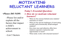 MOTIVATING RELUCTANT LEARNERS •Please DO NOW: –Please list and/or explain all the factors that impact a child’s achievement in school. –List 5 factors Today’s Essential Question: How do we motivate reluctant learners? – What are the reasons behind some students’ reluctance to learn? – What are the special challenges of motivating socially and economically disadvantaged students? – How does race and ethnicity affect how students respond to instruction and opportunities to learn? – What really works with reluctant learners? CLOSING ACHIVEMENT GAPS… • “We focus on what schools can do, recognizing that many of the reasons for a young person’s disengagement from school lie far beyond school.” – Engaging Schools: Fostering High School Students’ Motivation to Learn , The National Research Council, 2003. GROUP Source: Emetric, Oct 2011 Grade 112010 Grade 112011 Overall 73.3 78.3 Asian 36.4 57 Black 37.5 44.4 40 57.1 IEP 24.3 14.3 Title 1 37.3 45.9 Hispanic SCHOOL BASED FACTORS THAT INFLUENCE ACHIEVEMENT • Curriculum rigor, teacher experience & attendance, teacher preparation, class size, technology-assisted instruction, and school safety (Barton) • Teacher expectations (Landsman, Kuykendall, Tatum, McMillan, Aronson, Fordham & Ogbu, Hale) • Comprehensive Literacy Focus (Darwin, Fleischman, Gallagher, Allington, Tatum, Ivey, Fisher) • Teaching strategies & curriculum choices (Kunjufu, Hale, Kuykendall, Ladson-Billings, Tatum) • School Connectedness (Landsman, Morre, Simmons, Blum) What are the reasons behind some students’ reluctance to learn? • Self-efficacy, a person’s belief about his or her capability to accomplish meaningful tasks, directly affects his or her motivation to learn. – Lack of relevance -Lack of challenge – Fear of failure -Desire for attention – Peer concern -Emotional distress – Learning problems -Expression of anger Think/Ink/ Pair- Write 4 lines: How do the decisions a teacher makes in the classroom influence the factors that influence selfefficacy? Classroom Practices that Influence Motivation (Dolezal, Welsh, Vincent, 2003) – – – – – – – – – – – – – Teacher comments tie success to effort, not ability. Effort creates ability. Environment in which working together and improving is stressed over winning Displays of student work and accomplishments Scaffolding for struggling students Positive and specific feedback Activation of prior knowledge before new material Monitoring students behavior and attentiveness Source: Motivating Established routines and procedures Reluctant Learners, Correct level of difficulty- not too low or high from the ERS, 2004. Positive classroom and approaches Well planned and paced lessons Learning to learn is emphasized over simply completing a task Inspiring, energetic instructional practices “A large and growing body of literature is available on the determinants of motivation....in classroom situations, achievement motivation is a product between student characteristics and instructional practices.”-Okolo, Bahr, and Gardner, 1995 What are the special challenges of motivating socially and economically disadvantaged students? “Engaging adolescents cognitively and emotionally in school and academic work is a challenge regardless of the social or economic status of the student or the location of the schools. Adolescents are too old and too independent to follow teachers’ demands mindlessly, and many are too young, inexperienced, or uninformed to fully appreciate the value of succeeding in school. Academic motivation decreases steadily from the early grades of elementary school into high school, and disengagement from coursework is common at the high school level. Students living in low-income communities are not alone in being less than enthusiastic about schoolwork. But when students from advantaged backgrounds become disengaged, even though they learn less than they could, they usually get by or they get second chances; most eventually graduate and move on to other opportunities. In contrast, students from disadvantaged backgrounds..are less likely to graduate and face severely limited opportunities. In addition to having greater burdens and distractions, the consequences of being unengaged or dropping out of school are more serious for youth who do not have the social and other resources to cushion the effects of academic failure. Their failure to acquire the basic skills needed to function in adult society, whether or not they complete high school, dramatically increases their risks of unemployment, poverty, poor health, and involvement in the criminal justice system.” -Engaging Schools: Fostering High School Students’ Motivation to Learn, 2003. LET’S PLAY JEOPARDY Based on the research of Dr. Ruby K. Payne “Here is a simple fact: Wide, abundant reading is the surest route out of poverty and the limitations that impose themselves on the less literate. Reading changes everything.” -Mike Schmoker Hidden rules of poverty for 100. If you are born into poverty, you better start reading A- True B- False True – An education is the key to getting out, and staying out, of poverty Hidden rules of poverty for 200 The family structure in poverty tends to be A. patriarchal (headed by the father) B. matriarchal (headed by the mother) C. depends on who has the money B - matriarchal Hidden rules of poverty for 300. When a child has not had access to appropriate role models, which of these is NOT a way to provide emotional support for that child: A – Establishing long-term relationships by mentoring through a charismatic adult B- Teaching goal setting C- The “Do as I say, not as I do” approach D. Role modeling provided by teachers, administrators, and staff C Hidden rules of poverty for 400 What is the driving force for people living in poverty? A- financial, political, and social connections B- survival, relationships, and entertainment C- work and achieve