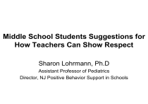 Middle School Students Suggestions for How Teachers Can Show Respect Sharon Lohrmann, Ph.D Assistant Professor of Pediatrics Director, NJ Positive Behavior Support in Schools Session Agenda • Background and context for the survey • Description of the analysis methods & results • Share NJPBSIS’s favorite strategies for getting students involved in PBIS activities Research Team • Sharon Lohrmann, Ph.D • Sunne-Ryse Smith, Psy.D • Scott McMahon, M.S.W The PBSIS Initiative: • Is a partnership with and funded by the NJ Office of Special Education Programs • The primary focus is on building capacity to support students with disabilities in general education programs PBSIS Website Directions • www.njpbs.org • Select the Resources tab – Page opens to the School-wide planning resources tab – Select the Individual Student Planning tab at the top • You are able to save all documents to your computers or flash drive Motivation for This Beginning Line of Research What Factors Lead to Positive Outcomes for Students? • The big questions we all ask ourselves: – How can schools organize themselves to promote positive academic and social outcomes? – What can staff do individually to promote positive academic and social outcomes? What Do You Think? • According to a substantial body of research, these are consistent predictors of academic achievement and positive social behaviors: • Positive teacher-student relationships • Supportive teacher behaviors (e.g., showing care and regard) • Positive peer relationships Just a Couple Examples of the Impact of Positive Teacher Relationships • Students are more likely to be resilient to risk factors when they perceive having supportive teachers (e.g., Loukas & Robinson, 2004) • Students are less likely to be truant, develop depressive systems, or engage in antisocial behaviors (e.g., Roeser & Eccles, 1998) • Children who experience conflicts with teachers in kindergarten are more likely to have negative behavior outcomes by eighth grade (Hamre & Pianta, 2001) The Interpretation of Research on Supportive Teacher Behaviors: • The relationships we have with students and the environments that we create are more influential than any other competing factors in helping students to have successful outcomes Examples of Socially Supportive School Environments • Encourage positive relationships between students and adults • Encourage positive interactions between students • Display caring • Create forums for students to be heard • Provide lots of social praise • Have clear expectations and routines • Provide help, support, and intervention quickly But Unfortunately, • Students’ perception of positive teacher relationships decrease as the student gets older (e.g., Lynch & Cicchetti, 1997) • Translation… – Students perceive having less of one of the most important factors that contribute to successful school outcomes Motivation for This Beginning Line of Research • As a researcher AND as a practitioner I have deep interest in understanding the experience of positive behavior support from the perspective of students and staff – I want to understand the first hand point of view of what students need, what students want, and how PBIS is impacting their life. Motivation for This Beginning Line of Research • Few empirically documented descriptions of first hand accounts or point of view with issues related to implementation of schoolwide positive behavior support • Qualitative studies on school climate: Research Motivation • Current Study: What can we LEARN about creating socially supportive environments by listening to what students have to say? • In the Future: how we take what we’re learning and connect it to the SWPBS process Study Research Question • To understand from the students’ point of view what explicit teacher behaviors students nominate as important to showing students respect Research Methods Background on the Student Survey • About 5 years ago, NJPBSIS began having schools implement a comprehensive self-assessment of climate & behavior priorities prior to implementing PBIS • The self-assessment includes: – Surveys of parents, staff, and students – Walkthrough of the building using a guided scoring guide Background on the Student Survey • The Universal Team summarizes the data collected from surveys into top priorities • Summaries of the assessment are presented to the school community (e.g., presentations, posting on cable stations, newsletters, etc.) • The Universal Team goes on to use the data to support universal intervention decision making Background on the Student Survey • The survey was developed by: – Reviewing the literature on school climate & SWPBS – Piloting the survey with an initial group of 10 schools – “Tweaking” and adjusting based on response patterns Background on the Student Survey • To date, the staff, parent, and student surveys have been implemented with: – – – – 24 - Elementary schools (starting at 3rd gr) 21 - Middle Schools 5 - K-8 school 7 - High Schools • However, we have not conducted a psychometric analysis of the survey The Student Survey – A Closer Look • 10 questions rated on a three point likert scale that ask about school climate related topics • Rate on a three point likert scale the extent to which behaviors and building locations are problematic • 1 open ended question: “What are three things your teachers can do to show you respect?” Survey Items Agree Not Sure Disagree My school is a positive and welcoming place I feel safe at school I feel safe on my way to school and on my way home Teachers help me when I am having trouble I can go to staff and teachers at my school if I need help I think all teachers expect the same behavior from all students Sometimes it’s hard to follow the school rules because of pressure from peers Students at this school are all treated fairly My teachers encourage