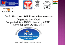 Media Partner Department of MNRE Govt . Of India. CMAI National MP Education Awards Organized by – CMAI Supported By - RGPV University, AICTE, Govt. Of India ,MNRE, DeIT March 18th,2013 Auditorium ,Bhopal Mr. N K Goyal, President, is the force behind the worldwide strong establishment of CMAI. Popularly known as ‘NKG’ in the trade circles, he carries a glowing 41 years of experience and is considered a “live walking encyclopedia” in the Technology Arena. - Known as so called Telecom Father Figure, being in the field for last 42 years. The only person in the world Inaugurating & Ribbon Cutting World’s largest Consumer Electronic Show CES Las Vegas, USA for continuous five years. - President, CMAI association of India, www.cmai.asia, having 48,500 members & 54 MOU partners worldwide; Chairman Emeritus, Telecom Equipment Manufacturers Association of India www.tematelecom.in; Vice Chairman International Telecom Union APT India; Member Governing Board Telecom Equipment & Services Export Promotion Council (Govt. of India), Director National Fertilizers Ltd. Associated with several industry associations. - Former GM HP Electronics Dev Corpn. & President HFCL. Contd.. Prof. Piyush Trivedi is Vice Chancellor of Rajiv Gandhi Proudyogiki Vishwavidyalaya, the University of Technology of Madhya Pradesh. He was Founder Head of the School of Pharmaceutical Sciences, RGPV , Bhopal. More details available at Actively engaged in ICT, Mobile, Telecom, Education, Alternate Energy, Multimedia, Infrastructure & Education Sectors. Ten China offices & in several other Countries including USA, UK, Taiwan, Korea, Singapore, Bangkok etc. Known for delegations to various Countries and receiving incoming delegations. Providing generally one way/two way air fare, free hotel stay etc. Representing on more than 100 Government Committees, Groups and very deeply involved in Policy Formulations on Telecom, Mobile, IT, Education. Industry Academic Interface, Guest Speaker, National Vocational Courses with AICTE/MHRD in Institutes Signature events are NTA ICT World Communication Awards and National Education Awards (at National and State Levels), presented by Secretary General, International telecom Union, Geneva; Head of Commonwealth Telecom organization, UK, Ministers from India, Africa etc. And ICOMM, the only exhibition for mobiles held every year in India, China at Shenzhen and Shanghai. As a hobby and CSR, known for spiritual life, meditation, yoga, Reiki, Spiritual therapy, psychic healing, excellence in life, Conflict/Stress management, personality development etc. ABOUT CMAI ASSOCIATION OF INDIA CMAI Association of India is a apex premier and foremost non-profit trade promotion organization based in India with more then 54 MOU partners and representatives spread across globe. CMAI is prominent trade association promoting growth in communications, manufacturing trade sector through Legislative and Regulatory Advocacy, Research, Exhibitions, Trade shows, Conferences and Seminars, Technology events, Buyer sellers meets, B2B meetings, promotion and fostering business and strategic relationships. CMAI is the only trade organization bringing in focuses harmony in between manufacturing across all sectors including ICT, Communications, Multimedia and Environmental Management policies. CMAI assists in promotion of technology innovations, manufacturing and communications sector and for policies concerning environmental, pollution and health. CMAI, as a professional registered association, has become extremely pro-active, forward looking and effective catalyst between the Government, industry and the consumers at large. CMAI has been successful in influencing the Government in shaping India's economic, trade, fiscal and social policies which will be of benefit to the country as a whole and the trade and industry in particular. CMAI caters services to various constituents comprising multinational companies, top corporate, medium and small scale units representing and striving hard to create a conducive environment for the businesses to compete globally. It assists manufacturers to maximize competitiveness on the domestic and international markets. SZEIA SMCA Supported by Dainik Bhaskar Group & ABP News 7th MAY 2013 , FICCI AUDITORIUM NEW DELHI Awards will be presented by – Mr. Hamadoun Toure, Secretary General ITU Mr. Tim Unwin, CEO CommonWealth Telecommunications Org Mr. Kapil Sibal , Minister for Communications & IT Mr. SS Mantha , Chairman AICTE DOT Govt . Of India. DIT Govt. Of India. Ministry of MNRE Government of India Knowledge Partner CMAI is organizing National Education Awards and NTA ICT World Communication Awards on 8th May, 2013. As a subset to that CMAI is organizing State Level Awards. The first National Uttarakhand Education Awards 2013 has been jointly organized by Uttarakhand Technical University & CMAI Association of India and supported by AICTE, Ministry Of MNRE , DeIT on 11th February, 2013 at Dehradun. The next are planned in UP during March, 2013 and would be followed in other States. The awards in Dehradun were graced by Prof. Dr. DS Chauhan, Vice Chancellor, Uttarakhand Technical University; Sh RC Pathak, IAS Secretary Science and Technology Uttarakhand Government, Director IIT Roorkee and Representative of AICTE. The awards in Noida will be graced by Prof SK Kak VC MTU , Chairman AICTE & Representative from UP govt. Several officials from University, Telecom & IT Associations of India will be participating in this event, which will be extensively covered by the media. ORGANIZES EVERY YEAR NATIONAL TELECOM AWARDS Department of Information Technology Government of India Department of Telecconications Government of India 11TH MAY 2012 , SIRI FORT AUDITORIUM NEW DELHI Ministry of MNRE Government of India Supported by Dainik Bhaskar Group Awards were given by Mr. Hamadoun Toure, Secretary General ITU Mr. SS Mantha , Chairman AICTE Media Partner Mr. Girish Pradhan , Secy MNRE Knowledge Partner