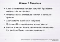 Chapter 1 Objectives • Know the difference between computer organization and computer architecture. • Understand units of measure common to computer systems. • Appreciate the evolution of computers. • Understand the computer as a layered system. • Be able to explain the von Neumann architecture and the function of basic computer components. 1 1.1 Overview Why study computer organization and architecture? – Design better programs, including system software such as compilers, operating systems, and device drivers. – Optimize program behavior. – Evaluate (benchmark) computer system performance. – Understand time, space, and price tradeoffs. 2 1.1 Overview • Computer organization – Encompasses all physical aspects of computer systems. – E.g., circuit design, control signals, memory types. – How does a computer work? • Computer architecture – Logical aspects of system implementation as seen by the programmer. – E.g., instruction sets, instruction formats, data types, addressing modes. – How do I design a computer? 3 1.2 Computer Components • There is no clear distinction between matters related to computer organization and matters relevant to computer architecture. • Principle of Equivalence of Hardware and Software: – Any task done by software can also be done using hardware, and any operation performed directly by hardware can be done using software.* * Assuming speed is not a concern. 4 1.2 Computer Components • At the most basic level, a computer is a device consisting of three pieces: – A processor to interpret and execute programs – A memory to store both data and programs – A mechanism for transferring data to and from the outside world. 5 1.3 An Example System Consider this advertisement: What does it all mean?? 6 1.3 An Example System Measures of capacity and speed: • • • • • • • • Kilo- (K) = 1 thousand = 103 and 210 Mega- (M) = 1 million = 106 and 220 Giga- (G) = 1 billion = 109 and 230 Tera- (T) = 1 trillion = 1012 and 240 Peta- (P) = 1 quadrillion = 1015 and 250 Exa- (E) = 1 quintillion = 1018 and 260 Zetta- (Z) = 1 sextillion = 1021 and 270 Yotta- (Y) = 1 septillion = 1024 and 280 Whether a metric refers to a power of ten or a power of two typically depends upon what is being measured. 7 1.3 An Example System • Hertz = clock cycles per second (frequency) – 1MHz = 1,000,000Hz – Processor speeds are measured in MHz or GHz. • Byte = a unit of storage – – – – – 8 1KB = 210 = 1024 Bytes 1MB = 220 = 1,048,576 Bytes 1GB = 230 = 1,099,511,627,776 Bytes Main memory (RAM) is measured in GB Disk storage is measured in GB for small systems, TB (240) for large systems. 1.3 An Example System Measures of time and space: • • • • • • • • 9 Milli- (m) = 1 thousandth = 10 -3 Micro- () = 1 millionth = 10 -6 Nano- (n) = 1 billionth = 10 -9 Pico- (p) = 1 trillionth = 10 -12 Femto- (f) = 1 quadrillionth = 10 -15 Atto- (a) = 1 quintillionth = 10 -18 Zepto- (z) = 1 sextillionth = 10 -21 Yocto- (y) = 1 septillionth = 10 -24 1.3 An Example System • Millisecond = 1 thousandth of a second – Hard disk drive access times are often 10 to 20 milliseconds. • Nanosecond = 1 billionth of a second – Main memory access times are often 50 to 70 nanoseconds. • Micron (micrometer) = 1 millionth of a meter – Circuits on computer chips are measured in microns. 10 1.3 An Example System • We note that cycle time is the reciprocal of clock frequency. • A bus operating at 133MHz has a cycle time of 7.52 nanoseconds: 133,000,000 cycles/second = 7.52ns/cycle Now back to the advertisement ... 11 1.3 An Example System The microprocessor is the “brain” of the system. It executes program instructions. This one is an Intel i7 running at 3.9GHz. 12 1.3 An Example System • Computers with large main memory capacity can run larger programs with greater speed than computers having small memories. • RAM is an acronym for random access memory. Random access means that memory contents can be accessed directly if you know its location. • Cache is a type of temporary memory that can be accessed faster than RAM. 13 1.3 An Example System This system has 32GB of (fast) synchronous dynamic RAM (SDRAM) . . . … and two levels of cache memory, the level 1 (L1) cache is smaller and (probably) faster than the L2 cache. Note that these cache sizes are measured in KB and MB. 14 1.3 An Example System Hard disk capacity determines the amount of data and size of programs you can store. This one can store 1TB. 7200 RPM is the rotational speed of the disk. Generally, the faster a disk rotates, the faster it can deliver data to RAM. (There are many other factors involved.) 15 1.3 An Example System ATA stands for advanced technology attachment, which describes how the hard disk interfaces with (or connects to) other system components. A DVD can store about 4.7GB of data. This drive supports rewritable DVDs, +/-RW, that can be written to many times.. 16x describes its speed. 16 1.3 An Example System Ports allow movement of data between a system and its external devices. This system has ten ports. 17 1.3 An Example System • Serial ports send data as a series of pulses along one or two data lines. • Parallel ports send data as a single pulse along at least eight data lines. • USB, Universal Serial Bus, is an intelligent serial interface that is self-configuring. (It supports “plug and play.”) 18 1.3 An Example System System buses can be augmented by dedicated I/O buses. PCI, peripheral component interface, is one such bus. This system has two PCIe (PCI express) devices: a video card and a sound card. 19 1.3 An Example System Active matrix technology uses one transistor per picture element (pixel). The resolution of a monitor determines the amount of text and graphics that the monitor can display. Super VGA (SVGA) tells us this monitor has a resolution of 1280 × 1024 pixels. The video card contains memory and programs that suppo