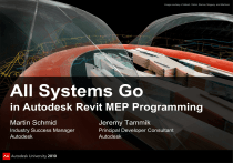 Image courtesy of Hobart, Yañez, Ramos, Maguey, and Martínez All Systems Go in Autodesk Revit MEP Programming Martin Schmid Jeremy Tammik Industry Success Manager Autodesk Principal Developer Consultant Autodesk Objectives of this RME API Unconference Share and discuss best practices of Revit MEP programming You should be familiar with Your current areas of interest and hottest problems Your ideas and visions Your experience Wish list items Programming for MEP in a BIM The functionality of the Revit MEP API The Revit MEP API samples We do not discuss and assume knowledge of How to program in .NET The basics of the generic Revit API Revit product and Revit MEP usage About the Presenters Martin J. Schmid P.E. Industry Success Manager Autodesk Martin has worked on-site with customers to implement best practices using AutoCAD MEP and Revit MEP, ranging from engineering firms and manufacturers to 3rd party developers. In his current role as Industry Success Manager, Martin works with product management, product design, and quality assurance teams providing subject matter expertise. In addition, he works with sales and key accounts to help with workflow adoption and to identify technical trends. He has written and presented material on AutoCAD MEP and Revit MEP to coworkers as well as at Autodesk University. Prior to involvement with the development of MEP products, Martin worked in a variety of roles in a number of architecture and engineering firms, including electrical designer, engineering coordinator, and application developer. Martin has a master’s degree in Architectural Engineering from Kansas State University and a master’s in Business Management of Technology from the University of Texas in San Antonio, and is a member of ASHRAE. Martin is a published co-author of books on AutoCAD MEP and Revit MEP. Martin has a beautiful wife and two daughters, and works from his home in San Antonio, TX. Martin has two drum sets which get to use during ‘down time’, and enjoys travelling and reading. About the Presenters Jeremy Tammik Principal Developer Consultant Developer Technical Services EMEA, Autodesk SARL Jeremy is a member of the AEC workgroup of the Autodesk Developer Network ADN team, providing developer support, training, conference presentations, and blogging on the Revit API. He joined Autodesk in 1988 as the technology evangelist responsible for European developer support to lecture, consult, and support AutoCAD application developers in Europe, the U.S., Australia, and Africa. He was a co-founder of ADGE, the AutoCAD Developer Group Europe, and a prolific author on AutoCAD application development. He left Autodesk in 1994 to work as an HVAC application developer, and then rejoined the company in 2005. Jeremy graduated in mathematics and physics in Germany, worked as a teacher and translator, then as a C++ programmer on early GUI and multitasking projects. He is fluent in six European languages, vegetarian, has four kids, plays the flute, likes reading, travelling, theatre improvisation, yoga and carpentry, loves mountains, oceans, sports, and especially climbing. The Revit MEP API Introduction Analysis Hierarchical Systems and Connectors Electrical HVAC and Plumbing Sample Applications Learning More Acronyms ADN AEC API BIM GUI HVAC MEP RAC RME RST SDK UI Autodesk Developer Network Architecture, Engineering, Construction Application Programming Interface Building Information Model Graphical User Interface Heating, Ventilation, and Air Conditioning Mechanical, Electrical, and Plumbing Revit Architecture Revit MEP Revit Structure Software Development Kit User Interface MEP Application Requirements Mechanical, electrical and plumbing domains M is HVAC, i.e. heating, ventilation and air conditioning Need for strong model analysis tools Need to read and write access to the components and data MEP project information Green Building XML, gbXML Spaces and zones Electrical systems, components, properties and parameters Duct and pipe systems, components, properties and parameters Element creation and modification System traversal and analysis The Generic Revit API Basic Revit API is generic All flavours use the same .NET assembly RevitAPI.dll Specific additional features exist for each flavour, e.g. Room-related functionality in Revit Architecture Access to the analytical model in Revit Structure Access to the MEP model in Revit MEP Revit MEP API Evolution Generic element and parameter access can always be used Revit 2008 provided no MEP-specific API Revit 2009 introduced MEP-specific API support MEP model property, space and zone, electrical and mechanical equipment, lighting device and fixture, connector, electrical system MEP API was a focal point of the Revit 2010 and 2011 APIs 2010: MEP namespace, support for HVAC and piping systems 2011: conduit, cable tray, panel schedule and more Revit MEP 2011 Product Enhancements Panel Schedules Cable Tray and Conduit Other Enhancements Placing Valves and Fittings in Section or Elevation Views Tagging of MEP Elements during placement Demand Factors and Load Categories Piping Companion Flanges New Electrical Content Oval Duct Revit MEP 2011 API Enhancements Cable Tray and Conduit CableTrayConduitBase – base class for cable trays and conduits CableTrayConduitRunBase – base class for cable tray and conduit runs CableTray – a cable tray instance CableTrayType – a cable tray type CableTrayRun – a cable tray run Conduit – a conduit instance ConduitType – a conduit type ConduitRun – a conduit run Panel Schedules TableView – represents a view that shows a table TableData – holds most of the data describing the table row, column, and cell TableSectionData – holds row, column and cell data for a TableData instance PanelScheduleView – represents a view that shows a panel schedule PanelScheduleData – holds most of the layout, appearance, row, column, and cell style data PanelScheduleTemplate – represents a branch panel, a swi