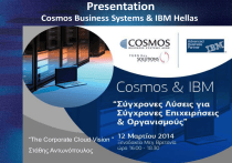 Presentation Cosmos Business Systems & IBM Hellas “The Corporate Cloud Vision ” Στάθης Αντωνόπουλος Cosmos Business Systems & IBM Hellas Driving Better Business Outcomes through a Smarter Infrastructure The ability to balance Optimization and Innovation will be critical to success… Drives need for continuous Optimization Fuels investments in innovation optimization Innovation Cosmos Business Systems & IBM Hellas The IT challenges Infrastructure Operations We have lots of tools, to manage isolated automation tasks Releasing a new application in production is a lot more then creating a virtual machine. But getting everything coordinated is challenging and takes a lot of time I need to link tens of different tools, people, departments. It takes weeks. Development Business I need to accelerate delivery and improve feedback between development and production. I need to react quickly to market demand. IT is not fast enough to support my strategy and is slowing down innovation Cosmos Business Systems & IBM Hellas Internet of things Our infrastructures are virtually without limits – growing smarter and more interconnected with every passing second… 200 Billion 1 Billion Connected physical assets & devices Consumers will have SmartPhones Instrumente d Physical Assets Growing Mobile Access 62% 2.72 ZB of workloads of digital content will be Cloud- - a 50% increase based New types of workloads “Internet of things” Big Data Explosion Cosmos Business Systems & IBM Hellas Something meaningful is happening… The world is about to get a whole lot smarter “Every human being, company, organization, city, nation, natural system and man-made system is becoming interconnected, instrumented and intelligent. This is leading to new savings and efficiency—but perhaps as important, new possibilities for progress.” 5 © 2013 IBM Corporation Cosmos Business Systems & IBM Hellas Dynamic Infrastructure: Helping build a smarter planet A Crisis of Complexity The Need for Automation is Clear 1.5x Explosion of information driving 54% growth in storage shipments every year. 70¢ per $1 70% on average is spent on maintaining current IT infrastructures versus adding new capabilities. 85% idle In distributed computing environments, up to 85% of computing capacity sits idle. Pools of shared resources Cosmos Business Systems & IBM Hellas Dynamic Infrastructure: Helping build a smarter planet Patterns of Expertise - Key capability for Industrial Automation What the business wants… What’s required… What a pattern automates… Cosmos Business Systems & IBM Hellas Dynamic Infrastructure: Helping build a smarter planet Self Service Drives Client Satisfaction and Standardization ATM Point of Sale Cloud Secure online transaction processing Consumer checkout and information IT infrastructure, applications and processes Cosmos Business Systems & IBM Hellas Dynamic Infrastructure: Helping build a smarter planet Dynamic Infrastructure: Is highly optimized to achieve more with less…. CLOUD COMPUTING VIRTUALIZATION + STANDARDIZATION + AUTOMATION = Reduced Cost …leveraging virtualization, standardization and automation to free up operational budget for new investment. Cosmos Business Systems & IBM Hellas Dynamic Infrastructure: Helping build a smarter planet Cloud-onomics… CLOUD COMPUTING AGILITY + BUSINESS & IT ALIGNMENT + SERVICE FLEXIBILITY + INDUSTRY STANDARDS = OPTIMIZED BUSINESS ….allowing you to optimize new investments for direct business benefits Cosmos Business Systems & IBM Hellas Dynamic Infrastructure: Helping build a smarter planet Benefits of Cloud Computing Business innovation – Enables organizations to quickly and cost-effectively deploy new solutions for use inside and outside the company Service delivery –Enables the dynamic availability of IT applications and infrastructure. More rapid and enhanced service delivery reinforces efforts for customer retention, faster time to market and horizontal market expansion. Cloud enhances SOA, information management and service management initiatives. IT optimization – Offers massive scalability and can help lower cost of ownership, which drives higher profitability, enabling you to more easily reinvest in your infrastructure and answer the question, “how do I do more with fewer resources?” Cosmos Business Systems & IBM Hellas Dynamic Infrastructure: Helping build a smarter planet Cloud Computing … “Cloud” is an emerging consumption and delivery model for many IT-based services, in which the user sees only the service, and has no need to know anything about the technology or implementation Attributes Standardized, consumable webdelivered services Flexible pricing Elastic scaling Rapid provisioning Service Metering & Billing Advanced Catalog virtualization Ordering VISIBILITY CONTROL AUTOMATION ....service oriented and service managed Cosmos Business Systems & IBM Hellas Dynamic Infrastructure: Helping build a smarter planet The journey to cloud the new M/F Business Value Centralize Consolidate > Virtualize > Organization Automate > Culture Optimize > Governance ….requires an integrated and orchestrated approach. Cosmos Business Systems & IBM Hellas Why IBM Cloud Computing Why IBM? Beyond Virtualization Mobile Enterprise Why IBM? Unified Smart Infrastructure Why IBM? Return on Investment Not multiple tools – automatically manage & secure all mobile, desktop, server, & devices. Not basic lifecycle mgmt – extend the useful life of capital & physical assets, & optimize facilities Interoperable* Compliant Predictive Analytics No proprietary vendor lockin – open standards for quick plug in of multi-vendor applications. Not point-in-time audits – realtime reporting & enforcement of config, patch, & software policies. Not just maintenance planning – collect & analyze data from any source & predict service impact. Not just VMs – hybrid service orchestration, image mgmt, recovery, accounting, security, performan