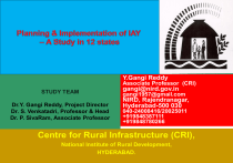 Y.Gangi Reddy Associate Professor (CRI) STUDY TEAM Dr.Y. Gangi Reddy, Project Director Dr. S. Venkatadri, Professor & Head Dr. P. SivaRam, Associate Professor gangi@nird.gov.in gangi1957@gmail.com NIRD, Rajendranagar, Hyderabad-500 030 040-24008416/20025011 +919848387111 +919848780266 Centre for Rural Infrastructure (CRI), National Institute of Rural Development, HYDERABAD. Rural Housing • Housing is a basic human need after Food & Clothing (Roti, Kapada & Makaan) – Constitution of India: Article 21 (1951) – Universal Declaration of Human Rights (UDHR)1948 – Istanbul Declaration 1996 • Owning a house provides significant economic security and Social status in village community Indira Awas Yojana (1996 – 75:25) • All BPL or income less than Rs. 32,000 (Annual) • GP and Gram sabha - Waiting list on GP wall • Selection is based on Priority, SC/ST-60% (Permanent Waitlist) • Unit Cost Plain Rs. 45,000 - (48,500) minimum plinth 200 sq.fts. • Support for Up gradation Rs. 15,000 • Payment by GP through bank account (female) • Monitoring & Evaluation (midterm- GP with a committee- gram sabha) Shortage of Housing in India • 2001Census – Total shortage 35 Million – People in Kutcha: 32 Million – Houseless : 3 Million • Working Group 11th FY Plan – 43 Million (2007-12) • Working Group 12thFY Plan – 48.81 Million (2012-17) – BPL (90%) 43.93 • Decadal GR of RHH 24.31% • • • • • • • • Indira Awas Yojana (1996 – 75:25) All BPL or income less than Rs. 32,000 (Annual) GP and Gram sabha- Writing list on GP wall Priority, SC/ST-(Permanent Waitlist) Proportionate Unit Cost Plain Rs. 70,000 - (75,000) minimum plinth 20 sm Support for Up gradation Rs. 20,000 Credit cum subsidy Rs. 62,500 (50,000 +12,500) Payment through bank account (female) Monitoring &Evaluation (Gram sabha,Local Area Officers, Awaassoft & NLM of MoRD) New Initiatives • Administrative Expenses – 4% of fund released • House site support for Landless- 20,000 (Homestead)-20,000 • Empowered Committee (ASRD) • 5 % of total budget for special projects) • Habitat for PTG/FRA & Individual for Scattered • Access to Land, Finance, Infrastructure, Technology, Delivery mechanism, Capacity building & Information Land Use Classification in India (2009-10) 10% Land under Cultivation 17% Land under Forests 73% Not available for Cultivation Literacy Rate in India - 2011 Census 90 80 70 60 50 40 30 20 10 0 Rual Urba Total Male Fema Total n le Series1 68.91 84.98 74.04 82.14 65.46 74.04 Poverty Ratio in India 60 50 40 30 20 10 0 Rural Urban Total 1973-74 56.4 49 54.9 19992000 41.8 25.7 37.2 2009-10 33.8 20.9 29.8 Households used Predominent Material for the Roof Thatch Housing Condition in India Dilapidated 6% Tiles Good 46% 18% 21% Burnt Bricks Stone 16% 9% Livable 48% Households by No. of Dwelling Rooms No Exclusive 3% 3% 4% Room One Room 7% 37% 14% Two Rooms Three Rooms Four Rooms Five Rooms 32% Six Rooms and above 29% 7% GI / Asbestos Sheet Concrete Households by Main Source of Drinking 4% Water Tap Water 8% 31% Well Hand Pump 44% 13% Tube / Borewell Other sources Households by Latrine Facility 70.00% Axis Title 60.00% 50.00% 40.00% 30.00% 20.00% 10.00% 0.00% Series1 Latrine facility within the premises 30.73% No Latrine within the premises 69.27% NEED FOR THE STUDY • Given the background of Shelter for all the poor and the programme of IAY, several states initiated their own state specific programmes such as INDIRAMMA, Ashraya, SPAY, AAY & Samathvapuram during the recent past. • Several Good Practices are adopted by different states in fulfilling the Housing Needs of the Poor. • MoRD was interested to take up a study on IAY in different states to document the same so as to strengthen the programme of IAY. • With this background the study was undertaken on IAY Objectives of the study • To review the guidelines of IAY and their relevance to the socio-economic profile of beneficiaries and trace out the various problems of housing of rural poor • To understand the constraints, analyze provisions and the process of implementation of IAY programme • To identify different best practices adopted in the implementation of IAY • To suggest interventions for refinement of national rural housing policy for effective implementation of IAY Study Area & Sample Name of the Districts S.No. Name of the State visited Mayurbhunj 1 Orissa Sambalpur Dhamtari 2 Chattisgarh Raipur Dhanbad 3 Jharkhand Ranchi Simogha 4 Karnataka Bidar West Godavari 5 Andhra Pradesh Anantapur Coimbatore 6 Tamil Nadu Erode Thane 7 Maharashtra Solapur Bikaner 8 Rajasthan Nagaur Thiruvanantapuram 9 Kerala Kollam Cachar 10 Assam Nagaon Vadodara 11 Gujarat Anand Solan 12 Himachal Pradesh Kangra No. of Name of the Blocks Visited GPs Joshipur, Bisai 04 Hirakud, Sason 04 Dhamtari, Nagri 04 Bhansoj, Arang 04 Dhanbad, Kusunda 04 Namkon, Rampur 04 Hosanahalli, Hiriyur 04 Bidar, Andur 04 Achanta, Pedavegi 04 Kuderu, Tadimarri 04 Anamalai, Polachi 04 Bhavani, Gobichettipalayam 04 Jawar, Mokhada 04 Mohol, Pandarpur 04 Shri Kolayat, Mundsar 04 Pharrod, Asawari 04 Athayanoor, Nemon 04 Kottarakara, Vattakavala 04 Narsingpur Dev, Sonai Dev 04 Kathiatal, Rupahilat 04 Sankheda, Naswadi 04 Kambat, Sojitra 04 04 Solan, Dharampur Annexure 04 Nagrota Bagwan No. of Samples 40 40 40 40 40 40 40 40 40 40 40 40 40 40 40 40 40 40 40 40 40 40 40 40 Methodology & Data Collection – Selection of the district and blocks was done in consultation with the concerned officials and progress of the work done – In-depth study is based on data collection from the primary stakeholders (IAY households) Total Sample: 960 – Focus Group Discussions: 1. IAY Beneficiaries 2. GP Members 3. Concerned Officials - Consulted with: 1. RBCs / Nirmiti Kendras 2. Brick Making Units Aspects of Best Practices Identified • Selection Process of the beneficiaries • Cost of Construction: Unit Assistance Credit Sources No. of Installments • Own contribution (