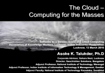 The Cloud – Computing for the Masses Software as a Service (SaaS) and Cloud Computing Association of Knowledge Workers, Lucknow; Indian Industries Association Lucknow, 13 March 2010 Asoke K. Talukder, Ph.D Corporate Advisor, Sahara Next, Lucknow Director, Geschickten Solutions, Bangalore Adjunct Professor, National Institute of Technology, Warangal Adjunct Professor, Indian Institute of information Technology & Management, Gwalior Adjunct Faculty, National Institute of Technology Cloud Karnataka, Surathkal © Asoke K Talukder 13th March 2010 Computing - 1/50 Picture of the Cloud: Wikipedia The Cloud © Asoke K Talukder 13th March 2010 Cloud Computing - 2/50 Source: Wikipedia About the Speaker • © Asoke K Talukder Dr. Asoke K. Talukder worked for companies like Fujitsu-ICIM, Microsoft, Oracle, Informix, Digital, Hewlett Packard, ICL, Sequoia, Northern Telecom, NEC, KredietBank, iGate, Cellnext, etc. Dr. Asoke authored two textbooks and edited two books; he also published many peer-reviewed research papers. He is recipient of many international awards including All India Radio/Doordarshan award, ICIM Professional Excellence Award, ICL Excellence Award, IBM Solutions Excellence Award, Simagine GSMWorld Award etc. Dr. Asoke has been listed in “Who’s Who in the World”, “Who’s Who in Science and Engineering”, and “Outstanding Scientists of 21st Century”. He did M.Sc (Physics) and Ph.D in Engineering. He was the DaimlerChrysler Chair Professor at IIIT, Bangalore; currently an Adjunct Professor, Department of Computer Science & Engineering, NIT Warangal, Adjunct Professor, ABV Indian Institute of Information Technology & Management, Gwalior, and Adjunct Faculty Department of Computer Engineering, NITK, Surathkal. He is Corporate Advisor to SaharaNext and Chief Scientific Officer, Geschickten Solutions, Bangalore. 13th March 2010 Cloud Computing - 3/50 Cloud Computing in India Economic Times, 11th February 2010 © Asoke K Talukder 13th March 2010 Cloud Computing - 4/50 What is Cloud Computing? © Asoke K Talukder 13th March 2010 Cloud Computing - 5/50 Computing in the Cloud Source: http://www.free-pictures-photos.com/ © Asoke K Talukder 13th March 2010 Cloud Computing - 6/50 Cloud Computing Defined • Cloud computing is an emerging computing paradigm where data and applications reside in the cyberspace, it allows users to access their data and information through any web-connected device be it fixed or mobile. • Source: John B. Horrigan, Use of Cloud Computing Applications & Services, Data memo, PEW Internet & American Life project, September 2008 © Asoke K Talukder 13th March 2010 Cloud Computing - 7/50 We all (?) use The Cloud © Asoke K Talukder 13th March 2010 Cloud Computing - 8/50 Characteristics of Cloud Computing • Virtual – Physical location and underlying infrastructure details are transparent to users • Scalable – Able to break complex workloads into pieces to be served across an incrementally expandable infrastructure • Efficient – Services Oriented Architecture for dynamic provisioning of shared compute resources • Flexible – Can serve a variety of workload types – both consumer and commercial © Asoke K Talukder 13th March 2010 Cloud Computing - 9/50 Types of the Cloud • Private Cloud – Cloud Computing private to an enterprise • Public Cloud – Cloud Computing where the cloud services are offered by Cloud Vendors and anybody can use & deploy their services in this cloud • Hybrid Cloud – Combination of Private & Public Cloud © Asoke K Talukder 13th March 2010 Cloud Computing - 10/50 Private Cloud • Private cloud will be implemented by enterprises for their own private use. This will mainly be available to enterprise’s customers, employees, partners, and suppliers. This will mainly be to reduce the cost and have a centralized management of the data. Private cloud will be a extension of the data centre within the control of the enterprise; in private cloud an enterprise can implement a security policy and control people and hardware resource with respect to privacy and access. Amazon book store is an example of private cloud. © Asoke K Talukder 13th March 2010 Cloud Computing - 11/50 Public Cloud • The public cloud can be defined as the outsourcing model for computing, hardware, and storage functions to a third party service provider, which hosts applications on cyberspace through linked services. • Source: Cristos Velasco San Martin, Jurisdictional Aspects of Cloud Computing, February 28, 2009 © Asoke K Talukder 13th March 2010 Cloud Computing - 12/50 Hybrid Cloud Source: Wikipedia © Asoke K Talukder 13th March 2010 Cloud Computing - 13/50 Commercial Clouds © Asoke K Talukder 13th March 2010 Cloud Computing - 14/50 Cloud Computing User – I (Amir) © Asoke K Talukder 13th March 2010 Cloud Computing - 15/50 Cloud Computing User – II (Fakir) © Asoke K Talukder 13th March 2010 Cloud Computing - 16/50 Next Generation Internet • • • • • • • • • • • • • • • • Multi-user-agent Multi-service Multi-access Multi-provider Multi-protocol networks Web 2.0 and Web 3.0 Innovation moving from Technology Companies to the Consumer space IPv6 with IPsec Universal seamless roaming Support mobility at vehicular state Intelligent and programmable networks Definable service quality Definable security level On demand scalability API in the network to obtain context information (spatial, environmental, and temporal attributes) API in the network to enforce QoS and security © Asoke K Talukder 13th March 2010 Cloud Computing - 17/50 Intel's New SCC (Single Chip Cloud Computer) – a 48-core Processor • Intel debuted and demonstrated its Single-chip Cloud Computer (SCC) processor on 2nd December 2009. The processor has 48 cores – 24 dual-core "tiles"--connected with a high-speed mesh network. Intel wants the experimental chip, at least 100 of which it will distribute to researchers in 2010, to lead to new