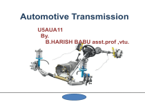Automotive Transmission U5AUA11 By. B.HARISH BABU asst.prof ,vtu. UNIT I Contents Introduction Transmission Systems Manual Automated Manual Automatic Continuously variable Dual Clutch Propeller Shaft 2 Contents Universal joints Differential Requirements of the Transmission Design Process Product Life Cycle Stages in the Design Process • Project Set Up • Concept Design • Detailed Design • Engineering Drawings and Tolerancing 3 Transmission System • Function of transmission: - It is used to transmit engine torque to the driving wheels to drive the vehicle on the road. 4 Requirement of Transmission System • To provide for disconnecting the engine from the driving wheels • When engine is running , connect the driving wheels to engine smoothly without shock • Leverage between engine and driving wheels to be varied • Enable the driving wheels to rotate at different speeds. • Provide relative movement between engine and driving wheels 5 Transmission System - Layout 6 Transmission Types 7 Clutch Function of clutch • Clutch is used to disengage and engage the engine with rest of the transmission systems. • To disengage while starting the engine and while changing gear ratio. • To engage after starting of the engine and gear shift operation. 8 Clutch Requirement of Clutch • Transmit maximum torque of the engine. • Engage gradually to avoid sudden jerks. • Dissipate maximum amount of heat. • Damp the vibrations and noise. • Dynamically balanced. • As small as possible. • Easy to operate. 9 Clutch Unit • Flywheel also acts as a driving member • Pressure plate is connected to clutch cover assembly. • Clutch Cover assembly is bolted to the flywheel. • Clutch springs placed between Pressure plate & Cover plate, press the Pressure plate against the clutch plate. • Thus Clutch plate is squeezed between Flywheel & Pressure plate. Classification of Clutch • Cone clutch • Flat Plate clutch - Dry or Wet type clutch - No. of friction plates (Single or Multiple) - Actuation mode (Cable or Hydraulic) - Actuation spring or Diaphragm) (Helical • Centrifugal clutch 11 Clutch Engaged & Disengaged • Clutch is always is in engaged state. • It can be disengaged by pressing of Clutch pedal. Disengagement is effected by non - contact of Clutch plate both with Flywheel face & Pressure plate face. • Frictional heat is dissipated by openings present in Clutch housing & Cover 12 Clutch Material 13 Need of Gear Box 14 Gear Box • Gear box varies the leverage (speed ratio & hence torque ratio) between the engine & driving wheels. • It is located between Clutch & Propeller shaft. • It is provided with either 4 speed or 5 speed ratios or more depending on design. • Gear ratio is varied by Gear shift lever. 15 Manual Transmission - Types 16 UNIT II Synchronizers • A device used to bring two adjacent members to the same speed before allowing the sleeve to engage them. • The two elements are friction clutch and toothed clutch. • Lock the positive engagement until speeds are synchronized . • Establish the positive engagement and power flow. • Synchronizer is splined on the shaft Cone on the gear (blue) fits into cone-shaped area in the collar. • Friction between the cone and collar synchronize the collar & gear. • The outer portion of the collar (sleeve) then slides so that the dogteeth engage the gear. 17 Synchromesh Gearbox 1.I speed gear 2.II speed gear 3.main shaft 4.outer engaging unit 5.inner engaging unit 6.top gear engaging teeth 7.main drive gear 8.top gear synchronizing cones 9.counter shaft 18 How Manual Transmission Work? • When a driver wants to change from one gear to another in a standard stick-shift car, he first presses down the clutch pedal • This operates a single clutch, which disconnects the engine from the gearbox and interrupts power flow to the transmission • Then the driver uses the stick shift to select a new gear, a process that involves moving a toothed collar from one gear wheel to another gear wheel of a different size • Devices called synchronizers match the gears before they are engaged to prevent grinding • Once the new gear is engaged, the driver releases the clutch pedal, which re-connects the engine to the gearbox and transmits power to the wheels. 19 Manual Transmission • Cheap to make • Durable, efficient • Easy to install • Established in marketplace and with manufacturing infrastructure • Gives control to the driver • But driver comfort an issue with increasing traffic density Hence automation must be considered 20 Automated Manual Transmission (AMT) • Automation of Clutch and Gear shifting operations • Elimination of Clutch Pedal • Modification of Gear Shifting lever • Minimum modifications in manual transmission 21 AMT Features • Automation of Clutch operation and Gear shifting. • Clutch slip control during starting • Hill start aid system which will assist the driver in hold and move the vehicle in hill slope • Necessary fail safe systems such as sudden shifting from higher gear to lowest gear and vice versa 22 System Block Diagram 23 Clutch Actuation Control • Engine Start - Starter should be operated only when the gear is in neutral position - When engine is not running and in power on, ECU will disengage clutch - When engine speed exceeds a specified rpm, ECU engages clutch gradually • Vehicle Start - On pressing the accelerator pedal, ECU controls the clutch - actuator travel and clutch engagement 24 Clutch Actuation Control • Gear Change - While engaging the clutch after gear shift, the ECU determines clutch actuator travel based on shifted gear position and accelerator pedal stroke • Clutch disengagement - While gear shifting and when accelerator pedal is released, - if the vehicle speed is lower than a set speed for select gear position, the ECU disengages clutch 25 Advantages of AMT • Reduced driver effort • Improved Clutch life • Utilization of exi