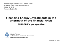 Industrial Project Finance in GCC Countries Forum Federation of GCC Chambers of Commerce October 12, 2010 Dammam, Saudi Arabia Financing Energy Investments in the aftermath of the financial crisis APICORP’s perspective Nicolas Thévenot Arab Petroleum Investments Corporation nthevenot@apicorp-arabia.com October 12, 2010 Outline of the Presentation Arab Petroleum Investments Corporation (APICORP), has been since inception in 1975 a financial institution dedicated to the financing of the development and transformation of the Arab energy industry; APICORP is noticing certain signs of recovery of the energy capital investments in the MENA region; However, APICORP considers that the financing of these investments will be challenging and will require a dramatic shift in the financing strategy of project sponsors. APICORP All Rights Reserved © 2 ARAB PETROLEUM INVESTMENTS CORPORATION (APICORP), A PIONEER IN FINANCING ENERGY INVESTMENTS IN THE ARAB REGION APICORP All Rights Reserved © 3 Mission and Objectives Arab Petroleum Investments Corporation (APICORP) is an inter Arab joint stock company established in 23 November 1975 in accordance with an international agreement between governments of the ten member states of the Organization of Arab Petroleum Exporting Countries (OAPEC). APICORP’s Mission is to contribute to the development and the transformation of the Arab hydrocarbon and energy industries through equity and debt financing, advisory and research. APICORP’s Objectives Priority given to Arab Joint Ventures which benefit OAPEC member states Active throughout the energy value chain Equity participation in new ventures Financial Advisory Arrangement of debt Business conducted on a commercial basis Teams made up of financiers, engineers and economists APICORP All Rights Reserved © 4 Shareholders APICORP is wholly owned by the member states of OAPEC as listed below: SYRIA IRAQ ALGERIA US$ “000” Total assets LIBYA EGYPT 2006 KUWAIT BAHRAIN QATAR UNITED ARAB SAUDI ARABIA EMIRATES 2007 2008 2009 2,600,000 3,573,357 3,563,802 4,119,100 Shareholder’s equity 897,000 1,020,000 894,750 1001,635 Issued and paid-up capital 550,000 550,000 550,000 550,000 APICORP All Rights Reserved © 5 APICORP Rating Foreign currency issuer ratings • A1 (long term) • Prime 1 (short term) • Stable Outlook APICORP All Rights Reserved © 6 Industry Segments Industry Segments Upstream development and production (including rigs) Refining Petrochemicals Fertilizers Natural Gas Liquefaction (NGL) Gas-To-Liquids (GTL) Power Generation Combined Power and Water Production Oil Shipping Oil and Gas Terminals Geotechnical and Seismic Survey Manufacturing Operations and Maintenance Services APICORP All Rights Reserved © 7 APICORP Added Value As Partner in Developing the Hydrocarbon Industry Strong ties throughout the Arab world due to our pan-Arab ownership; Strong technical and advisory capabilities in the hydrocarbon sector with experienced teams of engineers, economists, and financiers; Extensive experience and knowledge in all aspects of project development: Selection of technology suppliers and contractors Product markets Feedstock supply and off-take arrangements Legal issues and documentation related to companies formation Leadership position in investing in hydrocarbon-based projects and in syndicating regional oil and gas financings. APICORP All Rights Reserved © 8 Core Business Structure APICORP Projects Project & Trade Finance Treasury & Capital Markets Direct Equity Investments Project Finance Money Markets Energy Equity Fund Trade Finance Foreign Exchange & Derivatives Technical Support Research Advisory Capital Markets APICORP All Rights Reserved © 9 Direct Equity Investments APICORP All Rights Reserved © 10 Investment Criteria Due consideration shall be given to the geographical diversification of the investments within the Arab world particularly in the member state countries. The size of the Corporation’s equity stake should ensure at least one Board seat in the investee company. The paid up equity capital of the project shall be sufficient to ensure the success of the project. (Opportunity offers a US$ 5 million equity capital injection by APICORP). The targeted internal rate of return (IRR) on investment shall not be less than 15%. The equity part of the project’s financial structure shall not be less than 30% of the total project cost. The financial indicators of the investment opportunity and the associated risks shall be within the industry norms. APICORP All Rights Reserved © 11 Targeted Investment Opportunities New technologies that are economically sound with high growth potential. Opportunities utilizing regional feedstock. Opportunities that enjoy a comparative advantage with high added value. Opportunities that contribute to the support and integration of Arab petroleum industries. Opportunities that offer a substantial financial return in accordance with the Corporation’s investment criteria. APICORP All Rights Reserved © 12 Our Strength Experienced Management Team with a successful record Extensive experience and expertise in both energy and hydrocarbon related investments Strong footprint in the GCC and other Arab countries Excellent working relationships with multilateral institutions and governmental agencies Wide-range network of strong relationships with business groups in the Arab regions, and with international industry partners Proven ability to create deals Strong pipeline of projects Effective combination of academia and industry Professionals with engineering and economics background Enhanced accessibility through offices in Saudi Arabia and Bahrain APICORP All Rights Reserved © 13 Roles and Responsibilities Development Identifying potential investment opportunities Carrying initial assessment Evaluating full feasibility studies Actively participating in establishment of potential investee companies Monitoring Pursuing implementation progress of projects Ac