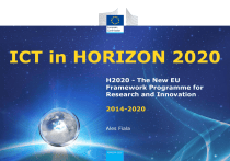 ICT in HORIZON 2020 H2020 - The New EU Framework Programme for Research and Innovation 2014-2020 Ales Fiala What is Horizon 2020 • Initial Commission proposal for a €80 billion research and innovation funding programme (2014-2020); now just over €70 billion • A core part of Europe 2020, Innovation Union & European Research Area: − Responding to the economic crisis to invest in future jobs and growth − Addressing people’s concerns about their livelihoods, safety and environment − Strengthening the EU’s global position in research, innovation and technology What's new • A single programme bringing together three separate programmes/initiatives* • Coupling research to innovation – from research to retail, all forms of innovation • Focus on societal challenges facing EU society, e.g. health, clean energy and transport • Simplified access, for all companies, universities, institutes in all EU countries and beyond ⃰ The 7th Research Framework Programme (FP7), innovation aspects of Competitiveness and Innovation Framework Programme (CIP), EU contribution to the European Institute of Innovation and Technology (EIT) Coverage of the full innovation chain Societal challenges Industrial leadership Excellent science Basic Research Demonstration Technology R&D Prototyping Large scale validation Pilots Market uptake Three priorities 31% 22% Excellent science Industrial leadership Societal challenges + EIT, JRC, Widening, SwfS 8% 39% Priority 1. Excellent science • Why: • World class science is the foundation of tomorrow’s technologies, jobs and wellbeing • Europe needs to develop, attract and retain research talent • Researchers need access to the best infrastructures Proposed funding (€ million, 2014-2020)* European Research Council (ERC) Frontier research by the best individual teams Future and Emerging Technologies Collaborative research to open new fields of innovation 13 095 2 696 Marie Skłodowska-Curie actions (MSCA) Opportunities for training and career development 6 162 Research infrastructures (including e-infrastructure) Ensuring access to world-class facilities 2 488 Priority 2. Industrial leadership • Why: • Strategic investments in key technologies (e.g. advanced manufacturing, micro-electronics) underpin innovation across existing and emerging sectors • Europe needs to attract more private investment in research and innovation • Europe needs more innovative small and medium-sized enterprises (SMEs) to create growth and jobs Proposed funding (€ million, 2014-2020) Leadership in enabling and industrial technologies (LEITs) (ICT, nanotechnologies, materials, biotechnology, manufacturing, space) 13 557 Access to risk finance Leveraging private finance and venture capital for research and innovation Innovation in SMEs Fostering all forms of innovation in all types of SMEs 2 842 616 + complemented by expected 20% of budget of societal challenges + LEITs and 'Access to risk finance' with strong SME focus Priority 3. Societal challenges • Why: • Concerns of citizens and society/EU policy objectives (climate, environment, energy, transport, etc) cannot be achieved without innovation • Breakthrough solutions come from multi-disciplinary collaborations, including social sciences & humanities • Promising solutions need to be tested, demonstrated and scaled up Proposed funding (€ million, 2014-2020) Health, demographic change and wellbeing 7 472 Food security, sustainable agriculture and forestry, marine and maritime and inland water research and the Bioeconomy 3 851 Secure, clean and efficient energy * 5 931 Smart, green and integrated transport 6 339 Climate action, environment, resource efficiency and raw materials 3 081 Inclusive, innovative and reflective societies 1 310 Secure societies 1 695 Science with and for society 462 Spreading excellence and widening participation 816 ⃰ Additional funding for nuclear safety and security from the Euratom Treaty activities (2014-2018) Role of the EIT and JRC in Horizon 2020 Funding (€ million, 2014-2020) European Institute of Innovation & Technology (EIT) Combining research, innovation & training in knowledge and Innovation Communities Joint Research Centre (JRC)* Providing a robust, evidence base for EU policies 2 711 1 903 ⃰ Additional funding for Euratom Treaty activities and non-nuclear research carried out by the JRC Simplification • Single set of simpler and more coherent participation rules • New balance between trust and control, including fewer and better targeted controls and audits • Moving from several funding rates for different beneficiaries and activities to just two • Replacing the four methods to calculate overhead or «indirect costs» with a single flat rate • Major simplification under the forthcoming financial regulation • Successful applicants to get working more quickly: time-to-grant of 8 months; exceptions for the ERC and in duly justified cases Strong participation by SMEs • Integrated approach - around 20% of the total budget for societal challenges and LEITs to go to SMEs • Simplification of particular benefit to SMEs (TTG, single entry point, Fast Track to Innovation,…) • A new SME instrument will be used across all societal challenges as well as for the LEITs • A dedicated activity for research intensive SMEs in 'Innovation in SMEs' • 'Access to risk finance' will have a strong SME focus (debt and equity facility) Socio-economic sciences and humanities (SSH) • Integrated approach: SSH included as an integral part of the activities, working beyond 'silos' (e.g. understanding the determinants of health and optimising the effectiveness of healthcare systems) • The 'Inclusive and reflective societies' challenge: issues such as smart and sustainable growth, social transformations, social innovation and creativity, the position of Europe as a global actor as well as the social dimension of a secure society (SSH have the tools to contribu
