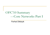 OFC’10 Summary ---Core Networks Part I Ferhat Dikbiyik OFC’10 Technical Sessions on Core Networks OMM: Path Computation and Routing I OMU: Path Computation and Routing II OThP: High Speed Routing OTuG: Network Architecture and Control I OWR: Network Architecture and Control II OWH: Restoration and Protection OTuK: Quantum Communication Symposium II: Networking OWM: Advanced Networking Technologies OWY: Energy Efficiency and Next-Generation Networks OFC’10 Technical Sessions on Core Networks OMM: Path Computation and Routing I OMU: Path Computation and Routing II OThP: High Speed Routing OFC’10 Technical Sessions on Core Networks OTuG: Network Architecture and Control I OWR: Network Architecture and Control II OWH: Restoration and Protection OFC’10 Technical Sessions on Core Networks OTuK: Quantum Communication Symposium II: Networking OWM: Advanced Networking Technologies OWY: Energy Efficiency and Next-Generation Networks NFOEC’10 Technical Sessions on Core Networks NTuA: NThA: NThE: NMD: NWA: NThF: NMB: NTuB: NWC: Network Design Network Restoration Multi-Layer Networks Converged Networks Advanced Network Applications Next Generation Optical Network Technology Migrating to 100G High Speed Network Technologies Network Testing and Characterization Path Computation and Routing I. Code OMM1 OMM2 Title Author/Affiliate An InformationDiffusion-Based Routing Scheme in Wavelength-Routed WDM Mesh Networks The proposition of IDBR Nan Hua et al.; scheme which has fast Tsinghua Univ., convergence time and the low China, bandwidth consumption of China Mobile Res. OSPF-TE while requires lower computational Inst., China complexity as RIP Enhanced Crankback Signaling in MultiDomain Optical Networks Mostafa Ismaeili et al.;. Univ. of New Mexico, USA, Wuhan Univ., China, Oak Ridge Natl. Lab, USA Topic Solution for joint intra/interdomain signaling crankback for multi-domain DWDM lightpath setup. The scheme leverages existing intra/interdomain routing protocol state and provides mechanisms to track signaling failures and limit setup overheads/delays Trends Intelligent Routing Algorithms Path Computation and Routing I. Cont’d. Code Title Author/Affiliate Topic OMM3 Concurrent Processing of Multiple LSP Request Bundles on a PCE in a WDM Network Jawwad Ahmed et al.; Royal Inst. of Technology (KTH), Sweden The proposition of concurrent RWA algorithm for differentiated services to process multiple LSP bundles at PCE Routing and Wavelength Assignment for Transparent Optical Networks with QoT Estimation Inaccuracies Siamak Azodolmolky et al.; Athens Information Technology, Greece, Technical Univ. of Catalonia, Spain how inaccuracies of Quality of Intelligent Transmission (QoT) Routing estimations, caused by Algorithms imperfect models and lack of monitors in transparent optical networks, can be mitigated using a novel routing and wavelength assignment algorithm OMM4 Trends Path Computation and Routing I. Cont’d. Code Title Author/Affiliate OMM5 Xiaolan J. Zhang Opportunity Cost et al.; Analysis of Online Routing Algorithms for Univ. of Illinois at Dynamic Wavelength UrbanaChampaign, USA, Routed Mesh Univ. of Alaska at Networks Anchorage, USA Topic Trends a new cost model to analyze end-to-end online routing algorithms in dynamic wavelength routed mesh networks which leads to the design of simple and efficient routing algorithms with congestion awareness Intelligent Routing Algorithms Path Computation and Routing II. Code Title OMU1 João M. Santos et al.; Heuristic Strategies for Routing 100-GbE Nokia Siemens over OTN in Networks Portugal, Distributed Differential Inst. de Delay Compensation Telecomunicações, Architectures Inst. Superior Técnico A heuristic optimization framework for routing virtually-concatenated 100Gb/s Ethernet over optical transport networks with distributed differential delay compensation Accounting for PMD Temporal Correlation during Lightpath Set up in GMPLSControlled Optical Networks A novel impairment-aware lightpath provisioning scheme for GMPLScontrolled transparent networks, which leverages PMD temporal correlation OMU2 Author/Affiliate Nicola Sambo et al.; Scuola Superiore Sant'Anna, Italy, Technical Univ. of Denmark Topic Trends Intelligent Routing Algorithms Path Computation and Routing II. Cont’d. Code Title Author/Affiliate Topic Bartlomiej OMU3 Distance-Adaptive Spectrum Allocation in Elastic Optical Path Network (SLICE) with Bit per Symbol Adjustment a concept of spectrallyefficient optical networking with distance-adaptive spectral allocation by adjusting the number of modulation levels OMU4 Improved Aggregated Impairment Information for BiDirectional Lightpath Establishments Kozicki et al.; NTT Network Innovation Labs, Japan Annalisa Morea et al.; Bell Labs, AlcatelLucent France Proposition of a set of physical parameters for GMPLS signaling to establish bi-directional paths. This reduces the amount of flooded information and speeds-up the path establishment while keeping its risk of unfeasibility lower than 2% Trends Intelligent Routing Algorithms Path Computation and Routing II. Cont’d. Code OMU5 Title Experimental Demonstration of the Need for Carrier Ethernet in Mission Critical Networks Author/Affiliate Topic Trends Upendra Manyam et al.; Commtel Networks, India , Indian Inst. of Technology, India Comparison of circuit and packet-switched networks in handling delay-sensitive data reveals that the primary Intelligent causes of latency are different Routing in these two networks, and Algorithms both can be mitigated by using Carrier Ethernet in Mission-Critical Networks High Speed Routing Code OThP1 OThP2 Title Author/Affiliate Topic Investigation of Spectral Efficient Modulation Formats for 400Gbit/s/port Optical Packet Switched System Szilárd Zsigmond et al.; Dept. of Telecommunication and Media Informatic, Budapest Univ. of Technology and Economics, Hungary, NICT, Japan Investigation of the performance of NRZ-OOK, NRZ-DPSK, NRZ-DQPSK, NRZ-8PSK a