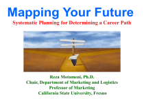 Mapping Your Future Systematic Planning for Determining a Career Path Reza Motameni, Ph.D. Chair, Department of Marketing and Logistics Professor of Marketing California State University, Fresno Knowing Your Capabilities and Preferences 16 Personality and Learning Styles Determining Your personality & Learning Styles Connecting Personality Types to Careers and Jobs Left Brian-Right Brain Domination and its implications Some of the Right-Brain and Left-Brain Career Choices Left Brian-Right Brain Determination Test Sources of Information Regarding Various Careers a Sample Career Plan Recommended Books Concluding Remarks and Answering Your Questions What are the Characteristics of an Ideal Career? 1. Make a lot of Money 2. Be My Own Boss 3. Have No Stress 4. Enjoy My Work Such a career does not exist! 5. Work a Few Hours Per Day It is only a dream! 6. Have a lot of Vacation and Free Time 7. Have Job and Career Security Mapping your Future Systematic Planning for Determining a Career Path Working for Yourself Working for Somebody Else First Working for Somebody Else Then Working for Yourself Mapping your Future Systematic Planning for Determining a Career Path Mapping your Future Systematic Planning for Determining a Career Path Aptitude General Learning Ability Verbal Ability Numerical Ability Artistic and Form Perception Eye-Hand-Finger Coordination Reasoning Math Language Music Physical Capabilities Near Vision Vs. Distance Vision Color Vision Balancing Speaking Mapping your Future Systematic Planning for Determining a Career Path Priorities: Materialist Vs. Spiritualist or both Working Relationship Preferences : Directing & Influencing Vs. Following Seeking Status and Prestige Working With Peer Vs. Working Alone Repetitive Work Vs. Variety Cooperating Vs. Competing Traveling Taking Risks or Avoiding Risks Working Outside Vs. Working Inside Physical Work Vs. Mental Work Physical Environment: Noise Intensity Level Exposure to weather Extreme cold, heat, humidity Radiation, Explosion, Toxic Chemicals Mapping your Future Systematic Planning for Determining a Career Path People: Persuading Entertaining Supervision Instructing Negotiating Mentoring Art and Literature: Fine Arts Graphic Arts Photography’ Dramatics Music Literature and Journalism Mapping your Future Systematic Planning for Determining a Career Path Sciences: Mathematics Astronomy Chemistry Physics Geology & Geophysics Biological and Life Sciences Psychology Manufacturing: Textile Carpets Furniture Automobile Airplanes Boats and Ships Machinery and Heavy Equipment Electrical and Electronic Machinery Mapping your Future Systematic Planning for Determining a Career Path Engineering: Aeronautical Agricultural Architectural Ceramic Chemical Civil Electrical and Electronic Industrial Marine Mechanical Mining & Petroleum Nuclear Surveying Mapping your Future Systematic Planning for Determining a Career Path Social Sciences: Economics Political Science History Sociology Anthropology Mapping your Future Systematic Planning for Determining a Career Path Business Administration: Accounting Finance Insurance Management Marketing Management Information Systems Production Management Mapping your Future Systematic Planning for Determining a Career Path Services: Lodging Beauty and Barbering Funeral & Crematory Theater Services Sport Services Amusement &Recreational Services Physician & Dental ….. Services Legal Services Library & Museum Services Social & Welfare Services Employment Services Spiritual Services Postal Services Transportation Services Communication Services Electric, Gas, Sanitary Services Merchandising Services Wow! How do I makeup my mind ???? Systematic Planning for Determining a Career Path Build & Implement a Career Plan How a person is energized E = Extrovert (Expressive) I = Introvert (Reserved) What a person pays attention to S = Observant (Practical) N = Imaginative Source of information T = Tough-minded (Cool) F = Friendly Life style a person adopts J = Organized (Scheduling) P = Easygoing (Tolerant) E I S N T J ES ES ES ES P TJ TP FJ FP F J Supervisor Promoter Provider Performer S T P J P ENTJ ENTP ENF J E NF P T F J N P Field Marshal Inventor Teacher Champion J IS IS IS IS F P TJ TP FJ FP J Inspector Crafter Protector Composer T P J F P I NT J INTP I NF J INF P J Mastermind Architect Counselor Healer P E I S N T J ES ES ES ES P TJ TP FJ FP F J Supervisor Promoter Provider Performer S T P J P ENTJ ENTP ENF J E NF P T F J N P Field Marshal Inventor Teacher Champion J IS IS IS IS F P TJ TP FJ FP J Inspector Crafter Protector Composer T P J F P I NT J INTP I NF J INF P J Mastermind Architect Counselor Healer P E I S N T J S S S S F P J P J P J Supervisor Promoter Provider Performer S T P J F P J N T P J S S S S F P J P J P J Inspector Crafter Protector Composer T P J F P J P E I S N T J F P J S T P J NT NT NF F F P J N T P Field Marshal Inventor Teacher Champion J F P J T P J NT NT NF NF F P J P Mastermind Architect Counselor Healer SJ Types GUARDIAN (40-45%) Sensing and Judging Epimethean temperament: In Greek mythology Epimetheus means "afterthought" Overview SJ Types are Responsible, Dependable, and Loyal With a firm grasp of reality • Respect for Tradition Security Seeking Formal Relationships Sequential Information Processing (prefer organized, concrete facts & activities). Valuing Contribution to the Common Good (through observance of the rules, rituals, and established norms). Educationally they Go for Commerce and Business Administration. SP Types: ARTISAN (35-40%) Sensing and Perception. Dionysian Temperament: in Greek mythology Dionysus is the Greek god of Desire , Sensation Overview: SP Types Loves Freedom Focusing on the Immediate Situation Seekers of Excitement Fun-loving, Spontaneous, and Adventurers Enjoying Interacting with Others They learn by Experiencing, Doing. Preferring Variety & Sensory Stimulations Educationally they go for arts and crafts and vocationally for techniques. NT Types RATIONAL (5