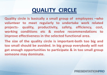 Quality circle is basically a small group of employees –who volunteer to meet regularly to undertake work related projects- quality, productivity, safety, efficiency, cost, working conditions etc & evolve recommendations to improve effectiveness in the selected functional area.