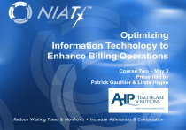 Optimizing Information Technology to Enhance Billing Operations Course Two – May 3 Presented by Patrick Gauthier & Linda Hagen Overview Learning Objectives 1. 2. 3. 4. 5. 6. Health IT Definitions Health IT Vision and Reality Importance of IT Planning Essentials of Implementation Process Re-Design – First, Get Better Basic Self-Assessment & Stages of Change – Get Real 7. Barriers to Change – Get with it! What is the Role of Health IT? How can IT be “Optimized”? Project Any Silver Bullets? We’re in Good Company 2008 Data CPOE – computerized physician order entry PACS –picture archiving and communication system CDO – care delivery organization First…some definitions • HEALTH INFORMATION TECHNOLOGY (HIT) - Information processing using both computer hardware and software for the entry, storage, retrieval, sharing, and use of health care information. Two common components of HIT are electronic medical records and computerized physician order entry. • ELECTRONIC HEALTH RECORD (EHR) - In health informatics, an electronic health record refers to the subset of a patient's electronic medical record (EMR) that is integrated into a larger information network and owned by the patient. In common usage, EHRs and EMRs are used interchangeably to refer to a patient's medical record in digital format. Efforts are underway to develop consensus definitions for these terms and others. • ELECTRONIC MEDICAL RECORD (EMR) - An electronic medical record refers to a patient's legal medical record, stored in digital format. It serves as a repository for clinical data and may have additional capacities such as computerized physician order entry (CPOE) and clinical decision support. Efforts are underway to develop consensus definitions for this term and others. More Definitions • HEALTH INFORMATION EXCHANGE (HIE) - Health information exchange is defined as the mobilization of healthcare information digitally across organizations within a region or community. HIE provides the capability to move clinical information between separate health care information systems while maintaining the meaning of the information being exchanged. • INTEROPERABILITY - The ability of different information technology systems and software applications to communicate, to exchange data accurately, effectively, and consistently, and to use the information that has been exchanged. More Definitions • PERSONAL HEALTH RECORD (PHR) - A PHR is a health record that is "owned" and maintained by an individual patient, rather than by payers or providers. Though the term has been around for several decades, it has recently received renewed attention with the adoption of electronic health records. • REGIONAL HEALTH INFORMATION ORGANIZATION (RHIO) - A RHIO is a multi-stakeholder organization, operating in a specific geographical area, that enables the exchange and use of health information, in a secure manner, for the purpose of promoting the improvement of health quality, safety and efficiency. Officials from the U.S. Department of Health and Human Services see RHIOs as the building blocks for the National Health Information Network (NHIN). When complete the NHIN will provide universal access to electronic health records. More Definitions • NATIONAL HEALTH INFORMATION NETWORK (NHIN) - The technologies, standards, laws, policies, programs and practices that enable health information to be shared among health decision makers, including consumers and patients, to promote improvements in health and health care. The vision for the NHIN is said to have begun in 1991 with the publication of an Institute of Medicine report, "The Computer-Based Patient Record." The path to a national network of health care information is through the successful establishment of regional health information organizations. • OFFICE OF THE NATIONAL COORDINATOR FOR HEALTH INFORMATION TECHNOLOGY (ONC) - Provides counsel to the secretary of the U.S. Department of Health and Human Services and others within the department for the development and nationwide implementation of an interoperable health information technology infrastructure. The ONC also provides management of and logistical support for the American Health Information Community (AHIC). IT Basics – what is EDI? • EDI (Electronic Data Interchange) is a standard format for exchanging business data. The standard is ANSI X12 and it was developed by the Data Interchange Standards Association. • ANSI X12 is either closely coordinated with or is being merged with an international standard, EDIFACT. An EDI message contains a string of data elements, each of which represents a singular fact, such as a price, product model number, and so forth, separated by delimiter. The entire string is called a data segment. One or more data segments framed by a header and trailer form a transaction set, which is the EDI unit of transmission (equivalent to a message). • A transaction set often consists of what would usually be contained in a typical business document or form. • The parties who exchange EDI transmissions are referred to as trading partners. IT Basics – what is EDI? • • • • EDI transactions will significantly reduce administrative and operating costs, gain efficiency in processing time and improve data quality. Under HIPAA, as EDI transactions gradually replace paper-based transactions, the risk of losing documents, encountering delays, and paper chasing is minimized. Trading Partners benefit immensely using EDI as it involves little if any human touch in highly routine process. EDI supports – 837 Health Care Claims – 835 Payment Advice – 270/271 Health Care Benefit Inquiry and Response – 276/277 Claim Status Request and Response – 278 Health Care Services Request for Review Two basic methods are available to generate EDI claims transactions: – Direct Submission by Provider – Submission by Clearinghouse or Billing Service IT Basics – Choosing a Clearinghouse What i
