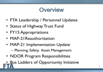 Overview • • • • • FTA Leadership / Personnel Updates Status of Highway Trust Fund FY15 Appropriations MAP-21Reauthorization MAP-21 Implementation Update – Planning, Safety, Asset Management • NDOR Program Responsibilities • Bus Ladders of Opportunity Initiative 1 FTA Leadership & Staff Updates • Changes to Agency Leadership – Deputy Administrator Therese McMillan is leading FTA – Chief Counsel Dorval Carter moved to FTA’s front office • Changes to Region VII Personnel – Mark Bechtel – Team Leader of Planning – John Lynch – Attorney – Paula Schwach – FTA TIFIA Counsel 2 Nebraska’s Accomplishments New Transit Facilities - ARRA • • • • • • • • Dawson County (*now part of Kearney) Kearney North Platte Phelps Ponca Tribe Scott’s Bluff Sidney Webster County 3 Pending Capital Facility Projects Columbus bus storage facility (5311) Saline County bus storage facility (5311) Ogallala bus storage facility (5311) Omaha Crossroads bus transfer center (5309) Creighton University intermodal bus center (5309) Omaha Bus Rapid Transit – Westroads Mall to Downtown – requested FYTIGER 2014 construction funding. • Lincoln - downtown intermodal bus center – Requested FYTIGER 2014 planning funding • • • • • • 4 FTA Rural Funding for Nebraska Available Funds to be Obligated FTA Program FY2014 MAP-21 FY2013 MAP-21 Section 5310 - Small Urban $100,939 $109,079 Section 5310 - Rural $461,067 $463,394 Section 5311 RTAP 5311(b)(3) Section 5317 New Freedom - Rural $7,631,837 $7,555,916 FY2012 $837,429 $6,588,689 $133,610 $132,291 $112,707 NA NA $169,924 5 GAO Study: Public Transportation: Federal Role Key to Rural and Tribal Transit (June 2014) • What GAO Found – Rural transit program funds essential to sustaining transit – Without funds transit service would be reduced or eliminated – FTA training on safety is useful. • Operational and Funding Challenges – Difficult to hire and retain qualified drivers – Hard to secure local or state funds to meet local match requirements. 6 GAO Study: Public Transportation: Federal Role Key to Rural and Tribal Transit 7 Section 5311 Ridership Data (FY2012) REGULAR TRIPS Nebraska 758,705 COORDINATED REVENUE MILES TRIPS 0 3,661,964 REVENUE HOURS 203,405 8 Urban Operating Statistics NTD DATA Omaha Lincoln 178 88 670,153 258,719 Passenger Miles FY 19,065,379 6,146,275 Unlinked Passenger Trips FY 4,356,810 2,254,762 Average Trip Length FY Fares FY 17 $ 4,921,346 12 $ 1,778,390 Operating Expenses FY $ 26,371,544 $ 11,012,583 Average Cost per Trip FY $ 40.00 $ 68.00 Average Fares per Trip FY $ 5.00 $ 6.00 Service Area SQ Miles Service Area Population 9 Moving Ahead for Progress in the 21st Century Act (MAP-21) Signed into law by President Obama on July 6, 2012 Effective as of October 1, 2012 Authorizes programs for two years, through September 30, 2014 FTA busy implementing changes In the meantime, reauthorization under discussion 10 Highway Trust Fund Solvency Source: US DOT, http://www.dot.gov/highway-trust-fund-ticker B a s e d o n c u 11 Mass Transit Account Solvency 12 Highway Trust Fund Solvency 13 MAP-21 Program Implementation MAP-21: Statewide & Nonmetropolitan Transportation Planning Notice of Proposed Rulemaking • • • • Notice of Proposed Rulemaking (NPRM) Comments due September 2, 2014 Make regulations consistent with MAP-21 Highlights: – Public Transit Representation on MPOs in TMAs – New emphasis on the nonmetropolitan transportation planning process and creation of regional transportation planning organizations (RTPO) – Performance Based Planning 15 MAP-21: Statewide & Nonmetropolitan Transportation Planning Notice of Proposed Rulemaking Transit Representation • Transit representation required on MPO Board for areas over 200,000 in population • FTA issued policy guidance spring 2014 • Must be designated by October 1, 2014 • Must have equal decision-making rights and authorities 1616 MAP-21 Performance Management Framework Transit Performance Management • Identifies seven national goals (23 USC 150(b)) • Authorizes Secretary, with input, to establish performance measures and standards for – 8 highway performance areas – 2 transit performance areas • State of Good Repair/Transit Asset Management • Safety • Requires states, MPOs, and public transportation agencies to set targets for each established performance measure 17 MAP-21: Statewide & Nonmetropolitan Transportation Planning Notice of Proposed Rulemaking • Performance-based Approach – State Requirements – To Be Undertaken by NDOR – NDOR establishes performance targets for USDOT transportation system performance measures established under 23 U.S.C. 150(c) and 49 U.S.C. 5326 and 49 U.S.C. 5329 . • NDOR develops targets used to track critical outcomes in State • NDOR coordinates with MPOs and providers of public transportation in rural areas to ensure consistency in selection of performance targets – NDOR integrates rural transit provider performance plans into the statewide transportation planning process • Includes goals, objectives, performance measures, and targets – NDOR considers measures and targets when developing policies, programs, and investment priorities in LRP and STIP • Use to assess performance of transportation system 18 MAP-21: Statewide & Nonmetropolitan Transportation Planning Notice of Proposed Rulemaking • Regional Transportation Planning Organizations (RTPOs) (23 U.S.C. 135(m); 49 U.S.C. 5304(l)) – Optional – State Designation of RTPOs – States may establish and designate RTPOs to enhance statewide planning – States without RTPOs shall cooperate with the affected nonmetropolitan local officials • 25 19 MAP-21: Statewide & Nonmetropolitan Transportation Planning Notice of Proposed Rulemaking • RTPO Requirements: – Must be multi jurisdictional organization of nonmetropolitan local officials and reps of local transportation systems – Establish 