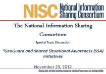 The National Information Sharing Consortium Special Topic Discussion “GeoGuard and Shared Situational Awareness (SSA) Initiatives November 29, 2012 1 Why We’re Here Explore: Shared Situational Awareness (SSA): its concept, initiative requirements, partners involved, and its alignment with the National Preparedness System GeoGuard: its vision, mission, goals, and framework GeoGuard and the NISC: approaches for working together to bolster SSA 2 GeoGuard and SSA Initiatives Lt. Col. Mike Domingue, New Hampshire National Guard Chris Diller, GIS Coordinator, Wisconsin Department of Military Affairs 3 National Guard State GIS Capabilities CHRIS DILLER-WISCONSIN LTC MIKE DOMINGUE-NEW HAMPSHIRE GeoGuard Presentation to NISC - Nov 12 Overview Role of the National Guard. Council of Governors and SSA. GeoGuard. TIGER SSA PAT team. Current Capabilities. 2 GeoGuard Presentation to NISC - Nov 12 Role of the National Guard 3 GeoGuard Presentation to NISC - Nov 12 Mission of the National Guard The state mission is to help civil authorities protect life and property and preserve peace, order, and public safety in times of natural or human-caused emergencies. The federal mission is to provide trained units to the U.S. Army and U.S. Air Force in time of war or national emergency. 4 GeoGuard Presentation to NISC - Nov 12 A Community Based Force Did you know? The Guard is represented in over 3,300 communities. Over 106,000 Airmen. Over 358,000 Soldiers. 1.2 million Family Members. Over 2 million Guard Alumni in the last ¼ century. State National Guard is a state asset not just a federal one. Fall under the Command and Control of the Governor. The National Guard is the oldest organized defense force (1637) State National Guard is Geo-enabling themselves..QUICKLY!!! 5 GeoGuard Presentation to NISC - Nov 12 DoD Title 10 State National Guard State Emergency Management and Response Agencies Inter-Community Mutual Aid Local Communities, First Responders 6 Information Sharing/SSA Severity Frequency DHS/FEMA Info Sharing/SSA Civil-Military Cooperation for Domestic Operations Role of the National Guard GeoGuard Presentation to NISC - Nov 12 National Guard Bureau Functions NGB functions as the channel of communications. Collects and correlates data from the States and provides a common operating picture among the States to the Chief of the National Guard Bureau. Coordinates NG support between States. Ensures trained and ready NG forces are available for domestic and Contingency operations. Operates the National Guard Coordination Center (NGCC). 7 GeoGuard Presentation to NISC - Nov 12 Council of Governors and Shared Situational Awareness WHAT IS SSA? 8 GeoGuard Presentation to NISC - Nov 12 Council of Governors Executive Order created by President Obama in January 2010. CoG is bipartisan and composed of ten State Governors. Co-Chairs from each party. Each will serve a two year term with reappointments possible. 9 GeoGuard Presentation to NISC - Nov 12 Council of Governors Current Members (‘11-’12) include: Gov. Branstad, IA (R) Co-Chair. Gov. Gregoire, WA (D) Co-Chair. Gov. Fortuno, PR (R) . Gov. McDonnell, VA (R). Gov. O’Malley, MD (D). Gov. Perdue, NC (D). Gov. Abercrombie, HI (D). Gov. Nixon, MO (D). Gov. Mead, WY (R). Gov. Brewer, AZ (R). 10 GeoGuard Presentation to NISC - Nov 12 Council of Governors Goals Goal is to provide advice to: Dept. of Defense. Dept. of Homeland Security. US Northern Command. National Guard Bureau. U. S. Cost Guard. White House Staff. And any other federal agency as designated by SECDEF or SECHS. Provide advice on maters of the national guard, homeland defense, civil support, State and Federal Military activities in the US and other matters. First order of business created a Joint Action Plan in August of 2010. 11 GeoGuard Presentation to NISC - Nov 12 Council of Governors Joint Action Plan 1. Dual Status Command – State designee to command over title 10 and title 32 forces. 2. Shared Situational Awareness (SSA) – Ability to geospatially view and interact with events and missions in a SA viewer. 3. Joint Reception, Staging, Onward Movement, and Integration (JRSOI) – Strategic movement of resources in executing state EM plans. 4. Pre-Scripted Mission Assignments – Stafford Act tool to immediately respond to short term and long term requests. 5. Planning – Incorporating military assets into all-hazards planning. 12 GeoGuard Presentation to NISC - Nov 12 A Need for SSA Across the Nation CoG SSA Requirement Establish a Common Operating Picture and Common Reporting System between State and Federal military forces as well as between State and Federal civil and military responders. Share Current Operations Information. Share Capability and Resource Availability Data. “We need a better COP of where the units are located, their level of readiness, and their response capabilities… we will be far better positioned to get life-saving capabilities where they are needed.” - Dr. Paul Stockton, ASD/HD&ASA 13 GeoGuard Presentation to NISC - Nov 12 SSA Vision PPD8: The National Preparedness System Council of Governors / TAG / DOD policy and directives National Response Framework Mission Area 1 Prevention Business Workflow Drivers and Requirements Logistics Aviation / Airlift Transport ation Maintena nce Mission Area 2 Protection Communi cations ESF 1-15 Command and Control Security Medical Engineeri ng CBRNE Mission Area 3 Mitigation GeoGuard GeoConops DHS GeoConops National Preparedness Plan National Preparedness Goal Mission Area 4 Response Delivery Architecture Mission Area 5 Recovery Viewers 14 GeoGuard Presentation to NISC - Nov 12 SSA Demonstration at Patriot 2012 15 GeoGuard Presentation to NISC - Nov 12 SSA Demonstration at Patriot 2012 16 GeoGuard Presentation to NISC - Nov 12 GeoGuard 17 GeoGuard Presentation to NISC - Nov 12 What is GeoGuard? GeoGuard Vision All Army, Air, and Joint Staff National Guard echelons, from the State to NGB, are confidently building, publish