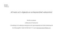 Ronneby 2014-09-11 UF-Blekinge Att leda och vägleda en entreprenöriell verksamhet Per-Ola Jacobson ordförande UF Kalmar län utvecklings-och kvalitetsansvarig grund-och gymnasieskola Karl-Oskar Utbildning AB Kontaktuppgifter: Mobil tel 0760-46 01 91 e-post perola.jacobson@telia.com 1. Introduktion . Att leva i gränslandet mellan företagandets och utbildningsväsendets världar . Plötsligt pratar alla om entreprenörskap och entreprenöriellt lärande . Fusklapp för framtidsfolket - Kairos Future . Reflektion, Skillnader och likheter mellan skolans och näringslivets världar 2. Ledarskap i skola och näringsliv; från LEAD till ett coachande förhållningssätt Varför väljer jag att vara chef? Ett jobb som har oändliga krav och ansvarsuppgifter, omöjligt tillfredsställa alla parter och en grogrund för att skaffa sig ovänner för livet, klämd mellan olika handlingsalternativ och dubbla krav på vem som skall företrädas inom företaget eller organisationen. Min reflektion: Du väljer ett chefsjobb för att du vill göra skillnad för människor och det företag / organisation som du fått förtroendeuppdraget att leda. Som chef vill du göra skillnad. Varför väljer jag att ta ett chefsjobb? Därför att jag vill a) ha möjlighet att påverka, utveckla verksamhet och människor b) ha en plattform för att utveckla mig själv c) komma en bit på väg i karriären d) tjäna mer pengar e) ha roligt, stimuleras av jobbet f) ha en position som bidrar till att göra tillvaron extra meningsfull g) ställas inför utmaningar Chefens huvuduppgifter a) Företräda organisationen gentemot de egna medarbetarna och andra interna och externa intressenter b) Planera-genomföra-följa upp arbetet på företaget / organisationen / enheten - vara lagledare. c) Utveckla verksamheten och människorna på företaget / organisationen / enheten Huvuduppgifter i chefskapet a) Kravet att ställa upp på organisationens mål, normer och kultur b) ... Och därmed företräda företaget c) Kravet att fatta rätt beslut, ofta snabbt d) Kravet att ta hand om ett brett ansvarsområde e) Kravet att klara av många olika relationer f) Kravet att tillsammans med medarbetarna nå din enhets mål g) Kravet att ta initiativ till utveckling http://www.ted.com/talks/steve_jobs_how_to_live_before_you_die.html Permission is granted to copy, distribute and/or modify this document under the terms of the GNU Free Documentation License Att vara chef: utveckla, utvecklas och överleva - en personlig reflektion a) Finna balansen mellan ytterligheter b) Arbete och privatliv- värna familj, fritid och odla dina intressen c) Känslor - att arbeta med människor innebär att arbeta med känslor påkopplade d) Passion och drivkrafter - glöm aldrig det. När är man chef och när är man ledare? Chef - latin caput och betyder ”huvud”. Att vara chef är att ha en befattning, ett organisatoriskt ansvar. En post med formella befogenheter. Leda- fornsvenskt ord som betyder ”föra”. Ledarskapet är något man får som förtroende från sina medarbetare. En ledare får saker och ting att hända, med och genom sina medarbetare. ”Chefskapet handlar om varför uppgifterna skall göras och vad de gäller. Ledarskapet handlar om hur de skall göras. Lite förenklat kan man säga att som chef baserar du din auktoritet på befattningen. Som ledare har du personlig auktoritet, du tillämpar personligt ledarskap.” Definition av personligt ledarskap a) Att kunna formulera mål och göra dem förståeliga och lockande. b) Att vara mindre ordergivare och kontrollant och mer lärare och coach c) Att ändå ha auktoritet, genomslagskraft d) Att kunna kommunicera skickligt - vara både tydlig och lyhörd i kontakten med individer och grupper e) Att entusiasmera, åstadkomma vi-anda, motivation f) Att vara flexibel, dvs snabbt kunna ställa om sig och reagera i nya och oväntade situationer Självkännedom - en förutsättning för framgångsrikt ledarskap Känn dig själv - grunden för ett moget, tryggt och framgångsrikt ledarskap Med en bättre självkännedom har du större möjlighet att tillägna dig detta mer stabila och mogna sätt att agera. Att känna sig själv ger självförtroende att ha en egen uppfattning och våga stå för den. a) Att lära mer om och förstå sig själv gör också att man vågar respektera de sidor hos sig som man inte är riktigt nöjd med. b) Att vara lyhörd för hur man uppfattas av andra kan ge mycket värdefull självkännedom. Ett hjälpmedel för självkännedom Ett verktyg för att öka den egna kännedomen om hur man egentligen fungerar i situationer där man skall påverka, leda och utveckla människor är det som sammanfattas inom den sk LEAD-Modellen. Fram träder fyra ledarskapsstilar som alla behövs i det personliga situationsanpassade ledarskapet: L = Lyssna-stilen E = Entusiasmera-stilen A = Argumentera-stilen D = Dirigera-stilen Den amerikanske ledarskapsforskaren Warren Bennis pekar på fyra strategier för ett framgångsrikt ledarskap Första strategin Ledaren stark inre övertygelse ger uppmärksamhet och sätter ledarens visioner i fokus. Medarbetarna får kraft och självförtroende inför sina uppgifter genom ledarens smittande glöd och utstrålning. Andra strategin Ledaren har förmåga att kommunicera - förmedla sina visioner och därigenom övertyga medarbetarna om meningsfullhet i sitt budskap/kommunikation. Tredje strategin Ledarens beslutsamhet och kraftfulla ställningstaganden inger medarbetarna förtroende för visionerna, vilket är en nödvändighet för att de skall realiseras i praktiken. Fjärde strategin Ledarens insikt om sina starka och svaga sidor samt en realistisk och god självuppfattning innebär att ledaren förmår att tillämpa en positiv människosyn och därmed förmedlar en god förebild. Bennis tio ledstjärnor för ett framgångsrikt ledarskap 1. Söka möjligheter 2. Experimentera och ta risker 3. Beskriv framtiden 4. Engagera andra och f