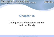 Maternal-Child Nursing Care Optimizing Outcomes for Mothers, Children, & Families Susan Ward Shelton Hisley Chapter 15 Caring for the Postpartum Woman and Her Family Fourth Trimester Begins immediately after childbirth Puerperium—first 6 weeks after birth Close observation—identify hemorrhage and complications during first critical hour Ongoing education and support Safety for Mother and Infant Key Patient Safety Concerns: Prevent infant abductions Check ID bands Educate mother about safety measures #1 risk on postpartum is Falls Postpartum Psychological Adaptation Reva Rubin Taking in: Mom wants to talk about her experience of labor & birth, preoccupied with her own needs Taking hold: More ready to resume control of her body, baby & taking on mothering role. Needs reassurance if inexperienced. Letting-go: by 5th week, total abandon to NB Bonding: en face position, engrossement. Encourage through early interaction & breastfeeding (within 1/2 hr of birth is best). Maternal Responses to Newborn Reva Rubin Touch- progresses from fingertips → palming →cuddling → Voice- high-pitched & babies respond Odor- mom’s respond to baby’s unique smell Eye contact- en face position delay eye ointment & bright lights Nurse role- be able to answer ? About baby Postpartum/baby blues: Blues vs Depression transient depression in first few days: weepiness mood swings anorexia difficulty sleeping feeling of letdown Postpartum Depression *If persists past 2 weeks, or worsens Symptoms: very sad feelings hopeless worthless anxiety trouble caring for and bonding with your baby Have trouble sleeping. Not be able to concentrate. Not feel hungry and may lose weight. (But some women feel more hungry and gain weight) Postpartum Psychosis Onset within first 8 weeks after childbirth Distinguishing signs: hallucinations, agitation, confusion, suicidal/homicidal thoughts, delusions, sleep disturbances, loss of touch with reality Requires hospitalization & treatment Postpartum Nursing for Vulnerable Populations Victims of abuse History of depression/ mental illness Special needs population- support Adolescents- Teen support groups Undocumented immigrants Limited Access to care/homelessness Endocrine Adaptations Hormones: -drop after delivery of placenta. hCG & hPL gone by 24 hours Estrogen & progesterone drop within 1 wk FSH remains low for 12 days, then rises to begin new cycle Sex is ok once lochia is alba. Menstrual period in 6-10 wks. Contraception necessary. Early Maternal Assessment Vital signs Fundus Immediate postpartum—halfway between the symphysis pubis and the umbilicus 1 hour postpartum—level of the umbilicus or one fingerbreadth above Then, descends one fingerbreadth each day Lochia Rubra, serosa, alba Postpartum Assessment Guide BUBBLE-HE Breasts Uterus Bladder Bowel Lochia Episiotomy Homan’s sign Emotions & bonding Afterpains Occur during process of involution Assess pain More pronounced in multipara Nursing care Explain cause Prone position with abdominal pillow Sitz baths Encourage ambulation Administer mild analgesics Cardiovascular System Delivery of the baby, expulsion of the placenta, and loss of amniotic fluid can create cardiovascular instability Cardiac output remains elevated Physiological diuresis Hematological System Decrease in blood volume Blood loss Diuresis White blood count increased x 5 to 6 days Fibrinogen increased Returns to normal by third to fourth week Deep Vein Thrombosis Homans’ sign Clinical assessment Erythema, unequal calf circumference, heat Clinical signs are NOT reliable Hormonal Levels Estrogen and progesterone decrease Anterior pituitary—prolactin Placental lactogen, cortisol, growth hormone, and insulinase levels decrease Insulin needs decrease—“Honeymoon phase” Neurological System Altered sleep patterns—maternal fatigue Numbness in legs, dizziness Safety for infant and mother Headaches Assess quality and location, and carefully monitor vital signs Implement environmental interventions Immune System Rho (D) immune globulin (RhoGAM) Rubella vaccination Nonimmune status Signed consent form Avoid pregnancy for 1 month Flu-type symptoms may occur Menstruation & Ovulation Nonlactating women Menstruation returns in 6 to 8 weeks First cycle may be anovulatory Lactating women Delayed ovulation and menstruation Educate—ovulation can precede menstruation, need contraception Gastrointestinal System Decreased gastric motility Decreased muscle tone in abdominal wall Constipation Stool softeners Musculoskeletal System Laxity of pelvic joints and ligaments Relaxation of soft tissues Muscle fatigue Body aches Rectus abdominis diastasis Correct posture Modified sit-ups Postpartum Complications Postpartum Hemorrhage CAUSES: Uterine atony, lacerations, retained placental fragments Risk factors: ↑ uterine distension: multiples, polyhydramnios, macrosomia, fibroids Trauma: rapid or operative birth Placental problems: previa, accreta, abruptio, retained placental fragments Atonic uterus: prolonged pitocin, magnesium sulfate or labor; ↑ maternal age or parity; uterine scar; chorioamnionitis; anemia; prior history Inadequate blood coagulation: fetal death or DIC Hemorrhage Interventions: Fundal massage, ensure bladder emptying. If uterus is firm but bleeding persists, suspect laceration. Administer oxtocics (pitocin, methergine, hemabate, prostaglandins), blood replacement. Frequent assessment of bleeding, vital signs. MD: Bimanual massage, manual exploration of uterus, uterine packing, D & C, hysterectomy. Postpartum Hemorrhage Definition Accurately estimating blood loss Hypovolemic shock DIC Early vs. late LARRY 4 “T’s” Postpartum Hemorrhage Uterine atony Hallmark—soft uterus filled with clots and blood Genital tract trauma- lacerations Uterus firm Tissue trauma- hematoma Thrombin Postpartum Hemorrhage Late postpartum hemorrhage Retained placental fragments Ergonovine medication- Methergine antibiotics possible D&C Collaborative Management Frequent vi