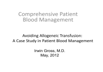 Comprehensive Patient Blood Management Avoiding Allogeneic Transfusion: A Case Study in Patient Blood Management Irwin Gross, M.D. May, 2012 Disclosures Irwin Gross, MD • Medical Advisory Board, Strategic Healthcare Group Learning Objectives • Name the three pillars of patient blood management • Name three adverse outcomes associated with transfusion • List four tools that can be used in patient blood management to limit the risk of transfusion • Describe the role of parenteral iron in treating anemia • Name two types of perioperative autologous blood collection • List two relative contraindications to cell salvage What is Patient Blood Management: The Three Pillars Optimize erythropoieis Minimize bleeding & blood loss © Axel Hofmann/Shannon Farmer – SHEF Meeting Perth August 2010 Harness & optimize physiologic tolerance of anemia Anemia independently associated with increased: • morbidity 5-75% incidence in patients presenting • hospital length of stay for elective surgery • likelihood of transfusion Shander 2004 Anemia • mortality Spahn DR. Anesthesiology 2010; 113(2) 1-14 Beattie WS, et al Anesthesiology 2009; 110(3) 574-81 Dunne JR, et al J Surg Res 2002; 102: 237-44 Shander A. Am J Med 2004; 116(7A) 58S-69S Bleeding associated with increased • Morbidity • ICU and hospital length of stay • Mortality Procedural • Elective surgery ~0.1% bood loss & Bleeding • Subgroups: • Vascularbleeding 5–8% • Up to 20% with severe bleeding • Major organ damage 30–40% Causes • On average 75 – 90% local surgical interruption or vessel interruption • 10–25% acquired or congenital coagulopathy Shander A. Surgery 2007 RBC transfusion independently associated in a dose-dependent relationship with increased: •Morbidity •ICU and hospital length of stay •Mortality Transfusion Beattie WA, et al Anesthesiology 2009 Murphy GJ, et al Circulation 2007 Salim A, et al J Am Coll Surg 2008 Bernard AC, et al J Am Coll Surg 2008 Hearnshaw SA, et al Aliment Pharmacol Ther 2010 Blair SD, et al Br J Surg 1986 Impact of Transfusion on Patient Outcomes Author (year) Koch et al (2005) Murphy et al (2007) Surgenor et al (2009) Pedersen et al (2009) Nikolsky et al (2009) van Straten et al (2010) D’Ayala et al (2010) O’Keeffe et al (2010) Veenith et al (2010) Population Cardiac surgery n Impact of Blood Transfusion 11,963 - Higher postop mortality rate - Higher postop morbidity rate (RF, prolonged ventilatory support, serious infection, cardiac complications, & neurologic events) Cardiac surgery 8,598 - Higher mortality rate - More ischemic complications - More infectious complications Cardiac surgery 3,254 - Decreased survival after cardiac surgery Total hip 4,508 - Higher mortality rate replacement - More pneumonia PCI after MI 2,060 - Higher 30-day and 1-year mortality rate Cardiac surgery 10,435 - Worse early survival Lower extremity 300 - More postop adverse events amputation - Longer ICU/hospital stay Lower extremity 8,799 - Higher mortality rate revascularization - More pulmonary complications - More infectious complications Elderly undergoing 874 - Higher mortality rate cardiac surgery - Longer ICU/hospital stay Physiologic Impact of Red Cell Transfusion Author (year) Population Babineau et Postoperative al (1992) Silverman et Septic shock 21–88 yrs al (1992) Marik et al Septic adults (1993) Lorente et al Septic adults (1993) Gramm et al Septic shock 46 ± 3 yrs (1996) Casutt et al Postoperative 32–81 yrs (1999) Fernandes et Septic shock 18–80 yrs al (2001) Walsh et al Euvolemic anemic critically ill (2004) patients Suttner et al Volume-res mechanically (2004) ventilated patients Mazza et al SIRS/Sepsis (2005) n Blood Transfused ↑Hb ↑DO2 ↑VO2 ↓Lactate 31 328 ± 9 mL Yes Yes No No 21 2 units Yes Yes No No 23 3 units Yes Yes No No 16 2 units Yes Yes No ? 19 2 units Yes No No ? 67 368 ± 10 mL Yes Yes No ? 10 1 units Yes No No No 22 2 units Yes ? ? No 51 1 or 2 units vs. 100% FIO2 1–3 units Yes Yes No ? Yes ? ? No 29 What are “Transfusion Alternatives”? • • • • • Optimize hemodynamics and oxygenation Physiologic tolerance of anemia Use of erythropoietic stimulating agents Use of intravenous iron Minimizing blood loss – Manage coagulopathy – Anti-fibrinolytics – Perioperative cell collection and reinfusion Our Patient • A 68 year old retired immunology professor requires revision of a prior right hip arthroplasty due to aseptic loosening with severe instability and functional limitation • Past medical history is significant for rheumatoid arthritis and Type 1 vWD • Patient underwent a recent hemicolectomy for T1N0M0 (Stage 1) colon cancer at another hospital without a blood management program Our Patient • The patient is referred to an orthopedic surgeon • A total hip arthroplasty is planned • The patient, having read the article summarized on the next slide, requests that transfusion of allogeneic blood be avoided unless surgical bleeding is life threatening Influence of Transfusion on Colorectal Cancer Recurrence • Cochrane meta-analysis involving 12,127 patients • Evaluated role of transfusion in colorectal cancer recurrence • Overall OR for recurrence was 1.41 (95% CI 1.20-1.67) in transfused patients Amato, A, et al. Cochrane Database System Rev 2006;(1): CD005033 Reasons to Avoid Transfusion • Transfusion is associated with: – – – – Increased perioperative infections Increased length of stay Increased short term mortality Transfusion reactions, some life threatening – Increased incidence of cancer recurrence and decreased disease-free and long term survival Pre-operative Screening for Anemia • The patient should be screened for anemia -he is undergoing surgery with significant blood loss – CBC – If CBC shows anemia (< 13 g/dL) then additional lab tests required • Iron, iron binding capacity, ferritin, Vitamin B12, creatinine, reticulocyte count • Folate if MCV > 100 fl Scheduling 