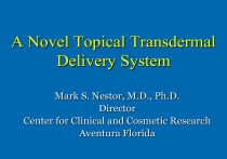 A Novel Topical Transdermal Delivery System Mark S. Nestor, M.D., Ph.D. Director Center for Clinical and Cosmetic Research Aventura Florida Topical Drug and Cosmetic Delivery The skin is a formidable barrier against environmental assaults as well as topical drug delivery A variety of active compounds have significant activity in the skin, subcutaneous tissue or muscle but cannot adequately permeate the intact skin Diseases such as acne, psoriasis, rosacea, and melasma as well as cutaneous aesthetic enhancement could dramatically benefit from our ability to better transport active compounds to target tissue Solutions to a 100+ billion dollar market Ionic Nano Particle Technology (InParT) is a novel and unique passive delivery system that can be utilized to assist the transport of a variety of active compounds to target sites in the skin and beyond InParT Drug Delivery System Ionic Nano Particle Technology I Novel, commercially viable trans dermal non-invasive drug delivery technology that enables delivery and absorption of active compounds through the stratum corneum and throughout the skin and sub cutaneous tissue without any cutaneous toxicity InParT Drug Delivery System Ionic Nano Particle Technology II Nano particles are made from combinations of micelles (surfactants and protein solubilizers), coated with lipid molecules Nano paticles size; less than 1-10 nano meters smaller than the skin pores Nano Particles Physically entraps active without any changes in the chemical composition Stabilizes the actives: shelf stable at room temperature for extended period of time without refrigeration) Uses all FDA approved ingredients InParT Drug Delivery System Ionic Nano Particle Technology III INParT technology is highly adaptable to most high molecular weight drugs, proteins, peptides and insoluble hydrophobic molecules Capable of delivering more than one therapeutic agent at a time Offers high market value by featuring maximum functionality at minimum system complexity and cost The technology is easily scalable to any size without any complex new equipments need (no capital expenditure, commercially viable) SEM-Photograph- 250x SEM-Photograph- 1000x InParT Drug Delivery System Clinical Investigation Topical Hyaluronic Acid Topical Lidocaine Acne Benzoyl Peroxide (BP) Topical Botulinum Neurotoxin Type A (BoNTA) Rhytids Hyperhidrosis Future Developments and Partnerships Topical Hyaluronic Acid (HA) InParT Drug Delivery System Topical Hyaluronic Acid (HA) HA crosslinked or non crosslinked difficult to adequately penetrate the stratum corneum If adequate penetration can be achieved topical cross linked HA can significantly improve fine lines as well as skin texture Painless application Companion treatment to injectable crosslinked HA Topical cosmecutical Topical Hyaluronic Acid (HA) Clinical Model The stabilized cream is applied topically onto the skin containing crosslinked (non crosslinked) HA The nano-spheres helps penetrate the skin layers with the aid of absorption enhancers and releases the HA into the deep layers of the skin HA incorporated into the dermis (rapid aesthetic benefit) and induces long term collagen synthesis A Double Blind Vehicle Controlled Trial to Investigate the efficacy and tolerance of Transdermal CL1 (Restylane) versus non-CL1 (Non Crossed Linked HA) in the appearance of photodamaged skin Topical Hyaluronic Acid (HA) Clinical Trial I 100 subjects 2 sites: Women 35 – 65 with moderate to severe photodamage: 40 CL1 (crosslinked HA – Restylane), 40 NCL1 (Non crossed linked HA), 20 Vehicle 2 US sites Subjects and investigators blinded 2 week wash out, 12 week trail (evaluations 2,6 and 12 weeks), 4 week post treatment (washout) Apply twice a day clean face . Topical Hyaluronic Acid (HA) Clinical Trial II Visia camera system Objective evaluations Goldman-Rao” photographic scale in 5 grades Evaluation of skin roughness, skin hydration, skin radiance, smoothing effect, overall efficacy and tolerance Subjective Questionnaires : Product Qualities . Subjective improvement Topical Hyaluronic Acid (HA) Clinical Trial - Washout Evaluation of sustained effect of topical HA Patient discontinued all Topicals at day 90 and were evaluated for sustained effects at day 120 Visia photographs Clinical evaluations . Trial Data Blinded Investigator Assessments Clinical Evaluation: Skin Roughness Clinical Evaluation: Skin Roughness 3 2.8* 2.6* 2.5 2.4+ 2.3+ 2 2 1.8 1.7 1.7 1.6 1.5 1.3 1.5 1.4 1.3 1.1 1 day 0 day 15 day 45 CL1 CL1: Crosslinked HA (Restylane) NCL1 NCL1: Non Crosslinked HA day 90 Control day 120 * CL1 vs Control at .001 +NCL1 vs Control at .001 Control: Nano Technology Vehicle Clinical Evaluation: Skin Roughness Clinical Evaluation: Skin Roughness (% Rated Smooth & Very Smooth) 87.2 90 80 61.6 55 60 55.4 50 41 41 35 40 30 88+ 85.1 71.1 70 50 100* 95.9* 100 35 20 20 10 0 % Day 0 % Day 15 % Day 45 Cl1 NCl1 CL1: Crosslinked HA (Restylane) NCL1: Non Crosslinked HA % Day 90 Control %Day 120 *CL1 Vs Control at .001 +*NCL1 vs Control at .001 Control: Nano Technology Vehicle Clinical Evaluation: Skin Hydration Clinical Evaluation: Skin Hydration 2.5 2.5* 2.4* 2.2 2.1 2 1.9 1.9 1.9*/+ 1.9 1.8 2.4 1.5 1 1.5 1.4 1 day 0 1.5 day 15 day 45 CL1 NCL1 CL1: Crosslinked HA (Restylane) NCL1: Non Crosslinked HA day 90 Control day 120 *CL1 vs Control at .001 +NCL1 vs Control Control: Nano Technology Vehicle Clinical Evaluation: Skin Hydration Clinical Evaluation: Skin Hydration (% Rated Hydrated or Very Hydrated) 94.9* 100 87.2* 90 100* 97.4* 89.5+ 86.8+ 86.6+ 80 65.4 70 60 60 52.4 45 50 35 40 30 20 10 15.4 15 5 0 % Day 0 % Day 15 % Day 45 Cl1 NCl1 CL1: Crosslinked HA (Restylane) NCL1: Non Crosslinked HA % Day 90 Control %Day 120 *CL1 vs NCL1 & Control at .001 +NCL1 vs Control at .001 Control: Nano Technology Vehicle Clinical Evaluation: Skin Elasticity Clinical Evaluation: Skin Elasticity 5 4.7* 4.6* 4.5 4.3 4.1 4 4 4 3.9 4 3.8 3.7 3.5 3.5 3.5 3.4 3.4 3.3 3 day 0 day 15 day 45 CL1 NCL1 CL1: Cro