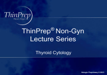 ® ThinPrep Non-Gyn Lecture Series Thyroid Cytology Hologic Proprietary © 2013 Benefits of ® ThinPrep Technology The use of ThinPrep Non-Gyn for Fine Needle Aspiration specimens from the Thyroid: • Optimizes cell preservation • Standardizes specimen preparation • Simplifies slide screening • Minimize number of slides per patient • Offers the versatility to perform ancillary testing Hologic Proprietary © 2013 Required Materials • ThinPrep® 2000 Processor or ThinPrep 5000 Processor • ThinPrep Microscope Slides • ThinPrep Non-Gyn Filters (Blue) • Multi-Mix™ Racked Vortexor • CytoLyt® and PreservCyt® Solutions Hologic Proprietary © 2013 Required Materials • • • • • • 50 ml capacity swing arm centrifuge 50 ml centrifuge tubes Slide staining system and reagents 1 ml plastic transfer pipettes 95% alcohol Coverslips and mounting media Optional: Glacial acetic acid, DTT and saline for troubleshooting Hologic Proprietary © 2013 Recommended Collection Media • CytoLyt® • Balanced electrolyte solutions; such as -Plasma-Lyte® -Polysol® Hologic Proprietary © 2013 Non-Recommended Collection Media • Sacomanno and other solutions containing carbowax • Alcohol • Mucollexx® • Culture Media, RPMI Solution • PBS • Solutions containing formalin Hologic Proprietary © 2013 Hologic® Solutions • CytoLyt® • PreservCyt® Copyright © 2012 Hologic, All rights reserved. Copyright © 2013Hologic, All rights reserved. Hologic Proprietary © 2013 Hologic® Solutions CytoLyt® Solution • Methanol-based, buffered preservative solution - Lyses red blood cells - Prevents protein precipitation - Dissolves mucus - Preserves morphology for 8 days at room temperature • Intended as transport medium • Used in specimen preparation prior to processing Hologic Proprietary © 2013 Hologic® Solutions PreservCyt® Solution • Methanol based, buffered solution • Specimens must be added to PreservCyt Solution prior to processing • PreservCyt Solution cannot be substituted with any other reagents • Cells in PreservCyt Solution are preserved for up to 3 weeks in a temperature range between 4°-37°C Hologic Proprietary © 2013 FNA Biopsy • Performed by a cytopathologist or clinician. • A 23 gauge or 25 gauge needle with a 10ml syringe is used • After the area is cleaned with 95% ethanol, the nodule is palpated and held in place with the index and middle fingers • The needle is passed thru the skin and into the nodule. Several strokes are made with or without vacuum created by the syringe plunger Hologic Proprietary © 2013 Sample Collection • Optimal: Deposit and rinse the entire sample into a centrifuge tube containing 30 ml of CytoLyt® solution • Secondary method: Collect into a balanced electrolyte solution, such as Polysol® or PlasmaLyte® injection solutions • If direct or air dried slides are desired, prepare prior to rinsing the needle Note: If possible, flush the needle and syringe with a sterile anticoagulant solution prior to aspirating the sample. Some anticoagulants may interfere with other cell processing techniques, so use caution if you plan to use the specimen for other testing. Hologic Proprietary © 2013 Sample Preparation 1. 2. 3. 4. 5. 6. 7. 8. Collection Concentrate by centrifugation - 600g for 10 minutes Pour off supernatant and vortex to re-suspend cell pellet Evaluate cell pellet • If cell pellet is not free of blood, add 30 ml of CytoLyt® Solution to cell pellet and repeat from step 2 Add recommended # of drops of specimen to PreservCyt® Solution Vial Allow to stand for 15 minutes Run on ThinPrep® 2000 Processor using Sequence 3 or ThinPrep 5000 using Sequence Non-Gyn Fix, Stain, and Evaluate Hologic Proprietary © 2013 Sample Preparation Techniques • Centrifugation - 600g for 10 minutes or 1200g for 5 minutes - Concentrates the cellular material in order to separate the cellular components from the supernatant Refer to Centrifuge Speed Chart in the ThinPrep® 2000 or ThinPrep 5000 Processor Manual, Non-Gynecologic section, to determine the correct speed for your centrifuge to obtain force of 600g or 1200g Hologic Proprietary © 2013 Sample Preparation Techniques • Pour off supernatant - Invert the centrifuge tube 180° in one smooth movement, pour off all supernatant and return tube to its original position (Note: Failure to completely pour off the supernatant may result in a sparsely cellular sample due to dilution of the cell pellet). Hologic Proprietary © 2013 Sample Preparation Techniques • Vortex to re-suspend cell pellet - Randomizes the cell pellet and improves the results of the CytoLyt® solution washing procedure - Place the centrifuge tube onto a vortexor and agitate the cell pellet for 3 seconds or vortex manually by syringing the pellet back and forth with a plastic pipette Hologic Proprietary © 2013 Sample Preparation Techniques • CytoLyt® Solution Wash - Preserve cellular morphology while lysing red blood cells, dissolving mucus and reducing protein precipitation - Add 30 ml of CytoLyt Solution to cell pellet, concentrate by centrifugation, pour off the supernatant and vortex to resuspend the cell pellet Hologic Proprietary © 2013 Sample Preparation Techniques • Evaluate cell pellet - If cell pellet is white, pale pink, tan or not visible add specimen to PreservCyt® Solution vial (# of drops added is dependant on sample volume and will be discussed on future slides) - If cell pellet is distinctly red or brown indicating the presence of blood conduct a CytoLyt® wash Hologic Proprietary © 2013 Sample Preparation Techniques • Calculate how many drops of specimen to add to PreservCyt® vial: - If pellet is clearly visible and the pellet volume is ≤ 1ml (if not consider the next 2 slides) • Vortex pellet and transfer 2 drops to a fresh PreservCyt Solution vial Hologic Proprietary © 2013 Sample Preparation Techniques • Calculate how many drops of specimen to add to PreservCyt®