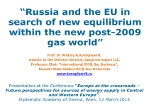 “Russia and the EU in search of new equilibrium within the new post-2009 gas world” Prof. Dr. Andrey A.Konoplyanik, Advisor to the Director General, Gazprom export LLC, Professor, Chair “International Oil & Gas Business”, Russian State Gubkin Oil & Gas University www.konoplyanik.ru Presentation at the Conference “Europe at the crossroads – Future perspectives for sources of energy supply in Central and Western Europe”, Diplomatic Academy of Vienna, Wien, 12 March 2014 Disclaimer • Views expressed in this presentation do not necessarily reflect (may/should reflect) and/or coincide (may/should be consistent) with official position of Gazprom Group (incl. Gazprom JSC and/or Gazprom export LLC), its stockholders and/or its/their affiliated persons, and are within full personal responsibility of the author of this presentation. A.Konoplyanik, Vienna Diplomatic Academy, 12.03.2014 2 Table of contents 1) “New post-2009 gas world” & its material & perceived “new realities” in Europe 2) EU respond to new realities: diversification 3) Ukraine respond to new realities: diversification 4) Russia’s respond to new realities: diversification 5) New pipelines: “pipes of peace” or “tug of war”? 6) New pipelines by-passing UA vs modernization of UA GTS: comparative economics A.Konoplyanik, Vienna Diplomatic Academy, 12.03.2014 3 New post-2009 gas world & its European dimension 1) Oversupply due to: a) Demand-side => market niche for gas narrowed: i. ii. overall decline = economic crisis + energy efficiency gas substitution = subsidized RES vs (oil-indexed) gas + cheap US imported coal (US shale gas domino effect #2) vs (oil-indexed) gas b) Supply-side => competition within this narrowed market niche increases: i. Qatari “garbage gas” to EU prior to Fukushima (US shale gas domino effect #1) 2) Institutional => 3rd EU Energy Package => concurrent with EU oversupply situation which triggered liberalization (upside-down gas reforms) 3) Political => RF-UA gas transit crises => consequences for EU/Ukraine/Russia 4 A.Konoplyanik, Vienna Diplomatic Academy, 12.03.2014 Russia-EU-Ukraine’s new circumstances: 22 days vs. 40+ years => RF-UA vs RF-EU • Ukraine as integral element of Russia-EU gas supply chain => • “Matrix effects” & “Domino effects” of Russia-UA Jan’06/09 gas crises for Russia-EU gas relations/supply chain: – 22 days of interruptions of Russian gas supplies to the EU via Ukraine = 3 days in Jan’2006 + 19 days in Jan’2009: – has overbalanced previous 40+ years (since 1968) of stable & noninterruptible supplies => – has changed perceptions within all three parties on stability & noninterruptible character of future gas supply through this chain => each party has its own vision & answers & lines of actions • New perceptions as starting points for objective “domino effects”: – political statements & decisions => legal documents => investment decisions aimed at new perceived equilibrium to be reached – when investments are made, ‘no return’ points are passed through • “No return” points for each party => What are they? Whether they are reached/ passed through already? A.Konoplyanik, Vienna Diplomatic Academy, 12.03.2014 EU-Ukraine-Russia: in search for new post-2009 equilibrium with different aims & responds & lines of actions • EU: to diminish dominant role of Russia as major gas supplier • Ukraine: to escape monopoly of Russia as one single gas supplier • Russia: to escape monopoly of Ukraine as one dominant gas transit route • The aims seems to be totally different (are they?) => to find new equilibrium within multidirectional individually enforced changes • Narrowing corridor for new equilibrium – but it is still there => a long & winding road to new compromise… (if a goodwill is there) A.Konoplyanik, Vienna Diplomatic Academy, 12.03.2014 Table of contents 1) “New post-2009 gas world” & its material & perceived “new realities” in Europe 2) EU respond to new realities: diversification 3) Ukraine respond to new realities: diversification 4) Russia’s respond to new realities: diversification 5) New pipelines: “pipes of peace” or “tug of war”? 6) New pipelines by-passing UA vs modernization of UA GTS: comparative economics A.Konoplyanik, Vienna Diplomatic Academy, 12.03.2014 New risks, new challenges, new responds, “no return” points: the EU (1) • Perception: as if non-reliable future supplies from Russia via Ukraine to EU => • Responds: organization of new internal EU gas market architecture with multiple supplies & (high) flexibility • Multiple supplies by: – Alternatives to Russian gas (supply side): SOS Directive (3 gas supply sources/MS, etc.), LNG, shale gas, UGS => to diminish dominant role of Russia as major supplier – Alternatives to (RUS) gas (demand side): climate change => decarbonization => RES, energy efficiency => shrinking gas share in fuel mix => the loser would be a less competitive gas supplier (perception: most distant & costly in production & oil-indexed-priced Russian gas ?) A.Konoplyanik, Vienna Diplomatic Academy, 12.03.2014 8 New risks, new challenges, new responds, “no return” points: the EU (2) • (High) flexibility by: – Diminishing barriers for gas flows: CMP rules (UIOLI, SoP), interconnectors, reverse flows, spot trade, demand for softening LTGEC provisions (TOP), …, new market organization => Third Energy Package • Third Energy Package (03.09.2009 => 03.03.2011): – Set of legal instruments providing multiple supplies & flexibility within EU (28) & Energy Community Treaty (28+9) area based on new principles of internal market organization – from a chain of 3 consecutive LTCs (1968-2009) – to Entry-Exit zones with Virtual Trading Points (hubs) (2009-onwards) – New architecture of EU gas market under development => Gas Target Model + 12 Framework Guidelines + 12 Network Codes + … • => “No return” point has been passed by EU