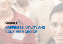 Chapter 5 HAPPINESS, UTILITY AND CONSUMER CHOICE © 2013 Cengage Learning Gottheil — Principles of Economics, 7e 1 Economic Principles Happiness Total utility and marginal utility Law of diminishing marginal utility Relationship between the law of demand and the marginal-utility-to-price ratio Consumer surplus Producer surplus Difficulties with interpersonal comparison of utility © 2013 Cengage Learning Gottheil — Principles of Economics, 7e 2 Happiness and Utility Economists measure happiness by creating the concept of the util. Util • It is a hypothetical unit used to measure how much utility a person obtains from consuming a good. © 2013 Cengage Learning Gottheil — Principles of Economics, 7e 3 Happiness and Utility Utility measures the satisfaction or enjoyment a person obtains from consuming a good. © 2013 Cengage Learning Gottheil — Principles of Economics, 7e 4 Happiness and Utility The implication of someone experiencing increasing marginal utility for pizza slices is: • When his stomach is full to bursting from eating so much pizza, the marginal utility from eating yet another slice would be higher than for any of the preceding slices. © 2013 Cengage Learning Gottheil — Principles of Economics, 7e 5 Happiness and Utility The implication of someone experiencing increasing marginal utility for pizza slices is: • It is not clear that someone could survive having increasing marginal utility! © 2013 Cengage Learning Gottheil — Principles of Economics, 7e 6 Happiness and Utility It possible for marginal utility to become negative. • For example, if you overeat and feel ill, then the marginal utility for the last bit of food you ate is negative. © 2013 Cengage Learning Gottheil — Principles of Economics, 7e 7 Happiness and Utility A rational consumer will not knowingly pay to buy a unit of a good that generates negative marginal utility. • Presumably something else could be bought that generates positive marginal utility. • Buying something that generates negative marginal utility is not consistent with utility maximization. © 2013 Cengage Learning Gottheil — Principles of Economics, 7e 8 EXHIBIT 1 TOTAL UTILITY AND MARGINAL UTILITY DERIVED FROM CONSUMING T-BONE STEAKS (UTILS) © 2013 Cengage Learning Gottheil — Principles of Economics, 7e 9 Exhibit 1: Total Utility and Marginal Utility Derived From Consuming T-Bone Steaks (utils) If marginal utility is declining, but is still positive, total utility is: • Total utility increases as long as marginal utility is positive. © 2013 Cengage Learning Gottheil — Principles of Economics, 7e 10 Exhibit 1: Total Utility and Marginal Utility Derived From Consuming T-Bone Steaks (utils) If marginal utility is declining, but is still positive, total utility is: • In Exhibit 1, total utility reaches its maximum at five t-bone steaks. Consuming more than five steaks will reduce total utility. © 2013 Cengage Learning Gottheil — Principles of Economics, 7e 11 EXHIBIT 2A TOTAL AND MARGINAL UTILITY © 2013 Cengage Learning Gottheil — Principles of Economics, 7e 12 EXHIBIT 2B TOTAL AND MARGINAL UTILITY © 2013 Cengage Learning Gottheil — Principles of Economics, 7e 13 Exhibit 2: Total and Marginal Utility In Exhibit 2, the curves in Panel a and b represent: • The curve in Panel a is the total utility curve for T-bone steaks. • Panel a depicts the number of utils, or the amount of utility, a person gains from consuming a certain number of steaks. © 2013 Cengage Learning Gottheil — Principles of Economics, 7e 14 Exhibit 2: Total and Marginal Utility In Exhibit 2, the curves in Panel a and b represent: • Total utility peaks at 81 utils, or 5 steaks. Each steak consumed beyond 5 reduces total utility. © 2013 Cengage Learning Gottheil — Principles of Economics, 7e 15 Exhibit 2: Total and Marginal Utility In Exhibit 2, the curves in Panel a and b represent: • The curve in Panel b is the marginal utility curve for T-bone steaks. • The curve depicts the change in total utility a person derives from consuming each additional steak. © 2013 Cengage Learning Gottheil — Principles of Economics, 7e 16 Exhibit 2: Total and Marginal Utility In Exhibit 2, the curves in Panel a and b represent: • When marginal utility is zero, total utility is maximized. © 2013 Cengage Learning Gottheil — Principles of Economics, 7e 17 Happiness and Utility If water is necessary for life, then the market price of water so much lower than for diamonds because: • Market price reflects marginal utility, not total utility. • Due to diminishing marginal utility and the abundance of water, the marginal utility of water is lower than for diamonds. © 2013 Cengage Learning Gottheil — Principles of Economics, 7e 18 Happiness and Utility A hypothetical circumstance in which the marginal utility of water might exceed the marginal utility of a diamond: • If you are lost in the desert and are severely dehydrated, then your marginal utility for a gallon of water might exceed your marginal utility for a diamond. © 2013 Cengage Learning Gottheil — Principles of Economics, 7e 19 French Cuisine and Marginal Utility Many courses, each with small portions of food (French cuisine), may generate more utility than one course with a large portion of food because: • One large portion drives down marginal utility. • Marginal utility is high for the whole meal. © 2013 Cengage Learning Gottheil — Principles of Economics, 7e 20 EXHIBIT 3 MARGINAL UTILITIES OF CLOTHES AND AMUSEMENT GOODS (UTILS) © 2013 Cengage Learning Gottheil — Principles of Economics, 7e 21 Exhibit 3: Marginal Utilities of Clothes and Amusement Goods (Utils) Based on the utility data in Exhibit 3, a rational consumer will select the best combination of clothes and amusement goods: • By sequentially picking units of clothing and amusement goods that generate the largest MU/P. © 2013 Cengage Learning Gottheil — Principles of Economics, 7e 22 EXHIBIT 4 M