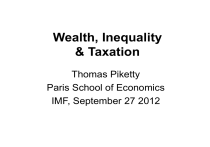 Wealth, Inequality & Taxation Thomas Piketty Paris School of Economics IMF, September 27 2012 Wealth and inequality in the long run • Long run distributional trends = key question asked by 19C economists • Many came with apocalyptic answers • Ricardo-Marx: a small group in society (land owners or capitalists) will capture an ever growing share of income & wealth → no “balanced development path” can occur • During 20C, a more optimistic consensus emerged: “growth is a rising tide that lifts all boats” (Kuznets 1953; cold war context) • But inequality ↑ since 1970s destroyed this fragile consensus (US 1976-2007: ≈60% of total growth was absorbed by top 1%) → 19C economists raised the right questions; we need to adress these questions again; we have no strong reason to believe in balanced development path • 2007-2011 world financial crisis also raised doubts about balanced devt path… will stock options & bonuses, or oil-rich countries, or China, or tax havens, absorb an ever growing share of world ressources in 21C capitalism? Convergence vs divergence • Convergence forces do exist: diffusion of knowledge btw countries (fostered by econ & fin integration) & wth countries (fostered by adequate educ institutions) • But divergence forces can be stronger: (1) When top earners set their own pay, there’s no limit to rent extraction → top income shares can diverge (2) The wealth accumulation process contains several divergence forces, especially with r > g → a lot depends on the net-of-tax global rate of return r on large diversified portfolios : if r=5%-6% in 2010-2050 (=what we observe in 1980-2010 for large Forbes fortunes, or Abu Dhabi sovereign fund, or Harvard endowment), then global wealth divergence is very likely This lecture: two issues • 1.The rise of the working rich (≈1h, slides 1-22) - Atkinson-Piketty-Saez,« Top Incomes in the Long Run of History », JEL 2011 - New results from World Top Incomes Database (WTID) - Piketty-Saez-Stantcheva, « Optimal Taxation of Top Labor Income: A Tale of Three Elasticities », NBER WP 2011 (key mechanism: grabbing hand) • 2.The return of wealth & inheritance (≈1h30, slides 23-76) - Piketty, « On the Long Run Evolution of Inheritance », QJE 2011 - Piketty-Zucman, « Capital is Back: Wealth-Income Ratios in Rich Countries 1870-2010 », WP PSE 2012 - First results from World Wealth Database (preliminary) - Piketty-Saez, « A Theory of Optimal Capital Taxation », NBER WP 2012 (key mechanism: r>g) (r = rate of return to wealth, g = growth rate) 1. The Rise of the Working Rich • World top incomes database: 25 countries, annual series over most of 20C, largest historical data set • Two main findings: - The fall of rentiers: inequality ↓ during first half of 20C = top capital incomes hit by 1914-1945 capital shocks; did not fully recover so far (long lasting shock + progressive taxation) → without war-induced economic & political shock, there would have been no long run decline of inequality; nothing to do with a Kuznets-type spontaneous process - The rise of working rich: inequality ↑ since 1970s; mostly due to top labor incomes, which rose to unprecedented levels; top wealth & capital incomes also recovering, though less fast → what happened? 45% 40% 35% 30% 2007 2002 1997 1992 1987 1982 1977 1972 1967 1962 1957 1952 1947 1942 1937 1932 1927 1922 25% 1917 Share of total income going to Top 10% 50% FIGURE 1 The Top Decile Income Share in the United States, 1917-2010 Source: Piketty and Saez (2003), series updated to 2010. Income is defined as market income including realized capital gains (excludes government transfers). 45% Including capital gains Excluding capital gains 40% 35% 30% 2007 2002 1997 1992 1987 1982 1977 1972 1967 1962 1957 1952 1947 1942 1937 1932 1927 1922 25% 1917 Share of total income going to Top 10% 50% FIGURE 1 The Top Decile Income Share in the United States, 1917-2010 Source: Piketty and Saez (2003), series updated to 2010. Income is defined as market income including realized capital gains (excludes government transfers). 20% 15% 10% Top 1% (incomes above $352,000 in 2010) Top 5-1% (incomes between $150,000 and $352,000) Top 10-5% (incomes between $108,000 and $150,000) 5% FIGURE 2 Decomposing the Top Decile US Income Share into 3 Groups, 1913-2010 2008 2003 1998 1993 1988 1983 1978 1973 1968 1963 1958 1953 1948 1943 1938 1933 1928 1923 1918 0% 1913 Share of total income accruing to each group 25% Top 1% share: English Speaking countries (U-shaped), 1910-2010 30 20 United States United Kingdom Canada Australia Ireland New Zealand 15 10 5 2010 2005 2000 1995 1990 1985 1980 1975 1970 1965 1960 1955 1950 1945 1940 1935 1930 1925 1920 1915 0 1910 Top Percentile Share (in percent) 25 Japan Sweden 2010 Switzerland 2005 Netherlands 2000 Germany 1995 France 1990 1985 1980 1975 1970 1965 20 1960 25 1955 1950 1945 1940 1935 1930 1925 1920 1915 1910 1905 1900 Top Percentile Share (in percent) Top 1% share: Continental Europe and Japan (L-shaped), 1900-2010 30 15 10 5 0 2010 2005 Italy 2000 Spain 1995 Germany 1990 France 1985 1980 1975 1970 1965 20 1960 25 1955 1950 1945 1940 1935 1930 1925 1920 1915 1910 1905 1900 Top Percentile Share (in percent) Top 1% share: Continental Europe, North vs South (L-shaped), 1900-2010 30 Sweden 15 10 5 0 Top Decile Income Shares 1910-2010 Share of total income going to top 10% (incl. realized capital gains) 50% U.S. 45% U.K. Germany 40% France 35% 30% 25% 1910 1920 1930 1940 1950 1960 1970 1980 1990 2000 2010 Source: World Top Incomes Database, 2012. Missing values interpolated using top 5% and top 1% series. Why did top incomes rise so much? • Hard to account for observed cross-country variations with a pure technological, marginal-product story • One popular view: US today = working rich get their marginal product (globalization, superstars); Europe today (& US 1970s) = market prices for high skills are distorted downwards (social norms, etc.