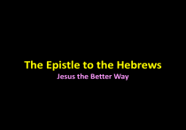The Epistle to the Hebrews Jesus the Better Way Hebrews in the New Testament Gospel (4) History (1) Epistle (21) Prophecy (1) Matthew Mark Luke John Acts General (8) Hebrews James 1 Peter 2 Peter 1 John 2 John 3 John Jude Revelation Epistle (21) Paul (13) Romans 1 and 2 Cor. Galatians Ephesians Philippians Colossians 1 and 2 Thess. 1 and 2 Tim. Titus Philemon 2 Time Period in NT History Preparation for the Church / Life of Christ c. A.D. 1 – 30 Period 1 ( Matthew through John ) Period 2 Establishment of the Church c. A.D. 30 – 60 ( Acts through Philemon ) Period 3 Latter Developments in the Church c. A.D 60 – 90 ( Hebrews through Revelation ) 3 Book Background Title: Hebrews 1. The title “Hebrews” (Pros Hebraious, To the Hebrews) is not original with the book, but was later assigned to the book. Hebrews is the first of eight books known as the General Epistles. These eight books are called General Epistles because they are addressed to a “general”, widespread audience rather than a particular local church (Corinth, Ephesus, Philippi, etc.) or particular individual (Timothy, Titus, Philemon). 4 Book Background Title: Hebrews 2. “The Epistle of Paul the Apostle to the Hebrews” is a title that is found in some editions of the King James Version, but there is no early manuscript evidence to support this wording and it was not a part of the original letter. It was added later. 5 Book Background Author: Unknown 1. Like the genealogy of Melchizedek (7:3), the author of Hebrews is unknown. Different authors have been suggested (Barnabas, Luke, Apollos, Silas, Paul, etc.). 6 Book Background Author: Unknown 2. The language and style of writing used in the salutation is very similar to what Paul would use (13:18-25), but the typical mention of Paul’s name in a greeting is missing from the book (see Rom. 1:1; 1 Cor. 1:1; etc.). Also, the author appears not to have been an apostle, but one who received the gospel message from the apostles (2:3). Another consideration is to note that the author quotes exclusively from the Septuagint and not from the Hebrew text as Paul often does in his epistles. 7 Book Background Author: Unknown 3. Men like Clement of Alexandria, Origen, and Athanasuis believed that Paul wrote the book. The original recipients knew who he was (13:18-25), but no one knows for certain who wrote the book. However, we can all know for certain what his message was. 8 Book Background Audience: Jewish Christians 1. Hebrews was written to “brethren” (3:1,12; 10:19; 13:1,22). The traditional view is that the audience was primarily a group of Jewish Christians. There are several references to Old Testament passages, persons (Moses, Joshua, Melchizedek, Aaron, Abraham, etc.), and institutions (priesthood, tabernacle, sacrifices) which would have been understood by a Jewish audience more so than a Gentile audience. 9 Book Background Audience: Jewish Christians 1. (continued) The repeated use of the present tense in connection to the sacrificial system points to the temple still being in use (8:4,13; 9:4,5,9; 10:1,8,11; 13:10-11). Also, there is no specific mention of Gentiles in the book. The readers may have been Jewish Christians in or around Rome (13:24). 10 Book Background Audience: Jewish Christians 2. The readers were Christians who had obeyed the gospel (2:3-4; 3:1,12,14; 6:9). They knew the author (13:19) and Timothy (13:23). They were not novices (5:12; 6:1-3) and they had been ministers to the saints (6:10). They had been persecuted, but not to the point of bloodshed (10:32-34; 12:4; 13:3). They had leadership (13:7,17,24). 11 Book Background Audience: Jewish Christians 2. (continued) However, they were in danger of drifting (2:1), neglect (2:3), and falling away (3:12; 4:1,11; 12:12-15). They were dull of hearing (5:11) and needed to press on to maturity (6:1). They were going after strange teachings (13:9-10). Some were even making a custom of forsaking the assemblies (10:25), sinning willfully (10:26), and shrinking back to perdition (10:39). 12 Book Background Purpose: Exhortation 1. Hebrews is a book of exhortation (13:22). It was written to exhort the readers not to fall away from Christ. These readers who once stepped out of Judaism into Christianity, are now turning back to the Old Law or turning aside to worldliness (2:1,3; 3:1213; 4:1,11; 5:11; 6:1,4-8; 10:25,26,39; 12:12,15,25; 13:9-10). They may have done this to avoid persecution. 13 Book Background Purpose: Exhortation 2. Hebrews exhorts the readers to mature and press forward (6:1,9-12) rather than fall away. They are exhorted several times to “hold fast” what they have in Christ (3:6,14; 4:14; 10:23). The author’s appeal to mature is based upon the absolute sufficiency, supremacy and superiority of Jesus Christ. He is the “better” way! The author’s appeal in the book peaks with the statement: “Jesus Christ is the same yesterday, today and forever” (13:8). 14 Book Background Purpose: Exhortation 2. (continued) It has been suggested that the author begins his book like an essay, proceeds like a sermon, and ends like a letter (Introduction to the New Testament, H.C. Thiessen, page 297). The author makes use of typical homiletical devices (3:1; 5:11; 7:4; 6:3; 9:5b; 11:32; 12:3; 13:22), frequent exhortations (2:1; 3:1-2; 4:11,14; 10:19-25,35; 12:15,12-13; 13:13-15), and sharp warnings (2:2-4; 3:6,12-13; 4:1,12-13; 6:4-8; 10:26-31; 12:14-17,2529; 13:9). 15 Book Background Purpose: Exhortation 2. (continued) The author also exhorts the readers using the words, “let us”, twelve times (4:1,11,14,16; 6:1; 10:22,23,24; 12:1,28; 13:13,15). The author warns against apostasy (6:4-8; 10:26-29; 12:14-19) and encourages his readers to renew their zeal for Christ (6:9-12; 10:19-39; 12:12-17). 16 Book Background Date: c. A.D. 64-68 1. Clement of Rome quoted abundantly from Hebrews in his epistle 1 Clement (c. A.D. 95), so it would have been written prior to that time. We know that it was writte
