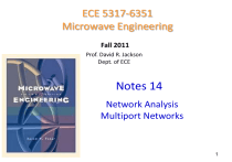 ECE 5317-6351 Microwave Engineering Fall 2011 Prof. David R. Jackson Dept. of ECE Notes 14 Network Analysis Multiport Networks 1 Multiport Networks A general circuit can be represented by a multi-port network, where the “ports” are defined as access terminals at which we can define voltages and currents. Note: Equal and opposite currents are assumed on the two wires of a port. Examples: 1) One-port network I1 + V1 I1 + V1 R - - 2) Two-port network I2 I2 I1 + V1 + V2 - I1 - + V1 - + V2 - 2 Multiport Networks (cont.) IN 3) N-port Network + VN - I1 Im V1 +- To represent multi-port networks we use: + - Vm I2 - Z (impedance) parameters Y (admittance) parameters h (hybrid) parameters ABCD parameters Not easily measurable at high frequency - S (scattering) parameters Measurable at high frequency V2 + - I3 + V 3 3 Poynting Theorem (Phasor Domain) V 2 1 EJ i* dV S nˆ dS S 1 c E 2 V 2 1 2 j H 4 V 1 H 2 2 1 4 2 dV 2 c E dV The last term is the VARS consumed by the region. The notation < > denotes time-average. Ps P f Pd j 2 Wm We 4 Self Impedance Consider a general one-port network S I1 V1 + nˆ E,H - V Complex power delivered to network: Pin 1 2 1 2 E H nˆ S V1 I 1 d s Pd j 2 W m W e * Average power dissipated in [W] Pd Pd Average electric energy (in [J]) stored inside V W e We Average magnetic energy (in [J]) stored inside V W m Wm 5 Define Self Impedance (Zin) 1 Z in V1 I1 V1 I 1 I1 * 2 2 1 2 R in jX in V1 I 1 I1 * 2 X in 1 I1 2 2 Pd j 2 W m W e 1 2 R in Pin I1 2 2 Pd I1 2 S I1 4 (W m W e ) I1 2 V1 + - nˆ E,H V 6 Self Impedance (cont.) We can show that for physically realizable networks the following apply: Please see the Pozar book for a proof. V1 V1 * Z in Z in * I1 I1 * R in is a n e v e n fu n ctio n o f Z in R in jX in X in is a n o d d fu n ctio n o f Note: Frequency is usually defined as a positive quantity. However, we consider the analytic continuation of the functions into the complex frequency plane. 7 Two-Port Networks Consider a general 2-port linear network: I2 I1 V1 + - 1 + 2 - V2 In terms of Z-parameters, we have (from superposition) Impedance (Z) matrix V1 Z 11 I 1 Z 12 I 2 V 2 Z 21 I 1 Z 2 2 I 2 V1 Z 11 V 2 Z 21 Z 12 I 1 Z 22 I 2 V Z I 8 Elements of Z-Matrix: Z-Parameters (open-circuit parameters ) V1 Z 11 I 1 Z 12 I 2 V 2 Z 21 I 1 Z 22 I 2 Port 2 open circuited Z 11 Z 21 Port 1 open circuited Z ij V1 I1 Vi Ij Ik 0 Z 12 k j I2 0 V2 I1 Z 22 I2 0 V1 - I2 I1 0 V2 I2 I1 0 I2 I1 + V1 1 2 + - V2 9 Z-Parameters (cont.) N-port network Z ij Ij Vi Ij Ik 0 k j Vi + - We inject a current into port j and measure the voltage (with an ideal voltmeter) at port i. All ports are open-circuited except j. 10 Z-Parameters (cont.) Z-parameters are convenient for series connected networks. A B V1 V1 V1 A B V 2 V 2 V 2 + A A B B Z I Z I A B Z Z I I1 Z Z I2 Z A A B I1A I1 V1A I 2A + - 1 A 2 + - I2 V2A + V2 V1 I 2B I1B - V1B I1 Z I2 + - 1 B 2 + - V2B - B V1 Z 11 Z 11 A B V Z Z 2 21 21 A B A B Z 12 Z 12 I 1 A B Z 22 Z 22 I 2 S e rie s I1 I1 I1 A B I2 I2 I2 A B 11 Admittance (Y) Parameters Consider a 2-port network: I2 I1 V1 + 1 - + 2 - I 1 Y11V1 Y12V 2 Admittance matrix I 2 Y21V1 Y 22V 2 or I 1 Y11 I 2 Y 21 Yij V2 Y12 V1 I Y V Y 2 2 V 2 Ii Vj Short-circuit parameters Vk 0 k j 12 Y-Parameters (cont.) N-port network Yij Vj Ii Vj +Vk 0 k j Ii We apply a voltage across port j and measure the current (with an ideal current meter) at port i. All ports are short-circuited except j. 13 Admittance (Y) Parameters Y-parameters are convenient for parallel connected networks. I1 + V1 - I1A V1A + - 1 A 2 I1B B 1 Y11 Y11 A B Y Y 21 21 A B V Y12 Y12 V1 A B Y 22 Y 22 V 2 A I2 + A - V2 V2 + - I 2B + B 1 - I1 I I A B I2 I2 I2 A 1 I 2A 1 B + B - V2 2 B P a ra lle l V1 V1 V1 A B V2 V2 V2 A B 14 Admittance (Y) Parameters Relation between [Z] and [Y] matrices: V Z I I Y V Hence V Z Y V Z Y V Z Y U Identity M atrix Therefore Y Z 1 15 Reciprocal Networks If a network does not contain non-reciprocal devices or materials* (i.e. ferrites, or active devices), then the network is “reciprocal.” Z ij Z ji Z a n d Y Y ij Y ji Note: The inverse of a symmetric matrix is symmetric. a re sym m e tric * A reciprocal material is one that has reciprocal permittivity and permeability tensors. A reciprocal device is one that is made from reciprocal materials Example of a nonreciprocal material: a biased ferrite (This is very useful for making isolators and circulators.) 16 Reciprocal Materials D E B Η D x xx D y yx D z zx xy xz E x yy yz E y zy zz E z B x xx B y yx B z zx xy yy zy xz x yz y zz z Reciprocal: ij ji , ij ji Ferrite: 0 j 0 j 0 0 0 1 is not symmetric! 17 Reciprocal Networks (cont.) We can show that the equivalent circuits for reciprocal 2-port networks are: Z 22 Z 21 Z11 Z 21 T-equivalent Z 21 Y21 Pi-equivalent Y11 Y21 Y22 Y21 18 ABCD-Parameters There are defined only for 2-port networks. V 1 A I1 C I1 B V 2 ' D I2 V1 I 2' 1 2 V 2 I2 I2 ' A V1 V2 B ' I2 0 V1 V2 D ' I2 I1 C V2 0 ' I2 0 I1 ' I2 V2 0 19 Cascaded Networks I1 I1A V1 V1A I 1 A 2 V A' 2 A 2 I B 1 B 1 V I 1 B 2 A V 2 V 1 V 1 A A A B C D A ' I1 I1 I 2 B' 2 V B 2 I 2' V2 A V 1 A A B C D B I1 B V 2 A B A B C D A B C D ' B I 2 B V1 I1 ABCD AB A nice property of the ABCD matrix is that it is easy to use with cascaded networks: you simply multiply the ABCD matrices together. V 2 ' I 2 20 Scattering Parameters At high frequencies, Z, Y, h & ABCD parameters are difficult (if not impossible) to measure. o V and I are not uniquely defined o Even if defined, V and I are extremely difficult to measure (particularly I). o Required open and short-circuit conditions are often difficult to achieve. Scattering (S) parameters are often the best representation for multi-port networks at high frequency. 21 Scattering Parameters (cont.) S-parameters are defined assuming transmission lines are connected to each port. a1 b1 Z 01 , 1 1 Z 02 , 2 2 z1 a2 b2 z2 Local coordinates On each transmission line: Vi zi Vi 0 e I i zi Vi i zi zi Z 0i Vi 0 e Vi i zi zi Vi zi Vi zi i 1, 2 Z 0i Incom i