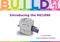 Introducing the MZ1090 K. Corey Reid Product Marketing Specialist Key Features • • • • • • • • • • • Auto Color Detection USB Print Driver- Auto and Manual Easy 2 Color Integrated User Management- Copy Count Viewer 180 degree rotation (GDI) ID Print Preview and Edit – Is the same as the Color Separation (Integrated CS2000) Interval Printing Ink Saving (Available on EZ Series) Program Print Output Reversal (Reverse Page Order) New product information •600 x 600 dpi scanning and imaging •150 ppm •Increased productivity •Simplified 2 color one pass printing Product concept • Increase the customer satisfaction of two color printing. • Expand the duplicator market by adding useful EZ features to new MZ1090. (e.g. Auto Color Detection, USB “Plug and Print” and ID print.) • Take all the strain out of color separation for two-color printing by the advanced printer driver. • MZ990 -----------> MZ1090 RISO MZ1090 * * * • • Target Markets Commercial Print Quick Printers In-Plants Higher Education Churches • • • • • • • • • • Applications Business Cards Newsletters Carbonless Forms Flyers Promotional Materials Educational Materials Bulletins Letterheads Envelopes More 1. Produce and Sell More Jobs New workflow process moves pre-press steps from the duplicator to the PC – Reduce pre-press time and costs by up to 50% via new fully integrated pre-press capabilities • Auto-convert full-color to 2-color • Rapid adjust/preview editing cycles – Result: Duplicator is more available for revenue producing production print operation. 1. Auto convert any CMYK and RGB file to 2-color • Break-through feature cuts pre-press time and steps by up to 50% – Integrated CS2000 color manipulation software – Compare MZ990 to MZ1090 process steps – Reduces pre-press edit/prep cycles • Eliminates need for graphic artist to specifically design for 2-color printing – Increased flexibility and ability to accept any file from any source. – New offering/generate more business • Offer 2-color production to more customers, on more jobs MZ990/MZ1090 Graphic Design Comparison MZ990 – Design with two colors • Red/Black for best results – RGB Only – Limited MS Publisher support – Edit images, line art, text, etc. with external software • Adobe Photoshop & Illustrator • Adobe InDesign • Enfocus Pit Stop Pro MZ1090 – No specific design restrictions or requirements – Standard full-color document designs – CMYK and RGB support – Minimized need to manipulate elements via external pre-press and graphic design software Workflow: MZ1090 vs. MZ990 Improvements MZ10 vs. MZ9 series • New printer driver – Manual color separation • Expand the selections of color separation for “Text/Line art” and “Photo” to match the various customer needs. – Preview and Edit • No need to waste master to check the color separation result. Plus, if the color separation is wrong on the preview, you can change the color (drum1 or drum2) from your PC before printing. – Use color separation data • If your document is already separated in two-colors (=two pages) you can use it and print it by single operation. – Tone smoothing • Print quality of halftone and photo images will be smoother than before. • USB “Plug and Print” /RISO USB Print Manager – Even MZ is not connected to your PC, you can print directly from your data file via USB flash drive. Improvements (MZ10 vs. MZ9 series) • • • • • • • New master disposal box – Even easier to dispose of used masters. – Allows to monitor the number of prints/masters and set upper usage limits for individual users by PIN. User management/ID Counter Report/RISO Copy Count Viewer ID print – Protects your confidential document until you input the PIN. – 3-way output for counter report –print out, save CSV file to USB flash drive or send CSV file via E-mail. Counter report Layout – Able to layout several pages on one sheet (2, 4, 8, 16 pages). – Print out two separate pages from spread original. – Allows use of thicker stock such as card (up to 400gsm). Page Split (Book shadow) Card feed kit Accessories Discription S-code Note Card Feed Kit S-3451 Able to feed heavy stock such as card (up to 400gsm) Wide Stacking Tray S-3370 Able to stack large size documents (up to 340mm x 555mm) RISO Auto Document Feeder AF-VI: II S-2104 Single side scan auto document feeder. RISO Auto Document Feeder DX-I S-4338 Single and double side scan auto document feeder. Important: S-3363 "RISO DX-1 Connection Kit" is required. RISO Job Separator IV: N III S-6361 Allows the machine to print and sort into groups separated by tape. Key Card Counter IV: N S-4309 Able to control the usage by card. Important: S-4703 "Key Card Counter IV: N Connection Kit (II)" is required. RISO Network Card S-9122 Gives the MZ network connection (TCP/IP). Document Storage Card DM-128CF S-2379 Allows storage of frequently used documents for instant recall. RISO Printer Driver for Macintosh S-7624 Printer driver for Macintosh. Important: S-9122 "RISO Network Card" is required. RISO Controller IS300 (VB-CL29G) S-2768G Adobe PostScript 3 controller. Drum Upgrade Kit ZType-Z10 S-5258 Able to upgrade Z type drum to Z10 drum. RISO Z10 Drum A3 S-5256 A3 drum for MZ1090. SERVICE PARTS Discription Cover Kit; Paper Feed / Ejection PARTS No. Note 024-75050-056 Noise reduction kit for MZ series. *1 : It is necessary to modify the suction Area to EZ3 series type. Required "Suction Unit (046-75023-xxx)", "Support; Wing Knob; Suction(023-21385-xxx)", "Cover Plate; Suction(023-21381-xxx)", "De-Electricity Brush; Suction(017-13258-xxx)" "Seal; Jump Wing Inst; Metric(023-21806-xxx)" *2 : Required Wide Stacking Tray Support; Front(045-22551) and Wide Stacking Tray Support; Rear(045-22552) *3 : Required CONNECTION KIT (S-9120) and CONNECTION KIT FOR TM2500 Z/V(S-4850) and either TM25 CONNECTION KIT E(S-3556E) or F(S-3556U