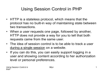 Using Session Control in PHP • HTTP is a stateless protocol, which means that the protocol has no built-in way of maintaining state between two transactions. • When a user requests one page, followed by another, HTTP does not provide a way for you to tell that both requests came from the same user. • The idea of session control is to be able to track a user during a single session on a website. • If you can do this, you can easily support logging in a user and showing content according to her authorization level or personal preferences. Using Session Control in PHP tMyn 1 • Sessions in PHP are driven by a unique session ID, a cryptographically random number. • This session ID is generated by PHP and stored on the client side for the lifetime of a session. • It can be either stored on a user’s computer in a cookie or passed along through URLs. • A session ID acts as a key that allows you to register particular variables as so-called session variables. • The contents of these variables are stored at the server. • The session ID is the only information visible at the client side. Using Session Control in PHP tMyn 2 • If, at the time of a particular connection to your site, the session ID is visible either through a cookie or the URL, you can access the session variables stored on the server for that session. • By default, the session variables are stored in flat files on the server. Using Session Control in PHP tMyn 3 • A cookie is a small piece of information that scripts can store on a client-side machine. • You can manually set cookies in PHP using the setcookie() function. It has the following prototype: bool setcookie(string name [,string value [, int expire [, string path [, string domain [, int secure]]]]) Using Session Control in PHP tMyn 4 • If you set a cookie as setcookie(‘mycookie’, ‘myvalue’); when the user visits the next page in your site (or reloads the current page), you will have access to the cookie via $_COOKIE[‘mycookie’]. • You can delete a cookie by calling setcookie() again with the same cookie name and an expiry time in the past. Using Session Control in PHP tMyn 5 • Cookies have some associated problems: some browsers do not accept cookies, and some users might have disabled cookies in their browsers. • This is one of the reasons PHP sessions use dual cookie/URL method. • When you are using PHP sessions, you do not have to manually set cookies. The session functions take care of this task. • You can use the function session_get_cookie_params() to see the contents of the cookie set by session control. • It returns an array containing the elements lifetime, path, domain, and secure. Using Session Control in PHP tMyn 6 • You can also use session_set_cookie_params($lifetime, $path, $domain [, $secure); • • • • to set the session cookie parameters. PHP uses cookies by default with sessions. If possible, a cookie will be set to store the session ID. The other method it can use is adding the session ID to the URL. Alternatively, you can manually embed the session ID in links so that it is passed along. The session ID is stored in the constant SID. Using Session Control in PHP tMyn 7 • To pass it along manually, you add it to the end of a link similar to a GET parameter: • <a href=“link.php?<?php echo strip_tags(SID); ?>”> Using Session Control in PHP tMyn 8 strip_tags strip_tags — Strip HTML and PHP tags from a string string strip_tags ( string $str [, string $allowable_tags ] ) This function tries to return a string with all HTML and PHP tags stripped from a given str . It uses the same tag stripping state machine as the fgetss() function. str The input string. allowable_tags You can use the optional second parameter to specify tags which should not be stripped. Using Session Control in PHP tMyn 9 • • • • • The basic steps of using sessions are: Starting a session Registering session variables Using session variables Deregistering variables and destroying the session • These steps don’t necessarily all happen in the same script, and some of them happen in multiple scripts. Using Session Control in PHP tMyn 10 session_start — Initialize session data bool session_start ( void ) session_start() creates a session or resumes the current one based on the current session id that's being passed via a request, such as GET, POST, or a cookie. If you want to use a named session, you must call session_name() before calling session_start(). session_start() will register internal output handler for URL rewriting when trans-sid is enabled. This function returns TRUE if session was started with success otherwise FALSE. Using Session Control in PHP tMyn 11 session_id — Get and/or set the current session id string session_id ([ string $id ] ) session_id() is used to get or set the session id for the current session. The constant SID can also be used to retrieve the current name and session id as a string suitable for adding to URLs. id If id is specified, it will replace the current session id. session_id() needs to be called before session_start() for that purpose. Depending on the session handler, not all characters are allowed within the session id. For example, the file session handler only allows characters in the range a-z A-Z 0-9 , (comma) and - (minus)! Note: When using session cookies, specifying an id for session_id() will always send a new cookie when session_start() is called, regardless if the current session id is identical to the one being set. session_id() returns the session id for the current session or the empty string ("") if there is no current session (no current session id exists). Using Session Control in PHP tMyn 12 session_name — Get and/or set the current session name string session_name ([ string $name ] ) session_name() returns the name of the current session. The session name is reset to the default value stored in session.name at request startup time. Thus, you ne