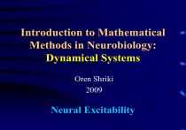 Introduction to Mathematical Methods in Neurobiology: Dynamical Systems Oren Shriki 2009 Neural Excitability References about neurons as electrical circuits: • Koch, C. Biophysics of Computation, Oxford Univ. Press, 1998. • Tuckwell, HC. Introduction to Theoretical Neurobiology, I&II, Cambridge UP, 1988. References about neural excitability: • Rinzel & Ermentrout. Analysis of neural excitability and oscillations. In, Koch & Segev (eds): Methods in Neuronal Modeling, MIT Press, 1998. Also as “Meth3” on www.pitt.edu/~phase/ • Borisyuk A & Rinzel J. Understanding neuronal dynamics by geometrical dissection of minimal models. In, Chow et al, eds: Models and Methods in Neurophysics (Les Houches Summer School 2003), Elsevier, 2005: 19-72. • Izhikevich, EM. Dynamical Systems in Neuroscience: The Geometry of Excitability and Bursting. MIT Press, (soon). Neural Excitability • One of the main properties of neurons is that they can generate action potentials. • In the language of non-linear dynamics we call such systems “excitable systems”. • The first mathematical model of a neuron that can generate action potentials was proposed by Hodgkin and Huxley in 1952. • Today there are many models for neurons of diverse types, but they all have common properties. A Typical Neuron Intracellular Recording Electrical Activity of a Pyramidal Neuron The Neuron as an Electric Circuit • The starting point in models of neuronal excitability is describing the neuron as an electrical circuit. • The model consists of a dynamical equation for the voltage, which is coupled to equations describing the ionic conductances. • The non-linear behavior of the conductances is responsible for the generation of action potentials and determines the properties of the neuron. Hodgkin & Huxley Model )1952( • The model considers an isopotential membrane patch )or a “point neuron”(. • It contains two voltage-gated ionic currents, K and Na, and a constantconductance leak current. The Equivalent Circuit External solution Internal solution K and Na Currents During an Action Potential Positive and Negative Feedback Cycles During an Action Potential The Hodgkin-Huxley Equations dV C I ion V , w I (t ) dt I ion V , m, h, n g Na m h(V VNa ) g K n (V VK ) g L (V VL ) 3 4 dm /dt m(V)-m/τ m dh/dt h(V)-h/τ h dn/dt n(V)-n/τ n The Hodgkin & Huxley Framework dV C I ion V , W1 , , WN I (t ) dt Each gating variable obeys the following dynamics: Wi , V Wi dWi dt i V i - Time constant - Represents the effect of temperature The Hodgkin & Huxley Framework The current through each channel has the form: I j g j j V ,W1,,WN (V V j ) gj j - Maximal conductance (when all channels are open) - Fraction of open channels (can depend on several W variables). The Temperature Parameter Φ • Allows for taking into account different temperatures. • Increasing the temperature accelerates the kinetics of the underlying processes. • However, increasing the temperature does not necessarily increase the excitability. Both increasing and decreasing the temperature can cause the neuron to stop firing. • A phenomenological model for Φ is: Temp6.3/10 3 Simplified Versions of the HH Model • Models that generate action potentials can be constructed with fewer dynamic variables. • These models are more amenable for analysis and are useful for learning the basic principles of neuronal excitability. • We will focus on the model developed by Morris and Lecar. The Morris-Lecar Model (1981) • Developed for studying the barnacle muscle. • Model equations: dV C I ion V , w I app (t ) dt dw w V w dt w V I ion V , w gCa m (V )(V VCa ) gK w(V VK ) gL (V VL ) Morris-Lecar Model • The model contains K and Ca currents. • The variable w represents the fraction of open K channels. • The Ca conductance is assumed to behave in an instantaneous manner. m (V ) 0.51 tanhV V1 / V2 w (V ) 0.51 tanhV V3 / V4 w V 1/ coshV V3 /2V4 Morris-Lecar Model • A set of parameters for example: V1 1.2 g Ca 4 VCa 120 V2 18 gK 8 VK 84 V3 2 gL 2 VL 60 V4 30 μF C 20 2 cm 0.04 Morris-Lecar Model • Voltage dependence of the various parameters (at long times): Nullclines • We first analyze the nullclines of the model (the curves on which the time derivative is zero). • The voltage equation gives: Iion V , w I app 0 • To see what this curve looks like, let us assume that Iapp=0 and fix w on a certain value, w0. • This is the instantaneous I-V relation of the system: I ion V , w I inst V ; w0 g Ca m (V )(V VCl ) g K w0 (V VK ) g L (V VL ) Nullclines • This curve is N-shaped and increasing w approximately moves the curve upward: • We are interested in the zeros of this curve for each value of w. Nullclines • The nullcline of w is simply the activation curve: Nullclines • The nullclines in the phase plane: Nullclines • The steady state solution of the system is the point where the nullclines intersect. • In the presence of an applied current, the steady-state satisfies: Iion V , w (V ) I app 0 Iion V , w (V ) I app I ss V Steady-State Current I ss V Iion V , w (V ) 1500 I ss (V,w ) 1000 500 0 -500 -80 -60 -40 -20 0 V 20 40 60 80 General Properties of Nullclines • The nullclines segregate the phase plane into regions with different directions for a trajectory’s vector flow. • A solution trajectory that crosses a nullcline does so either vertically or horizontally. • The nullclines’ intersections are the steady states or fixed points of the system. The Excitable Regime • We say that the system is in the excitable regime when the following conditions are met: – It has just one stable steady-state in the absence of an external current. – An action potential is generated after a large enough brief current pulse. Effect of Brief Pulses on the ML Neuron • A brief current pulse is equivalent to setting the initial voltage at some value above the rest state. • Below are responses for the following initial voltages: -20, -1