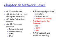 Chapter 4: Network Layer r 4. 1 Introduction r 4.2 Virtual circuit and datagram networks r 4.3 What’s inside a router r 4.4 IP: Internet Protocol m m m m Datagram format IPv4 addressing ICMP IPv6 r 4.5 Routing algorithms m Link state m Distance Vector m Hierarchical routing r 4.6 Routing in the Internet m m m RIP OSPF BGP r 4.7 Broadcast and multicast routing Hierarchical OSPF Perhaps some routers don’t need to know about every link. r E C G A H r r r two-level hierarchy: local area, backbone. m Link-state advertisements only within the area m each nodes has detailed knowledge of its area topology area border routers: “summarize” distances to nets in own area, advertise to other Area Border routers. backbone routers: run OSPF routing limited to backbone. boundary routers: connect to other AS’s. •ABR C announces link C<->A to Area 1 •ABR C announces link C<->E to Backbone •ABR C announces a summary of Area 1 to the Backbone •ABR C announces a summary of the Backbone and other areas to Area 1 •C learns about other areas from the other ABR •…… Area Border Router Summaries Should the summaries include reachbility information or path metrics? C G H •Routers in area 1 do not need to know about the paths used to reach destinations in other areas •They only need to know that they can be reached. •In this case, reachbility information is sufficient to compute optimal routes •i.e., the ABR only announces which destinations it can reach. •However, no one would make a topology as shown in the figure •Why? •If a single key links break or router crashes, the network would be partitioned (and the network designer would be fired) Area Border Router Summaries e.g., if summaries only include reachbility information area border router E F C G A B D •ABR C announces to Area 1 that it can reach Area 2 in 1 hops (and includes a list of destinations in Area 2) •ABR F announces to Area 1 that it can reach Area 2 in 0 hops •Router A determines the path to D as follows •The path to Area 2 via F is 2 hops (2 to reach F and then 0 more to Area 2) •The path to Area 2 via C is 2 hops (1 to C and then 1 more to Area 2) •Either path is good to reach D •However, the path via F is better. A does not have sufficient information to determine this. Area Border Router Summaries area border router E F C G A B D •ABR G tells all routers in the Backbone that it can reach D in 2 hop. •ABR F tells all routers in the Backbone that it can reach D in 1 hops •ABR C tells all routers in Area 1 that it can reach D in 3 hops •ABR F tells all routers in Area 1 that it can reach D in 1 hop •A decides B is the best next hop toward D •In this case, reachability information is not enough to compute optimal routes. •Therefore, ABRs provide distance vector type information, i.e., which destinations can be reached and the cost to reach them •Notice the C does not announce the link CG to Area 1. •Notice that C gets a summary from G, which is distances to destinations, like distance vector. •C uses the distances from G to determine its distances. •C announces these distances to Area 1 •This is like a one hop distance vector protocol Area Border Router Summaries area border router E F C G The backbone is completely connected because each router essentially sends distance vector updates directly to its neighbor C A B D F A in 1 hop B in 2 hops … … Area 1 2 1 3 1 G A in 4 hop B in 5 hops … … 2 A in 2 hop B in 3 hops … … Area 3 Area 2 •This is like a one hop distance vector protocol •Convergence time: 1 •Loops are not possible Chapter 4: Network Layer r 4. 1 Introduction r 4.2 Virtual circuit and datagram networks r 4.3 What’s inside a router r 4.4 IP: Internet Protocol m m m m Datagram format IPv4 addressing ICMP IPv6 r 4.5 Routing algorithms m Link state m Distance Vector m Hierarchical routing r 4.6 Routing in the Internet m m m RIP OSPF BGP r 4.7 Broadcast and multicast routing Recall: Subnets 223.1.1.2 223.1.1.1 223.1.1.4 223.1.1.3 223.1.9.2 223.1.7.0 223.1.9.1 223.1.7.1 223.1.8.1 223.1.8.0 223.1.2.6 223.1.2.1 223.1.3.27 223.1.2.2 223.1.3.1 223.1.3.2 IP addressing: CIDR CIDR: Classless InterDomain Routing m m subnet portion of address of arbitrary length address format: a.b.c.d/x, where x is # bits in subnet portion of address Subnet part or CIDR-block host part 11001000 00010111 00010000 00000000 200.23.16.0/23 IP addresses: how to get one? Q: How does network get subnet part of IP addr? A: gets allocated portion of its provider ISP’s address space ISP's block 11001000 00010111 00010000 00000000 200.23.16.0/20 Organization 0 Organization 1 Organization 2 ... 11001000 00010111 00010000 00000000 11001000 00010111 00010010 00000000 11001000 00010111 00010100 00000000 ….. …. 200.23.16.0/23 200.23.18.0/23 200.23.20.0/23 …. Organization 7 11001000 00010111 00011110 00000000 200.23.30.0/23 Hierarchical addressing: route aggregation Hierarchical addressing allows efficient advertisement of routing information: Organization 0 200.23.16.0/23 Organization 1 200.23.18.0/23 Organization 2 200.23.20.0/23 Organization 7 . . . . . . ISP1 “Send me anything with addresses beginning 200.23.16.0/20” Border Router 200.23.30.0/23 ISP2 “Send me anything with addresses beginning 199.31.0.0/16” This way, the whole 32 bit address does not need to be examined Internet Hierarchical addressing: more specific routes ISP2 has a more specific route to Organization 1 Organization 0 200.23.16.0/23 Organization 2 200.23.20.0/23 Organization 7 . . . . . . ISP1 “Send me anything with addresses beginning 200.23.16.0/20” Border Router 200.23.30.0/23 ISP2 Organization 1 200.23.18.0/23 “Send me anything with addresses beginning 199.31.0.0/16 or 200.23.18.0/23” Internet Longest prefix matching Border Router Forwarding Table Prefix Match 200.23.16.0/20 200.23.18.0/23 199.31.0.0/16 otherwise Link Interface 0 1 1 2 If a packet with destination address 200.23.18.12 arri