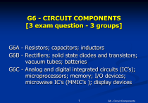 G6 - CIRCUIT COMPONENTS [3 exam question - 3 groups] G6A - Resistors; capacitors; inductors G6B - Rectifiers; solid state diodes and transistors; vacuum tubes; batteries G6C - Analog and digital integrated circuits (IC’s); microprocessors; memory; I/O devices; microwave IC’s (MMIC’s ); display devices 1 G6 - Circuit Components Resistors 2 G6 - Circuit Components Resistor Ratings 3 G6 - Circuit Components Capacitors Electrolyte capacitors (polarized) Ceramic capacitors 4 G6 - Circuit Components Inductors 5 G6 - Circuit Components Diode Electronic “valve”, used e.g. in rectifiers Mostly made of Si, Ga Different types: PN diodes, Schottky 6 G6 - Circuit Components G6A01 Which of the following is an important characteristic for capacitors used to filter the DC output of a switching power supply? A. Low equivalent series resistance B. High equivalent series resistance C. Low Temperature coefficient D. High Temperature coefficient 7 G6 - Circuit Components G6A01 Which of the following is an important characteristic for capacitors used to filter the DC output of a switching power supply? A. Low equivalent series resistance B. High equivalent series resistance C. Low Temperature coefficient D. High Temperature coefficient 8 G6 - Circuit Components G6A02 Which of the following types of capacitors are often used in power supply circuits to filter the rectified AC? A. Disc ceramic B. Vacuum variable C. Mica D. Electrolytic 9 G6 - Circuit Components G6A02 Which of the following types of capacitors are often used in power supply circuits to filter the rectified AC? A. Disc ceramic B. Vacuum variable C. Mica D. Electrolytic 10 G6 - Circuit Components G6A03 Which of the following is an advantage of ceramic capacitors as compared to other types of capacitors? A. Tight tolerance B. High stability C. High capacitance for given volume D. Comparatively low cost 11 G6 - Circuit Components G6A03 Which of the following is an advantage of ceramic capacitors as compared to other types of capacitors? A. Tight tolerance B. High stability C. High capacitance for given volume D. Comparatively low cost 12 G6 - Circuit Components G6A04 Which of the following is an advantage of an electrolytic capacitor? A. Tight tolerance B. Non-polarized C. High capacitance for given volume D. Inexpensive RF capacitor 13 G6 - Circuit Components G6A04 Which of the following is an advantage of an electrolytic capacitor? A. Tight tolerance B. Non-polarized C. High capacitance for given volume D. Inexpensive RF capacitor 14 G6 - Circuit Components G6A05 Which of the following is one effect of lead inductance in a capacitor used at VHF and above? A. Effective capacitance may be reduced B. Voltage rating may be reduced C. ESR may be reduced D. The polarity of the capacitor might become reversed 15 G6 - Circuit Components G6A05 Which of the following is one effect of lead inductance in a capacitor used at VHF and above? A. Effective capacitance may be reduced B. Voltage rating may be reduced C. ESR may be reduced D. The polarity of the capacitor might become reversed 16 G6 - Circuit Components G6A06 What will happen to the resistance if the temperature of a resistor is increased? A. It will change depending on the resistor’s reactance coefficient B. It will stay the same C. It will change depending on the resistor's temperature coefficient D. It will become time dependent 17 G6 - Circuit Components G6A06 What will happen to the resistance if the temperature of a resistor is increased? A. It will change depending on the resistor’s reactance coefficient B. It will stay the same C. It will change depending on the resistor's temperature coefficient D. It will become time dependent 18 G6 - Circuit Components G6A07 Which of the following is a reason not to use wire-wound resistors in an RF circuit? A. The resistor's tolerance value would not be adequate for such a circuit B. The resistor's inductance could make circuit performance unpredictable C. The resistor could overheat D. The resistor's internal capacitance would detune the circuit 19 G6 - Circuit Components G6A07 Which of the following is a reason not to use wire-wound resistors in an RF circuit? A. The resistor's tolerance value would not be adequate for such a circuit B. The resistor's inductance could make circuit performance unpredictable C. The resistor could overheat D. The resistor's internal capacitance would detune the circuit 20 G6 - Circuit Components G6A08 Which of the following describes a thermistor? A. A resistor that is resistant to changes in value with temperature variations B. A device having a specific change in resistance with temperature variations C. A special type of transistor for use at very cold temperatures D. A capacitor that changes value with temperature 21 G6 - Circuit Components G6A08 Which of the following describes a thermistor? A. A resistor that is resistant to changes in value with temperature variations B. A device having a specific change in resistance with temperature variations C. A special type of transistor for use at very cold temperatures D. A capacitor that changes value with temperature 22 G6 - Circuit Components G6A09 What is an advantage of using a ferrite core toroidal inductor? A. Large values of inductance may be obtained B. The magnetic properties of the core may be optimized for a specific range of frequencies C. Most of the magnetic field is contained in the core D. All of these choices are correct 23 G6 - Circuit Components G6A09 What is an advantage of using a ferrite core toroidal inductor? A. Large values of inductance may be obtained B. The magnetic properties of the core may be optimized for a specific range of frequencies C. Most of the magnetic field is contained in the core D. All of these choices are correct 24 G6 - Circuit Components G6A10 How should the winding axes of solenoid inductors be placed to minimize their mutual inductance? A. In line B. Parallel to each other C. At right angles D. Interleaved 25 G6