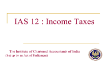IAS 12 : Income Taxes The Institute of Chartered Accountants of India (Set up by an Act of Parliament) IAS 12 v AS 22 Concept IAS 12 AS 22 : : Temporary Difference Timing Difference Approach IAS 12 AS 22 : : Balance Sheet Profit & Loss Account Method IAS 12 AS 22 : : BS liability method Deferral method Objective Where to account the tax consequences Principle In the same way that it accounts for the transactions and events themselves Tax consequences of transactions and events recognized In profit or loss account: Outside profit & loss account Statement of other comprehensive income Equity Computation of Current Tax Current tax liabilities (assets) for the current and prior periods shall be measured at the amount expected to be paid to (recovered from) the taxation authorities, using the tax rates and tax laws that have been enacted or substantively enacted by the end of the reporting period Deferred Tax Fundamental Principle An entity should recognize a deferred tax liability (asset) whenever recovery or settlement of the carrying amount of an asset or liability would make future tax payments larger (smaller) than they would be if such recovery or settlement were to have no tax consequences. Computation of Deferred Tax Balance Sheet Liability Method (a) Carrying amount of asset / liability (b) Tax base of asset / liability (c) Temporary Difference (a-b) (d) Applicable tax rate: x % (e) Deferred tax: (c x d) Computation of Deferred Tax Step (a) Compute Carrying Amount Carrying Amount Carrying amount of an asset or liability is the value of the asset or liability appearing in the balance sheet Computation of Deferred Tax Step (b) Compute Tax Base Tax Base Tax base of an asset or liability is the amount attributable to that asset or liability for tax purposes Four types: Tax base of an asset Tax base of a liability Tax base with no recognized carrying amounts Tax base not immediately apparent Tax Base of an Asset Is the amount that will be deductible for tax purposes against any taxable economic benefits that will flow to an entity when it recovers the carrying amount of the asset If those economic benefits will not be taxable, the tax base of the asset is equal to its carrying amount Tax Base of an Asset Tax base of an asset = Carrying value – Future taxable amounts + Future deductible amounts Illustration follows:- Tax Base of an Asset Illustration: A machine cost INR 100. For tax purposes, depreciation of INR 30 has already been deducted. Revenue generated by using the machine will be taxable. For accounting purposes, the machine has been depreciated by INR 20. Applying the formula we have: Carrying value of asset - Future taxable amounts + Future deductible amounts = Tax base 80 - 80 + 70 = 70 Tax Base of a Liability Is its carrying amount, less any amount that will be deductible for tax purposes in respect of that liability in future periods In the case of revenue that is received in advance, the tax base of the resulting liability is its carrying amount, less any amount of the revenue that will not be taxable in future periods Tax Base of a Liability Tax base of a liability = Carrying value – Future deductible amounts + Future taxable amounts Illustration follows:- Tax Base of a Liability Illustration: A loan payable has a carrying value of INR 100 at the balance sheet date. The repayment of the loan will have no tax consequences. Applying the formula we have: Carrying value of liability - Future deductible amounts + Future taxable amounts = Tax base 100 - 0 + 0 = 100 Tax Base of a Liability Illustration: Foreign currency loan payable has a carrying value of INR 95 after recognizing an exchange gain of INR 5 in the income statement. Exchange gains are taxable only when realized. Applying the formula we have: Carrying value of liability - Future deductible amounts + Future taxable amounts = Tax base 95 - 0 + 5 = 100 Tax Base of a Liability Tax base of revenue received in advance = Carrying value – Amount of revenue that will not be taxable in future periods amounts Illustration follows:- Tax Base of a Liability Tax base of revenue received in advance Illustration: Rents received in advance at the balance sheet date amounted to INR 100. The rental income will be taxed in future periods. Applying the formula we have: Carrying value of revenue received in advance - Amount of revenue that will not be taxable in future periods = Tax base 100 - 0 = 100 Tax Base of a Liability Tax base of revenue received in advance Illustration: A government grant of INR 100 is recognized at the balance sheet date as deferred income rather than being deducted against the cost of the asset. No tax is payable on receipt or subsequent amortization. The cost of the asset is fully deductible. Applying the formula we have: Carrying value of revenue received in advance - Amount of revenue that will not be taxable in future periods = Tax base 100 - 100 = 0 Tax base with no Recognized Carrying Amounts Expenditure expensed out in accounts but is carried forward in the tax balance sheet Illustration: IPO expenditure of INR 100 expensed out in accounts in the year of IPO but as per taxation laws allowable equally over 5 years. Applying the formula we have: Carrying value of expense - Future taxable amounts + Future deductible amounts = Tax base 0 - 0 + 80 = 80 Tax Base not immediately apparent Apply fundamental principle Fundamental Principle An entity should recognize a deferred tax liability (asset) whenever recovery or settlement of the carrying amount of an asset or liability would make future tax payments larger (smaller) than they would be if such recovery or settlement were to have no tax consequences. Computation of Deferred Tax Step (c) Compute Temporary Difference Temporary Differences Are differences between the carrying amount of an asset or liability in the statement of financial position and its tax base. Formula Temporary Difference = Carrying amount - Tax Base Compute Temporary Difference Exercise