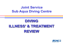 Joint Service Sub Aqua Diving Centre DIVING ILLNESS’ & TREATMENT REVIEW Diving Illness and Treatment Review Objectives Revise Basic Life Support (BLS) skills For diving incidents: • understand the conditions • recognise signs and symptoms • understand how oxygen administration benefits these conditions Understand appropriate equipment and the practicalities of its use Revise oxygen administration skills • breathing casualties • non-breathing casualties Diving Illness and Treatment Review Outline BLS Medical conditions Casualty Assessment Oxygen administration equipment Oxygen administration in practice Basic Life Support (BLS) Diving Illness and Treatment Review Lesson Outline BLS skills: • Essential rescue skills • Deteriorate quickly if not frequently exercised • Advice/techniques evolve Diving Illness and Treatment Review Assessing the Need Indicators of the need for BLS: • no response • no chest movement • no feel of air movement Diving Illness and Treatment Review Priorities D r A B C Danger – to casualty and rescuer Response (AVPU) Airway Breathing Circulation Diving Illness and Treatment Review Clear airway Foreign objects Tongue Airway blocked by tongue Head tilt/chin lift clears airway Diving Illness and Treatment Review Priorities Danger – to casualty and rescuer Response • • • • A – Alert V – Responds to Voice P – Responds to Pain U – Unresponsive Airway – clear of obstructions Breathing – check for normal breathing (10 secs.) Circulation – Cardiac Compressions Diving Illness and Treatment Review BLS: Decision Process No Unresponsive Leave casualty and get help Yes Shout for help, open up airway No Breathing normally? Yes Recovery position Leave casualty and get help, return and give 30CCs Stop to recheck only if breathing resumes, else continue until: •Qualified help arrives •Normal breathing •You are exhausted Diving Illness and Treatment Review Basic Life Support (BLS) Monitor effectiveness: • Sequence: 30 compressions : 2 breaths • Rate of 100 compressions/minute • 4–5cm compression • Stop if normal breathing resumes/medical assistance arrives Diving Illness and Treatment Review Rescue breaths (RB) Monitor effectiveness: • • • • Sight Feel Sound Appearance Don’t over ventilate Medical Conditions Diving Illness and Treatment Review Oxygen Exposure Oxygen Partial Pressure Scale (bar) Hypoxic Abilities impaired .08 .10 Unconsciousness .16 Long term toxicity risk .21 AIR .5 .7 1.0 Low Hyperoxic 1.3 1.4 1.6 High Short term toxicity risk Inspiration default set points At high concentrations oxygen is toxic PO2<0.16 bar does not support life Need to remain within accepted oxygen exposure limits Diving Illness and Treatment Review Hypoxia Abilities impaired Hypoxic .08 .10 Unconsciousness What is it: • Lack of oxygen • PO2< 0.16 bar .16 .21 AIR Diving Illness and Treatment Review Hypoxia Abilities impaired Hypoxic .08 .10 Unconsciousness .16 .21 AIR Symptoms: • • • • • Inability to think clearly, confusion, sense of losing it Loss of co-ordination Unconsciousness, death Primary danger is symptoms may be vague or absent It can occur suddenly and without warning! Diving Illness and Treatment Review Hyperoxia Long term toxicity risk Hyperoxic .21 AIR .5 1.0 1.4 1.6 Short term toxicity risk What is it: • • Too much oxygen Oxygen becomes toxic at elevated partial pressures There are two different effects of Hyperoxia: • • Whole Body Oxygen Toxicity when PO2>0.5 bar for long periods Central Nervous System (CNS) toxicity when PO2>1.4 bar for even short periods Diving Illness and Treatment Review Whole Body Toxicity Cause: long exposures to PO2>0.5 bar Monitored to allow for recompression treatment Physiological reactions including: • Inflammation in the lungs • Reduction in vital capacity • Congestion, oedema, bronchitis, swelling of alveolar walls, thickening of pulmonary arteries • Visual impairment Symptoms: • Dry cough, discomfort in breathing cycle, increased breathing resistance, shortness of breath, • Severe pain, sub-sternal pain or burning • Temporary short sightedness (Hyperoxic Myopia) Diving Illness and Treatment Review CNS Toxicity Also known as Acute Oxygen Toxicity Reaction to PO2 generally > 1.4 bar Symptoms: CON V E N T I D - Convulsions - Vision - Ears, hearing disturbances - Nausea - Twitching - Irritability - Dizziness Until convulsions begin, minor symptoms: • Can occur in ANY order or combination • Increase in severity Diving Illness and Treatment Review CNS Toxicity Convulsions • Tonic phase – do not assist o Muscles become tense o Casualty becomes rigid and holds breath • Clonic phase – do not assist o May occur seconds or minutes after the tonic phase o Casualty jerks violently (convulsion) • Depressive phase - assist o Casualty relaxes and is unconscious o Potential loss of mouthpiece – Loop flood – loss of buoyancy – Need for Basic Life Support? Diving Illness and Treatment Review CNS Toxicity Convulsions Phases can occur on surface or after PO2 is reduced (‘Off effect’) Progressive damage to nervous system with each successive convulsion Diving Illness and Treatment Review Hyperoxia Long term toxicity risk Hyperoxic .21 AIR .5 1.0 1.4 1.6 Short term toxicity risk Causes: • Inaccurate dive planning • Failure to analyse gas • Incorrect marking or fitting of cylinders Diving Illness and Treatment Review Hyperoxia Long term toxicity risk Hyperoxic .21 .5 1.0 AIR Aggravating factors • • • • Actual PO2 Duration of exposure Level of exertion Cumulative O2 exposure 1.4 1.6 Short term toxicity risk Diving Illness and Treatment Review Hyperoxia Long term toxicity risk Hyperoxic .21 AIR .5 1.0 1.4 1.6 Short term toxicity risk Avoidance: • High PCO2 predisposes to oxygen toxicity • Accurately track your oxygen exposure Diving Illness and Treatment Review Monitoring Oxygen Exposure CNS and Whole Body Toxicity need to be m