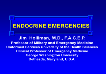 ENDOCRINE EMERGENCIES Jim Holliman, M.D., F.A.C.E.P. Professor of Military and Emergency Medicine Uniformed Services University of the Health Sciences Clinical Professor of Emergency Medicine George Washington University Bethesda, Maryland, U.S.A. Endocrine Emergencies Adrenal –Addisonian Crisis –Pheochromocytoma Thyroid –Thyroid Storm –Myxedema Coma Miscellaneous –Hypoglycemia –Diabetes Insipidus General Mechanisms of Endocrine Pathophysiology Deficient hormone action Excess hormone production or action Neoplasia Mechanisms of Endocrine Pathophysiology 1. Deficient hormone action –Primary glandular failure ƒ Congenital ƒ Acquired (atrophy, surgery, tumor, druginduced, autoimmune, infectious) –Secondary glandular failure –Disordered hormone release or activation –Accelerated hormone metabolism –Target tissue resistance Mechanisms of Endocrine Pathophysiology (cont.) 2. Excess hormone production or action –Gland autonomy (neoplasia, hyperplasia) –Abnormal stimulation –Ectopic hormone production –Altered hormone metabolism –Target tissue increased sensitivity to hormone action Mechanisms of Endocrine Pathophysiology (cont.) 3. Neoplasia –Benign vs. malignant –Functional vs. nonfunctional –Ectopic hormone production –Sporadic vs. familial syndromes Multiple Endocrine Neoplasia (MEN) Syndromes MEN I (Wermer) –Hyperparathyroid, pituitary adenoma, pancreatic cancer MEN IIa (Sipple) –Hyperparathyroid, thyroid medullary ca, pheochromocytoma MEN IIb (or III) –Medullary thyroid ca, pheochromocytoma, mucosal neuromas, Marfinoid habitus Polyendocrine Failure Syndromes Type I –Hypoparathyroidism –Hypoadrenalism –Mucocutaneous candidiasis –Other (hypogonadism,autoimmune thyroid disease, JODM) Type II –Adrenal insufficiency –Autoimmune thyroid disease –Other (JODM, primary or secondary gonadal failure) Diseases of the Adrenals Adrenocortical insufficiency –Addison's –Hypopituitarism –Iatrogenic ACTH deficiency Cushing's Syndrome –Cushing's Disease (cortical hyperplasia) –Pituitary tumor Adrenal adenoma or carcinoma –Ectopic ACTH syndrome (from tumors) Virilization –Adrenal adenoma or carcinoma –Congenital adrenal hyperplasia (CAH) Adrenal-mediated hypertension syndromes –Primary hyperaldosteronism (adenoma vs. hyperplasia), Cushing's syndrome, Pheochromocytomas Etiologies of Primary Adrenal Insufficiency Iatrogenic suppression Autoimmune adrenalitis (idiopathic) Infections (mycobacteria, fungal, CMV, HIV) Sarcoidosis Hemorrhage (anticoagulants, meningococcemia, trauma, toxemia, emboli) Collagen vascular disease Amyloidosis Hemochromatosis Metastatic malignancy Congenital (hypoplasia, adrenogenital syndrome, adrenoleucodystrophy) CT scan showing bilateral adrenal hemorrhages in a 57 year old female with breast cancer Etiologies of Secondary Adrenal Insufficiency Pituitary insufficiency –Congenital, tumor, infarction, sarcoid, autoimmune Hypothalamic dysfunction –Tumor –Vascular malformation Symptoms of Adrenal Insufficiency Weakness, fatigue, lethargy Nausea, vomiting +/- diarrhea Anorexia, weight loss Mental sluggishness +/- syncope Addisonian Crisis: –Shock –Cardiovascular collapse Signs of Adrenal Insufficiency Hypotension Other signs of dehydration Hyperpigmentation / vitiligo Skin atrophy Muscle wasting Loss of axillary & pubic hair +/- fever Lab Findings in Adrenal Insufficiency Hyponatremia Hyperkalemia Hypoglycemia Azotemia (prerenal) +/- eosinophilia +/- anemia Precipitating Factors for Addisonian Crisis Acute infection, esp. pneumonia Acute MI Pulmonary embolus Trauma / burns Surgery Heat exposure Vomiting / diarrhea Dehydration Blood loss Rapid cessation or reduction of chronic steroid therapy Acute Adrenal Crisis Caveats Suspect this dx when: –Sudden hypotension in response to procedure or stress, and does not correct with initial IV fluids +/- raising legs Patients previously maintained on chronic glucocorticoid Rx may not exhibit severe dehydration or hypotension until preterminal since mineralocorticoid function is usually maintained Addisonian Crisis Rx High flow oxygen Aggressive fluid / electrolyte replacement –Initially NS - usually need 4 to 6 liters –Switch to LR when K+ decreases IV hydrocortisone –100 to 250 mg IV bolus –10 to 20 mg per hr. IV infusion +/- cortisone acetate 50 mg IM (in case infusion stops) Search for precipitating cause Further Rx of Addisonian Crisis Once the patient's condition improves: –Decrease hydrocortisone to 100 mg bid –Halve dose daily till maintenance dose achieved (usually 20 mg hydrocortisone per day) –Add fludrocortisone 0.1 mg per day when dose of cortisone < 100 mg / day Prevention of Acute Adrenal Crisis For patients on chronic steroid Rx: –Double their normal daily dose before and for at least 2 - 3 days after a stressful procedure or when an active infection is present For severe stress: –Consider tripling steroid dose Dosing Comparisons for Adrenocortical Steroids STEROID t1/2 (hrs.) Cortisone 8 - 12 Relative potency 0.8 Equivalent dose 25 Cortisol 8 - 12 1.0 20 Prednisone 12 - 36 4.0 5 Methylprednisolone Dexamethasone 12 - 36 5.0 4 36 - 72 25 0.75 Pheochromocytoma Tumor of chromaffin cells Chromaffin cells produce, store, & secrete catecholamines Clinical features of these tumors are due to excessive catechol release ( not usually due to direct tissue extension effects of tumor) Cause only 0.1% of cases of hypertension but represent a curable cause of hypertension Excised pheochromocytoma (left slice chromium stained) Excised pheochromocytoma High power microscopy view of stained pheochromocytoma cells Familial Syndromes Associated with Pheochromocytomas Most are autosomal dominant (variable penetration) MEN II (Sipple Syndrome) –Pheos in > 75 % of cases MEN III (mucosal neuroma syndrome) –Pheos in > 75 % Von Recklinghausen's neurofibromatosis –Pheos in 1 % Von Hippel - Lindau Disease –Pheos in 5 to 10 % Pheochromocytoma Locat