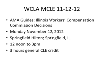 WCLA MCLE 11-12-12 • AMA Guides: Illinois Workers’ Compensation Commission Decisions • Monday November 12, 2012 • Springfield Hilton; Springfield, IL • 12 noon to 3pm • 3 hours general CLE credit Commission Decisions from 1981-2011 • 1979-1980 General Assembly debated what standards the Commission should use to determine permanency; All, including medical guidelines were rejected • HB 3250: Starting January 1, 1981, all decisions of the Commission shall set forth in writing the reasons for the decision • Until September 1, 2011, llinois Workers’ Compensation Act remained “silent” as to how the Commission was supposed to determine permanency when the injury was less than 100% loss of use of the body part Factors to Be Considered in PPD 81 IIC 001 • • • • • • • • • • • • • • • • • Occupation Age Inability to engage in certain kinds of work or activities Skill Training Pain Stiffness Spasms Limitation on motion Tenderness Atrophy Lack of coordination Soreness Diminished reflexes Dizziness Other relevant criteria “PHYSICAL IMPAIRMENT IS THE FIRST CONSIDERATION” What the Commission Says About PPD The permanent results from various types of injuries are not the same in each case nor are they static over time. Not only do permanent results of particular disabilities differ among individuals (some heal better than others, some have sufficient training and ability to return to work where others can not) but the results of injuries also change over time as medical technology and society changed. The availability of work that can be done by people with physical limitations has increased as medical and industrial technology has changed. Availability and expertise of physical and vocational rehabilitation experts is improving, and employers are increasingly willing to provide rehabilitation or different work to employees with limitations due to industrial injuries. All of these factors must be reflected in Commission decisions. As reality further changes, parties must bring in evidence of relevant medical, technological and social conditions to insure that Commission decisions accurately reflect them. (page 5) 820 ILCS 305/8.1b Determination of Permanent Partial Disability For accidental injuries that occur on or after September 1, 2011, permanent partial disability shall be established using the following criteria: (a) A physician licensed to practice medicine in all of its branches preparing a permanent partial disability impairment report shall report the level of impairment in writing. The report shall include an evaluation of medically defined and professionally appropriate measurements of impairment that include, but are not limited to: loss of range of motion; loss of strength; measured atrophy of tissue mass consistent with the injury ;and any other measurements that establish the nature and extent of the impairment. The most current edition of the American Medical Association's "Guides to the Evaluation of Permanent Impairment" shall be used by the physician in determining the level of impairment. (b) In determining the level of permanent partial disability, the Commission shall base its determination on the following factors: (i) the reported level of impairment pursuant to subsection (a); (ii) the occupation of the injured employee; (iii) the age of the employee at the time of the injury; (iv) the employee's future earning capacity; and (v) evidence of disability corroborated by the treating medical records. No single enumerated factor shall be the sole determinant of disability. In determining the level of disability, the relevance and weight of any factors used in addition to the level of impairment as reported by the physician must be explained in a written order. Commission Decisions Without Impairment Ratings Jaelene Bryan v. Pinckneyville Correctional Center 11WC047483 Terrence Davis v. City of Springfield 12WC009378 Terry Wadkins v. Pinckneyville Correctional Center 12WC002866 Cheryl Edwards v. State of Illinois (Murray Center) 12WC007449 Ricky Belton Lee, Jr. v. Chester Mental Health Center 11WC041595 Derek Richardson v. Tamms Correctional Center 12WC008263 Scott Day v. City of Bloomington 11WC047768 Jaelene Bryan v. Pinckneyville Correctional Center 11WC047483 • • • • • • • • • • • Date of Arbitration: 02/22/2012 (Granada) Accident: 12/01/2011 35 year old correctional Officer Foot caught in phone cord causing her left leg to twist & strike the floor MRI: posterior horn incomplete medial meniscus tear Symptoms: stopped running 3-7 days a week, gained 15 pounds in 3 months, walking and standing on concrete aggravated pain; concurrent employment as a photographer affected due to difficulty kneeling “Arbitrator notes that no impairment report is contained in the record. However this does not preclude the Arbitrator from making a finding of PPD, since no single factor, or lack thereof, shall be the determining factor. This interpretation of the Act has been confirmed by the unanimous vote of the Commission… ” 5% loss of use of the left leg 3-23-12 Petitioner filed Review 6-26-12 Review voluntarily dismissed FINAL? Terrence Davis v. City of Springfield 12WC009378 • • • • Date of Arbitration: 06/11/2012 (Gallagher) Date of Accident: 02/28/2012 45 year old Police Officer Hydroplaned driving on wet pavement, went through a fence and struck a pole injuring left hand and arm • Diagnosis: possible contusion of the 5th finger’s metacarpal joint • Symptoms: pain when the hand is bumped Terrence Davis v. City of Springfield 12WC009378 (cont.) • • • • • • • • “The Arbitrator initially finds that at the time of the trial counsel for both the Petitioner and Respondent waived their rights to an AMA impairment rating” “The Arbitrator is not able to use an AMA impairment rating in determining the extent of the PPD because both Petitioner and Respondent’s counsel waived their 