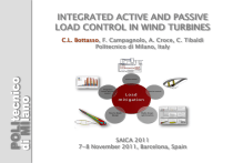 INTEGRATED ACTIVE AND PASSIVE LOAD CONTROL IN WIND TURBINES POLItecnico di MIlano C.L. Bottasso, F. Campagnolo, A. Croce, C. Tibaldi Politecnico di Milano, Italy SAICA 2011 7-8 November 2011, Barcelona, Spain Integrated Active/Passive Load Control Need for Load Mitigation Trends in wind energy: Increasing wind turbine size ▶ Off-shore wind ▼ To • • • • POLITECNICO di MILANO decrease cost of energy: Reduce extreme loads Reduce fatigue damage Limit actuator duty cycle Ensure high reliability/availability POLI-Wind Research Lab Integrated Active/Passive Load Control Presentation Outline POLITECNICO di MILANO POLI-Wind Research Lab Integrated Active/Passive Load Control Active Load Mitigation: Pitch Control Individual blade Pitch Control (IPC) Inner loop (collective pitch): regulation to set point and alleviation of gust loads Outer loops (individual pitch): reduction of - Deterministic (periodic) loads due to blade weight and non-uniform inflow - Non-deterministic loads, caused by fast temporal and small spatial turbulent wind fluctuations ▼ Uniform wind POLITECNICO di MILANO ▼ Turbulent wind POLI-Wind Research Lab Integrated Active/Passive Load Control Active Load Mitigation: Predictive LiDAR-Enabled Pitch Control LiDAR: generic model, captures realistically wind filtering due to volumetric averaging Receding Horizon Control: model predictive formulation with wind scheduled linear model, real-time implementation based on CVXGEN Non-Homogeneous LQR Control: approximation of RHC, extremely low computational cost LiDAR prediction span Reduced peak values Reduced peak values Reduced peak to peak oscillations POLITECNICO di MILANO POLI-Wind Research Lab Integrated Active/Passive Load Control Active Load Mitigation: Distributed Control Flow control devices: • TE flaps • Microtabs • Vortex generators • Active jets (plasma, synthetic) • Morphing airfoils • … (Credits: Risoe DTU) (Credits: Risoe DTU) (Chow and van Dam 2007) (Credits: Smart Blade GmbH) POLITECNICO di MILANO POLI-Wind Research Lab Integrated Active/Passive Load Control Active Load Mitigation: Limits and Issues Pitch control: • Limited temporal bandwidth (max pitch rate ≈ 7-9 deg/sec) • Limited spatial bandwidth (pitching the whole blade is ineffective for spatially small wind fluctuations) Distributed control: • Alleviate temporal and spatial bandwidth issues • Complexity/availability/maintenance Sensor-enabled control solutions: • Complexity/availability/maintenance Off-shore: need to prove reliability, availability, low maintenance in hostile environments POLITECNICO di MILANO POLI-Wind Research Lab Integrated Active/Passive Load Control Presentation Outline POLITECNICO di MILANO POLI-Wind Research Lab Integrated Active/Passive Load Control Passive Load Mitigation Passive control: loaded structure deforms so as to reduce load Two main solutions: - Bend-twist coupling (BTC): exploit anisotropy of composite materials - Swept (scimitar) blades Angle fibers in skin and/or spar caps Potential advantages: no actuators, no moving parts, no sensors Other passive control technologies (not discussed here): - Tuned masses (e.g. on off-shore wind turbines to damp nacelle-tower motions) Passive flaps/tabs … POLITECNICO di MILANO POLI-Wind Research Lab Integrated Active/Passive Load Control Objectives Present study: • Design BTC blades (all satisfying identical design requirements: max tip deflection, flap freq., stress/strain, fatigue, buckling) • Consider trade-offs (load reduction/weight increase/complexity) • Identify optimal BTC blade configuration • Integrate passive BTC and active IPC • Exploit synergies between passive and active load control Baseline uncoupled blade: 45m Class IIIA 2MW HAWT POLITECNICO di MILANO POLI-Wind Research Lab Integrated Active/Passive Load Control Presentation Outline POLITECNICO di MILANO POLI-Wind Research Lab Integrated Active/Passive Load Control Optimization-Based Multi-Level Blade Design Cost: AEP Aerodynamic parameters: chord, twist, airfoils Cost: AEP/weigh (or cost model if available) Macro parameters: rotor radius, max chord, tapering, … Cost: Blade weight (or cost model if available) Structural parameters: thickness of shell and spar caps, width and location of shear webs Controls: model-based (selfadjusting to changing design) POLITECNICO di MILANO POLI-Wind Research Lab min cost s.t. constraints When SQP converged - Definition of geometrically exact beam model - Span-wise interpolation Constraints: - Maximum tip deflection - 2D FEM ANBA analysis of maximum stresses/strains - 2D FEM ANBA fatigue analysis - Definition of complete HAWT Cp-Lambda multibody model - DLCs simulation - Campbell diagram - Compute cost (mass) Automatic 3D CAD model generation by lofting of sectional geometry Automatic 3D FEM meshing (shells and/or solid elements) Update of blade mass (cost) DLC post-processing: load envelope, DELs, Markov, max tip deflection Analyses: - Max tip deflection - Max stress/strain - Fatigue - Buckling Verification of design constraints POLITECNICO di MILANO POLI-Wind Research Lab Constraint/model update heuristic (to repair constraint violations) “Coarse” level: 2D FEM section & beam models SQP optimizer - ANBA 2D FEM sectional analysis - Computation of 6x6 stiffness matrices “Fine” level: 3D FEM Integrated Active/Passive Load Control Definition of sectional design parameters Integrated Active/Passive Load Control 2MW 45m Wind Turbine Blade Currently undergoing certification at TÜV SÜD CNC machined model of aluminum alloy for visual inspection of blade shape Design developed in partnership with Gurit (UK) POLITECNICO di MILANO POLI-Wind Research Lab Integrated Active/Passive Load Control Presentation Outline POLITECNICO di MILANO POLI-Wind Research Lab Integrated Active/Passive Load Control Fully Coupled Blades 1. Identify optimal section-wise fiber rotation Consider 6 candidate configurations Skin angle Spar-cap angle BTC coupling 