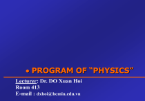 PROGRAM OF “PHYSICS” Lecturer: Dr. DO Xuan Hoi Room 413 E-mail : dxhoi@hcmiu.edu.vn PHYSICS 4 (Wave and Modern Physics) 02 credits (30 periods) Chapter 1 Mechanical Wave Chapter 2 Properties of Light Chapter 3 Introduction to Quantum Physics Chapter 4 Atomic Physics Chapter 5 Relativity and Nuclear Physics References : Halliday D., Resnick R. and Walker, J. (2005), Fundamentals of Physics, Extended seventh edition. John Willey and Sons, Inc. Alonso M. and Finn E.J. (1992). Physics, AddisonWesley Publishing Company Hecht, E. (2000). Physics. Calculus, Second Edition. Brooks/Cole. Faughn/Serway (2006), Serway’s College Physics, Brooks/Cole. Roger Muncaster (1994), A-Level Physics, Stanley Thornes. http://ocw.mit.edu/OcwWeb/Physics/index.htm http://www.opensourcephysics.org/index.html http://hyperphysics.phyastr.gsu.edu/hbase/HFrame.html http://www.practicalphysics.org/go/Default.ht ml http://www.msm.cam.ac.uk/ http://www.iop.org/index.html . . . PHYSICS 4 Chapter 2 Properties of Light A. WAVE OPTICS The Nature of Light Interference of Light Waves Diffraction Patterns Polarization B. GEOMETRIC OPTICS Light Rays The Laws of Reflection and Refraction Mirrors Thin Lenses A. WAVE OPTICS The Nature of Light Interference of Light Waves Diffraction Patterns Polarization 1 The Nature of Light 1.1 Dual nature of light • In some cases light behaves like a wave (classical E & M – light propagation) • In some cases light behaves like a particle (photoelectric effect) • Einstein formulated theory of light: E hf h 6.63 10 34 J s Planck’s constant 1.2 Huygens’s Principle Light travels at 3.00 x 108 m/s in vacuum (travels slower in liquids and solids) In order to describe propagation: Huygens method : All points on given wave front taken as point sources for propagation of spherical waves Assume wave moves through medium in straight line in direction of rays 2 Interference of Light Waves 2.1 Conditions for interference light sources must be coherent (must maintain a constant phase with each other) sources must have identical wavelength superposition principle must apply 2.2 Young’s Double-Slit Experiment • Setup: light shines at the plane with two slits • Result: a series of parallel dark and bright bands called fringes In phases Opposite phases Interference of Sinusoidal Waves y 1 A sin(t Kd 1 ) ; y 2 A sin(t Kd 2 ) ; K y y1 y 2 A sin(t Kd 1 ) A sin(t Kd 2 ) 2 A sin(t Kd1 ) sin(t Kd 2 ) d1 d 2 d d1 2A cos K 2 sin( t K ) 2 2 Amplitude of y depends on the path difference : = d2 - d1 Amplitude of y maximum : M d 2 d1 d d1 K k ; cos K 2 1 ; 2 2 2k d 2 d1 ; d 2 d1 k 2 / Amplitude of y equal to 0 : d1 S1 1 d 2 d1 (k ) 2 d2 S2 The path difference in Young’s Double-Slit Experiment d1 d2 d 2 d1 d sin d tan y d L Positions of fringes on the screen d sin Bright fringes (constructive interference) : d L y BRIGHT k ; y BRIGHT k ki L d Dark fringes (destructive interference) : 1 d 1 y DARK (k ) ; y DARK k i 2 L 2 L i d Angular Positions of Fringes y d L Bright regions (constructive interference) : d sin k Dark regions (destructive interference) : 1 d sin (k ) 2 PROBLEM 1 A viewing screen is separated from a doublelit source by 1.2 m. The distance between the two slits is 0.030 mm. The second-order bright fringe is 4.5 cm from the center line. (a) Determine the wavelength of the light. SOLUTION (a) The position of second-order bright fringe : L L y2 k 2 d d dy 2 (3.0 105 m )(4.5 10 2 m ) 2L 2(1.2 m ) 5.6 107 m 560 nm PROBLEM 1 A viewing screen is separated from a doublelit source by 1.2 m. The distance between the two slits is 0.030 mm. The second-order bright fringe is 4.5 cm from the center line. (b) Calculate the distance between adjacent bright fringes. SOLUTION L L L (b) y k 1 y k (k 1) k i d d d L (5.6 107 m )(1.2 m ) i 2.2 cm 5 d 3.0 10 m PROBLEM 2 A light source emits visible light of two wavelengths: 430 nm and 510 nm. The source is used in a double-slit interference experiment in which L = 1.5 m and d = 0.025 mm. Find the separation distance between the third order bright fringes. SOLUTION L (1.5 m )(430 109 m ) 2 y3 3 3 7.74 10 m 3 0.025 10 m d L (1.5 m )(510 109 m ) 2 y 3' 3 ' 3 9.18 10 m 3 0.025 10 m d y y 3' y 3 9.18 102 m 7.74 102 m 1.40 102 m 1.40 cm PROBLEM 3 SOLUTION 2.3 Intensity distribution of the double-slit. Interference pattern light : electromagnetic wave • suppose that the two slits represent coherent sources of sinusoidal waves : the two waves from the slits have the same angular frequency • assume that the two waves have the same amplitude E0 of the electric field at point P d1 d2 At point P : E 1 E 0 sin(t Kd1 ) ; E 2 E 0 sin(t Kd 2 ) ; K 2 d1 d 2 d 2 d1 E E 1 E 2 2E 0 cos K sin(t K ) 2 2 d d Amplitude of E : 2E 0 cos K 2 1 2E 0 cos K 2 2 d1 d2 At point P : d 2 d 1 2E cos K Amplitude of E : 2E 0 cos K 0 2 2 The intensity of a wave is proportional to the square of the electric field magnitude at that point : I I 0 cos 2 K d 2 d1 d sin d sin I I 0 cos 2 y sin tan ; L dy I I 0 cos L 2 2 2 d sin I I 0 cos 2 2 The intensity maximum : dy d sin n n ; L L sin n ; y n d d d1 d2 PROBLEM 4 SOLUTION PROBLEM 4 SOLUTION I PROBLEM 4 SOLUTION PROBLEM 4 SOLUTION I 2.4 INTERFERENCE IN THIN FILMS • Interference effects are commonly observed in thin films, such as thin layers of oil on water or the thin surface of a soap bubble • The varied colors observed when white light is incident on such films result from the interference of waves reflected from the two surfaces of the film a. Change of phase due to reflection Interference pattern with Lloyd’s mirror P’ is equidistant from points S and S : the path difference is zero bright fringe at P’ ? We observe a dark fringe at P’ There a 180° phase change produced by reflection CONCLUSION : an electromagnetic wave undergoes a phase change of 180° upon reflection from a medium that has a higher index of refraction than the one in which the wave is traveling. Change of phase due to reflection 180° phase change No phase chang