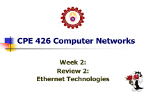 CPE 426 Computer Networks Week 2: Review 2: Ethernet Technologies TOPICS 1. ALOHA 2. CSMA/CD Chapter 14: 14.6.1 Chapter 14: 14.6.2-14.6.3 3. Ethernet Technologies Chapter 15: 15.1-15.13 TOPICS 4. Repeater/Bridges 5. SPT Chapter 17: 17.1-17.6 Chapter 17: 17.7-17.8 6. VLAN Chapter 17: 17.9-17.11 TOPICS 7. WLAN 8. Routing/Algorithm Chapter 18: 18.1-18.14 9. X.25/FR/ATM/MPLS/ISDN Chapter 16: 16.1-16.11 Chapter 19: 19.1-19.4 ALSO Reference From CPE 326 (Stalling Book) Review Ethernet Technologies IEEE 802 IEEE 802.1 Management IEEE 802.1D Spanning Tree IEEE 802.1Q VLAN Tag IEEE 802.1X อื่นๆ IEEE 802.2 LLC IEEE 802.3 Ethernet IEEE 802.11 WLAN Network types Range LAN 1-2 kms WAN worldwide MAN 2-50 kms Wireless LAN 0.15-1.5 km Wireless WAN worldwide Internet worldwide Bandwidth (Mbps) Latency (ms) 10-1000 0.010-600 1-150 2-11 0.010-2 0.010-2 1-10 100-500 10 5-20 100-500 100-500 ALOHA System ้ ดลองการทา Multiple เป็นระบบทีใ่ ชท Access(Random Access) ของ Packet Radio System จากการวิจ ัยพบว่า Efficiency ของระบบ มีได้ สูงสุด 18% 1970 University of Hawaii ถ ้าใช ้ Slotted ALOHA จะได ้ถึง 36% ค่านีเ้ ป็นค่าสูงสุดในทางทฤษฏี ึ ษาวิจ ัย ALOHA นาไปสูก ่ ารพ ัฒนา การศก CSMA ซงึ่ ถูกนาไปใชเ้ ป็นครงแรกใน ั้ Ethernet ให ้ฟั งก่อนทีจ ่ ะสง่ Pure ALOHA Slotted ALOHA Local Area Networks Smaller scope Building or small campus Usually owned by same organization as attached devices Data rates much higher Usually broadcast systems Now some switched systems and ATM are being introduced LAN Configurations Switched Switched Ethernet May be single or multiple switches ATM LAN Fibre Channel Wireless Mobility Ease of installation IEEE 802 v OSI LAN Topologies Frame Transmission on Bus LAN CSMA ใน BUS Ethernet Carrier Sense Multiple Access ่ ข้อมูล ให้ฟง 1. ก่อนสง ั ก่อนว่ามีใครกาล ัง ่ ได้ ใช ้ Channel หรือไม่ ถ้าไม่มใี ห้สง มิฉะนนให้ ั้ รอจนกว่า Channel จะว่าง ถึง ่ ได้ สง ปัญหา ถ ้ามีผู ้รอสง่ มากกว่าหนึง่ คน เมือ ่ สายว่าง คน เหล่านั น ้ จะสง่ ข ้อมูลออกมา และชนกัน เราต ้องการกลไกเพิม ่ เติม ในการตรวจจับการชน กันและจัดการ เรียก Collision Detection(CD) CD or Collision Detection ่ ข้อมูลให้ทาการฟังด้วย ถ้าข้อมูล 2. ในขณะทีก ่ าล ังสง ่ แสดงว่าเกิดการชนก ัน ให้ ทีฟ ่ ง ั ได้ไม่เหมือนก ับทีส ่ ง ั ่ ท ันที พร้อมทงส ่ สญญาณบอกสถานี หยุดสง ั้ ง อน ื่ ว่าได้ม ี ้ (Jamming Signal) การชนก ันเกิดขึน 3. หยุดรอเป็นระยะเวลา Random และลองใหม่ (กล ับไปย ังข้อ 1) 4. ถ้ามีการชนก ันติดต่อก ัน แต่ละครงที ั้ ห ่ ยุดรอ ให้จ ับ เลข Random ทีม ่ ค ี า ่ Standard Deviation เป็นสอง เท่า เรียก Binary Exponential Back-Off 5. ถ้าจานวนครงที ั้ ช ่ นก ัน ติดต่อก ันเกินกาหนด ให้เลิก ่ ข้อมูลและ Report ไปย ังผูส ่ ล้มการสง ้ ง ขบวนการรวมเรียก CSMA/CD Notes on CSMA/CD เพือ ่ ทีจ ่ ะให้ CD สามารถทางานได้ ข้อมูลต้อง ่ เป็นจานวนมากพอ สง เพือ ่ ป้องก ันไม่ให้ผใู ้ ดผูห ้ นึง่ ใช ้ Channel นาน เกินไป จะต้องมีการกาหนดค่า MTU (Maximum Transfer Unit) ใน Ethernet กาหนดให ้ขนาดของ Frame ทีส ่ ง่ อย่างตา่ ต ้องมีความยาว 64 Octet(512 Bit) Ethernet กาหนดขนาด Frame สูงสุดคือ 1518 Octet โดยสว่ น Payload จะมีขนาดสูงสุดคือ 1500 Octet ่ ไปหนึง่ Frame แล้ว จะสง ่ อีก เมือ ่ คนหนึง่ สง ่ Frame ต่อเลยไม่ได้ ต้องรอว่ามีใครต้องการสง ่ หรือเปล่า (Inter-Frame Gap) ถ้าไม่มจ ี งึ สง Frame ต่อไปได้ Star Topology Each station connected directly to central node Central node can broadcast Usually via two point to point links Physical star, logical bus Only one station can transmit at a time Central node can act as frame switch 802 Layers Physical Encoding/decoding Preamble generation/removal Bit transmission/reception Transmission medium and topology 802 Layers Logical Link Control Interface to higher levels Flow and error control Logical Link Control Transmission of link level PDUs between two stations Must support multiaccess, shared medium Relieved of some link access details by MAC layer Addressing involves specifying source and destination LLC use