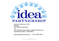 Joanne Cashman, Ed.D. Director The IDEA Partnership at The National Association of State Directors of Special Education ( NASDSE) www.ideapartnership.org 1-877-IDEA INFo IDEA Partnership@NASDSE 2013 1 Get In the Picture: Connecting with Efforts to Improve Community and Employment Outcomes National Transition Community of Practice Webinar Team: • Joan Kester, Senior Research Associate, George Washington University, Mid-Atlantic Technical Assistance & Continuing Education Center • Linda Tasco, Director of Program Services at Dept. of Economic Security/Division of Developmental Disabilities, Arizona • Melissa Flor, Special Education Program Specialist, SD Department of Education • National Association of State Directors of Special Education, IDEA Partnership staff: • Mariola Rosser, Senior Project Associate • Joanne Cashman, Director • Mironda Shepard, Project Assistant March 27, 2013 IDEA Partnership@NASDSE 2013 2 nd 2 in a 3 Part Webinar Series • First Webinar: February 20, 2013 2:00 – 3:30 PM ET - Get the Picture: Life after schooling for students with moderate and significant disabilities: http://tadnet.adobeconnect.com/p4jg930ee05/ . • This Webinar: Get in the Picture: Connecting with Efforts to Improve Community and Employment Outcomes • 3rd Webinar: April 24, 2013 2:00 – 3:30 PM ET - Change the Picture: A Shared Commitment to Improving Futures, Access information: Adobe Connect link: http://tadnet.adobeconnect.com/nsttac/, Dial: 1800-201-2375, Participant code: 611914# IDEA Partnership@NASDSE 2013 3 Purpose of this Webinar • This webinar will showcase many exciting national initiatives which promote integrated, competitive employment for transitioning youth with disabilities. Participants will learn about the goals of each initiative, crossstakeholder engagement, how to connect to state and local projects, where to tap into resources, and have an opportunity for dialogue. IDEA Partnership@NASDSE 2013 Employment Initiatives Get in the Picture by learning about these employment initiatives: • National Governor’s Association’s A Better Bottom Line: Employment of People with Disabilities • Council of State Administrators of Vocational Rehabilitation Transition and Employment Priorities • Administration on Developmental Disabilities Systems Change Projects • Employment First • Social Security Administration: Youth Demonstration Projects • Substance Abuse and Mental Health Administration efforts IDEA Partnership@NASDSE 2013 A Better Bottom Line: Employing People with Disabilities NGA Chair’s Initiative 2012-13 Delaware Governor Jack Markell March 2013 Lauren Stewart, Senior Policy Analyst National Governors Association IDEA Partnership@NASDSE 2013 IDEA Partnership@NASDSE 2013 What are we doing? Work to date: Sessions with Governors at the NGA Winter Meeting; Two experts roundtables; Over 50 meetings with subject matter experts July 2012-present. IDEA Partnership@NASDSE 2013 What are we learning? I. Integrate disability employment within mainstream II. Raise expectations for persons with disabilities III. Share responsibility for moving the needle IDEA Partnership@NASDSE 2013 What are states doing now? NGA Framework to Governors: Making this part of the state workforce strategy • Employment First • States as Leaders and Model Employers Early Intervention and High Expectations • Youth transition and culture change Ending ‘train and pray’ by securing employer partners • Pathways to Employment initiative in Minnesota • ConnectAbility IDEA Partnership@NASDSE 2013 Where are we going? Upcoming events: Two State Policy Institutes and a Blueprint to Governors to be released at the Annual Meeting, capturing what we’ve learned and outlining a framework for action going forward. IDEA Partnership@NASDSE 2013 How can you support this work? • Use your connections to students to set high expectations for individuals with disabilities. Old expectation: “Will I get a job? New expectation: “What job will I get?” • Engage your own networks to promote awareness about the skills and abilities of people with disabilities • Consider each state’s policy framework and align your efforts to the maximum extent possible IDEA Partnership@NASDSE 2013 A Better Bottom Line: Employing People with Disabilities Lauren Stewart Senior Policy Analyst National Governors Association March 2013 IDEA Partnership@NASDSE 2013 lstewart@nga.org | 202.624.5332 Vocational Rehabilitation (VR) Andrea Guest, Chair, CSAVR Transition Services Committee & Executive Director, DE Division of Vocational Rehabilitation Joan Kester, Senior Research Associate, George Washington University, Mid-Atlantic Technical Assistance & Continuing Education Center IDEA Partnership@NASDSE 2013 Overview of VR Initiatives The purpose of the Rehab. Act and VR program nationally is to empower individuals with disabilities to maximize employment, economic self-sufficiency, independence, and inclusion and integration into society • Council of State Administrators of VR (CSAVR): Transition Services Committee • CSAVR VR-Business Network • Examples of Employment Initiatives – Delaware Early Start Supported Employment – Mid-Atlantic Transition Leadership Council – Models of Replication IDEA Partnership@NASDSE 2013 CSAVR Transition Services Committee: National Efforts • VR recognizes transition as a priority • Federal monitoring – one of the 3 focus areas. • White paper on transition – legislative impact (career development phase) • Committee focus to share best practices in transition to employment White paper: http://www.google.com/url?sa=t&rct=j&q=&esrc=s&source=web&cd=4&cad=rja&ved =0CEsQFjAD&url=http%3A%2F%2Fwww.rehabnetwork.org%2Fcommittees%2F10%2Ft s%2FCSAVR%2520Position%2520Paper%2520on%2520%2520Transition%2520Services. docx&ei=eDlDUbPsHoXF4APxr4D4Ag&usg=AFQjCNE_2ERZ0fnQDLPKDgjww82T1CTdxA &sig2=FUOvvDg9B4RPBkiTszO-Ng&bvm=bv.43828540,d.dmg How to connect: CSAVR Website,