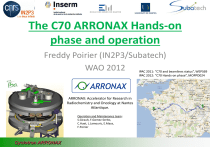 The C70 ARRONAX Hands-on phase and operation Freddy Poirier (IN2P3/Subatech) WAO 2012 IPAC 2011: “C70 and beamlines status”, WEPS69 IPAC 2012: “C70 Hands-on phase”, MOPPD024 ARRONAX: Accelerator for Research in Radiochemistry and Oncology at Nantes Atlantique. Operation and Maintenance team: S.Girault, F.Gomez-Serito, C.Huet, L.Lamouric, E.Mace, F.Poirier Cyclotron ARRONAX Historical Background Inauguration in 2008 24h tests in 2010 750 mA 24 h Machine reception (2010) and handson phase phase (2011-12) • October 2008 : Inauguration • March 2010: Low intensity Irradiation • October 2010: 24h at 750 pmA on beam dumps • Dec. 2010: Final machine reception • 2011-12: Hands-on phase with an extended program on tuning and exploration of beam parameters for users. ARRONAX goal • A tool to produce radionucleides for research in nuclear medecine – – • Imaging: + radioelements for PET (ex: 82Sr/82Rb, 44m/44Sc, 52Fe, 64Cu ...) Therapy: immunotherapy (211At), - radioelements : 67Cu, 47Sc un outil pour la recherche en radiochimie – notamment radiolyse alpha de l’eau (stockage des déchets nucléaires) Radioelement for therapy • un outil pour la recherche en Physique Target irradiation – notamment étude des matériaux sous rayonnement Particles Beam Production of radioelements – Développement de système de détection In the target by transmutation – Mesures de données nucléaires Acceleration • un outil pour la formation – Université de Nantes – École des mines de Nantes – CHU de Nantes – Radioactive Formation continue • Tomographic imaging of the heart Chimical extraction Separation Purification Marking medical un site de production industrielle pour les besoins médicaux element (experimental) Cyclotron ARRONAX 99Tc-MIBI SPECT 82Rb-PET ARRONAX goal • A tool to produce radionucleides for research in nuclear medecine – – • Imaging: + radioelements for PET (ex: 82Sr/82Rb, 44m/44Sc, 52Fe, 64Cu ...) Therapy: immunotherapy (211At), - radioelements : 67Cu, 47Sc A tool for radiochimistry/radiobiology research – notably alpha radiolyse of water (eg nuclear waste storage) • un outil pour la recherche en Physique – notamment étude des matériaux sous rayonnement – Développement de système de détection – Mesures de données nucléaires • un outil pour la formation – – – – • Université de Nantes École des mines de Nantes CHU de Nantes Formation continue un site de production industrielle pour les besoins médicaux Cyclotron ARRONAX ARRONAX goal • A tool to produce radionucleides for research in nuclear medecine – – • Imaging: + radioelements for PET (ex: 82Sr/82Rb, 44m/44Sc, 52Fe, 64Cu ...) Therapy: immunotherapy (211At), - radioelements : 67Cu, 47Sc A tool for radiochimistry/radiobiology research – notably alpha radiolyse of water (eg nuclear waste storage) • A tool for physics research – Particularly studies of material under irradiation – Development of detection system – Measurements of nuclear data • Experience « Stacked Foils » Cross section measurements: exemple from 17 to 69 MeV- (100 nA) un outil pour la formation – Université de Nantes PIXE - –Particle Induced X-ray Emission École des mines de Nantes - Non destructive Caracterisation Method – CHU de Nantes – Formation continue quantitative of multielements material, - Dvt of mesuring bench un site de production industrielle pour les besoins médicaux - •( ~nA) Ti naturel + p 43Sc + X Cyclotron ARRONAX ARRONAX goal • A tool to produce radionucleides research in nuclear medecine – – • Imaging: + radioelements for PET (ex: 82Sr/82Rb, 44m/44Sc, 52Fe, 64Cu ...) Therapy: immunotherapy (211At), - radioelements : 67Cu, 47Sc A tool for radiochimistry/radiobiology research – notably alpha radiolyse of water (eg nuclear waste storage) • A tool for physics research – Particularly studies of material under irradiation – Development of detection system – Measurements of nuclear data • A tool for training and education – – – – • University of Nantes École des mines of Nantes CHU (accademic hospital) of Nantes Permanent and dedicated trainings An industrial production site for medical needs Cyclotron ARRONAX • • C70 Cyclotron build by IBA: Characteristics Extracted Energy Highest – Isochron cyclotron with 4 sectors range possible Particles current • RF: 30.45 MHz (MeV) (µAe) • Acceleration Voltage: 65 kV H+ 30 - 70 375 x 2 • Max magn. field : 1.6T He2+ 70 70 HH+ 35 50 – ~4m of diameter D+ 15 - 35 50 – Max kinetic energy/n: 30-70 MeV – Normalised emittance before extraction: gex=~4p mm mrad (simulation) most common current range (µAe) 0.05 – 80 x 2 0.07 – 0.1 0.1 – 1 0.05 – 1.2 Nb of particles / bunch at 1 µAe 205 103 102 103 410 103 205 103 Main additional elements: – 2 Multiparticle sources. • Multicusp (H-,D-) with multiple magnets, 5mA max. • Supernanogan ECR ion source (He2+,HH+) – Injection: Series of magnetic elements (glaser, steerer, quad.) on the top of the cyclotron to adapt the beam to the entrance of the cyclotron, and finally the spiral inflector – Extraction: stripper (-) or electrostatic deflector (+) 2 strippers: carbon He2+, HH+ H-, D- based foils, eff=~95% H+ He2+ H+ 1 deflector: cyclotron inflector 66kV,eff<<90% Beamlines Today 6 vaults, around the cyclotron, accomodate the beamlines Beamline with irradiation station accomodating rabbits with samples Beamline for neutronic activator 3 beamlines are dedicated to low current (<1.2mA) in the same vault 1 of these is a top-bottom line with a vertical dipole Beamlines: • 8 in total – 5 dedicated to average and high current – 3 dedicated to low (or very low) current Cyclotron ARRONAX How we do business (1) GMO: 6 persons 3 have more than 3 years of experience and are “senior operators” • • • Operators deal with basically every aspects of the accelerator: Operation, maintenance, users, developments 