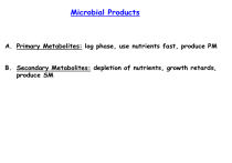 Microbial Products A. Primary Metabolites: log phase, use nutrients fast, produce PM B. Secondary Metabolites: depletion of nutrients, growth retards, produce SM Primary Metabolites: Vitamins Vitamins: cannot be synthesized by higher organisms But microorganisms are capable of synthesizing (gut) Studies reveal vitamin deficiencies Thiamine Reported beneficial health effects Riboflavin Growing vitamin market demand (cost Pyridoxine effective) Folic acid Genetically engineered MO as alternatives to Pantothenic acid chemical synthesis Biotin Vitamin B12 Ascorbic acid b- carotene (provitamin A) Ergosterol (vitamin D) Vitamins Fat soluble Carotenoids b-carotene (provitamin A) Astaxanthin Poly unsaturated Fatty acids (PUFA; vitamin F) Docosahexaenoic acid (DHA) Arachidonic acid (ARA) Ergosterol (vitamin D) Water soluble Riboflavin (vitamin B2) Cobalamin (vitamin B12) L-Ascorbic acid (Vitamin C) R-Pantothenic acid (vitamin B5) D-Biotin (vitamin H or B7) Vitamin B1 (Thiamine) Vitamin B6 (pyridoxol) Folic acid Vitamin B12 or Cyanocobalamin • Water soluble vitamin ; complex sructure • Has role in functioning of brain and nervous system, formation of blood • Contains rare element cobalt • Deficiency causes pernicious anemia which is an causes low Hb, less RBCs • Pernicious anemia: autoimmune disorder, parietal cells (stomach) responsible for secreting intrinsic factor are destroyed. Intrinsic factor is crucial for the normal absorption of B12, so a lack of intrinsic factor, as seen in pernicious anemia, causes a deficiency of Vitamin B12 • dietary reference intake for an adult ranges from 2 to 3 µg per day • used in treating cyanide poisoning, prevents brain atrophy in Alzheimer’s patients • COMMON INGREDIENT IN ENERGY DRINKS C63 H88 CoN14 O14P Pyrrole nitrogen 4 Pyrrole units cobinamide • Corrin ring • Deep red colour due to corrin ring • Central Co atom • Coordination state 6 • 4 of 6 coord sites have pyrrole ring • 5 has dimethylbenzimidazole group • 6 is center of reactivity, variab;e • CN, OH, Me, 5-deoxyadenosyl for 4 types of B12 nucleotide 6 2 1 3 4 5 5,6-dimethyl benzimindazole Commercial production Chemical syn not feasible Genera known to produce vit B12 Most commonly used for industrial production are 20mg/L Streptomyces griesus Pseudomonas denitrificans (aerobic) Salmonella typhimuriu (anaerobic) Propionibacterium shermanii GRAS by FDA (anaerobic) (Generally Regarded As Safe) Sanofi-Aventis (FRENCH) use genetically engineered versions to produce vit B12 under specialized conditions from Propionibacterium since they have no endotoxins or exotoxins P. denitrificans also used after strain modification; mutant more efficient than wild type Commercial production • Produced in continuous culture with 2 fermenters in series Addition of 5,6dimethylbenzimidazol (0.1%) Glucose Corn steep Betaine (5%) Cobalt (5ppm) pH 7.5 + Propionibacterium freudenreichii Anaerobic 70h Aerobic 50h Cobinamide production and accumulation KCN added CYNACOBALAMIN 80% purity Used as feed additive Betaine: sugar beet molasses Filtrate Nucleotide synthesized Combined with cobinamide To yield 2ppm of cobalamin Acidification of culture To 2-3pH/ 100oC Filter to remove cell debris Commercial production ANAEROBIC PHASE AEROBIC PHASE 2-4 DAYS 5-deoxyadenosylcobinamide produced 5,6-dimethylbenzimidazole is added and gets incorporated to form 5’-deoxyadenosylcobalamin During the 7-day fermentation run, adenosylcobalamin is predominantly secreted from the biomass and accumulates in the fermentation broth in milligram amounts. The down- stream steps comprise filtration, cyanide treatment, chromatography, extraction, and crystallization yielding vitamin B12 in high purity. If to be used for treatment further purification (95-98% Purity) Commercial production Pseudomonas denitrificans: strain improvements resulted in increase in yeild From 0.6mg/L to 60mg/L Glucose : common carbon Alcohols (methanol, ethanol, isopropanol) Hydrocarbons(alkanes, decane, hexadecane) With methanol 42mg/L was obtained using Methanosarcina barkeri Riboflavin (Rf) or Vitamin B2 • • • • • Water soluble Essential for growth and reproduction; key role in energy metabolism, ketone bodies, fats, CHO and protein metabolism Deficiency leads to cheliosis (fissures around mouth), glossitis (purple tounge) and dermatitis Required in coenzymes FAD (flavin adenine dinucleotide) and FMN (flavin mononucleotide) Used as an orange-red food colour additive, designated in Europe as E101 7,8-dimethyl-10- (D-19-ribityl) isoalloxazine Participates in O-R reactions Flavin is ring moiety with yellow colour to oxidized form Isoalloxazine ring Isoalloxazine ring H H Ribitol FAD E101 FMN E101a genes encoding the riboflavin biosynthetic enzymes are well conserved among bacteria and fungi INDUSTRIAL USE Processed food is often fortified by the use of riboflavin as a colorant or vitamin supplement. The main application (70%) of commercial riboflavin is in animal feed, since productive livestock, especially poultry and pigs, show growth retardation and diarrhea in case of riboflavin deficiency. According to a report by SRIC, a consulting company in Menlo Park (California), in 2005 the need for industrially produced riboflavin was estimated at 6500–7000 tons per year. Commercial production Glucose 1/3rd production by direct fermentation Acetone butanol fermentation Clostridium acetobutylicum C. butylicum riboflavin as by product 50% by biotransformation using Bacillus pumulis D-ribose 20% production by Chemical synthesis Riboflavin Ashbya gossypii Candida famata Bacillus subtillis (genetically modified) Commercial production Phase I use of glucose, accumulation of pyr, pH acidic, growth stops, no Riboflv Phase II decr pyr, incr in ammonia, alkalinity incr, prod of Riboflv in form of FAD and FMN Phase III autolysis, cell disruption, release of free FAD, FMN and riboflv Carbon sources: glucose, acetate, methanol, aliphatic hydrocarbons