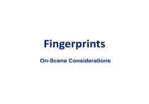 Fingerprints On-Scene Considerations Types of Fingerprints Latent Prints Patent Prints Smudged Invisible Visible Treatments to Visualize Enhancement Generally Surface Dependent Plastic Prints Malleable Surface Chewing gum Wet soap Candy Types of Fingerprints Patent Prints Contamination Positive Transfer Blood Dust Soot Oils Prints of the Ridges Patent prints Prints in Dust Capturing prints in dust Lift dust with gel or electrostatic lifter removes some of the material leaving a void which is visible Question – if a finger is pressed onto a dusty surface and lifted using a gel or electrostatic lifter, what is lifted and what remains? Types of Fingerprints Plastic Prints Fresh print Substances that melt easily or soften Chocolate Adhesive tape Thick layers of dust Plastic explosives Putty Candle/sealing wax Fats/flour/soap/sticky oily films/tar/pitch/clay Negative Transfer Prints of the Grooves WHY? Plastic prints A type of Patent print • Negative impression of ridge formation – Results from contact of finger with soft substance • Clay, fresh paint – Ridges impressed into surface – Creates negative impression of the ridges – Ridges are deeper than surrounding area • Photograph with oblique lighting & close-up lens before further processing • Cast of impression can be made @ lab – First spray with release agent – Cast impression with silicone casting material: Mikrosil – Cast can be made at scene Cast Print from Soap Plastic Print Finger Presses into Chewing gum + Groove of Fingerprint Ridge of Fingerprint Negative Print Chewing Gum Presses into Soft Gum Not Pressed into Soft Gum Latent Prints Invisible Prints Found on non-porous & porous surfaces Smooth or textured surfaces Paper Fabrics Metals Plastics Visible only after development Latent Prints Latent Prints Fingers Covered with small amount of grease/sweat/dirt transferred to surface as a ridge impression Contamination Blood Dust Soot Oils Positive Transfer WHY? What is the difference between a Latent & Patent Prints? Exemplars Inked/Digital Prints from Known Persons Digitized Scans from Glass Inked Impressions person’s fingers & thumbs in ink and then pressed onto a fingerprint card Toes & soles of feet also yield prints Palm prints can be valuable Fingerprint cards can be classified Manually Modified Henry System Other classification systems Semi-automatically AFIS/IAFIS Information from Fingerprints Time print had been on surface? No – not reliably Check when surface last cleaned o Method had to have removed existing fingerprints Sex, race or occupation? No – not reliably IR imaging Fatty Acid analysis Drugs Classifying Fingerprints Classifying Fingerprints Historically The Henry System 1 2 3 4 5 6 7 8 9 10 Left little Left ring Left middle Left index Left thumb Right little Right ring Right middle Right index Right thumb Numerator Left little 1 Left middle 2 Left thumb 4 Right ring 8 Right index 16 Denominator Left ring 1 Left index 2 Right little 4 Right middle 8 Right thumb 16 Odd-numbered fingers count for the numerator. Even-numbered fingers count for the denominator. If a whorl appears on a finger, the value in the box is added to either the numerator or the denominator. The primary classification is calculated using these values and then adding 1 to both numerator and denominator. The values for the primary classification may then range from 1/1 (zero whorls) to 32/32 (10 whorls). Comparing Latent Fingerprints With Exemplars Fingerprint Identification The Basis of Comparison Fingerprint Classification AFIS Searches millions of records in relatively short time. Provides a list of possible matches Still need a person to make the final ID Manually compares 10 best matches AFIS How It Works Fingerprint Quality at the Scene Deposition Mechanism and Other Factors Nature and cleanliness of Environment Weather conditions surface Sweat glands more Amount of contaminant active in warm Pressure applied weather o Heat Movement during o Humidity transfer o Freeze-thaw cycles Condition of the friction » Fragmented by condensing ridge detail moisture Finding Fingerprints at the Scene Latent and patent fingerprints can be anywhere and everywhere. The problem is locating those that are latent and then developing them. Transportable evidence with fingerprints should be taken to the latent print laboratory. Some prints need to be developed @ the scene Creates the problem of finding fingerprints with probative value. Scene dictates where to find probative fingerprints. Waste of time to. memorize the list … most important items there are the last two points on the right : Use your imagination Be the burglar (perpetrator). This is when a search for probative prints pays off. The Scene is the Ultimate Guide • Point of entry – Broken entry • Prints (including shoe prints) – Lock – Immediate surrounds – Window • Pieces of broken glass – May have blood – May have been tossed aside to conceal entry • Windowsill window jam • Tables used to support weight • Floor where burglar knelt Trace the path Where eaten/drink Glass & china are good targets of prints Can discard gloves Light switches Circuit breakers/fuses/light bulbs loosened Areas where gloves were a hindrance Toilet-flush lever Tools left behind Flashlight batteries Latex gloves General surfaces Fabrics Use your imagination … BE THE BURGLAR Search is an intellectual exercise. The thought process might go something like, “What would I touch if I were the scumbag who did this? Fingerprints occur in three forms: latent (invisible), patent (visible) and impression or plastic Sub-category of patent prints Ridge detail impressed into a malleable material is visible. Smudged prints Sub-category of latent and patent prints, Little or no discernible friction ridge detail. DNA from smudged prints … will be increasingly important as investigative tool. Types of Fingerprints Latent Prints Patent Prints Smudged Invisible Visible Treatments to Visu