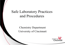 Safe Laboratory Practices and Procedures Chemistry Department University of Cincinnati Outline • • • • • • • Emergency Procedures Required Procedures Safe Laboratory Practices Chemical Hazard and Risk Information Gas Cylinders Horror Stories Future Safety Plans Emergency Response Plan • • • • All personnel must begin evacuation at once. Pull the manual fire alarm, if building is not already in alarm to alert all occupants. Call 9-1-1 once outside the building. Take any valuable personal items. As you leave the laboratory or office, quickly check to determine if all co-workers have begun to evacuate. The last person out should close, but not lock the door to the laboratory. All personnel must familiarize themselves with the most rapid means of escape from their laboratory or office. Evacuation maps are posted in hallways near the elevators. • • • • • • An alternative means of escape should also be noted for those emergencies where the first exit is blocked. Never use the elevators if a fire alarm activates; take the stairs instead. Once you have evacuated the building, assemble at designated areas to enable safety monitors to ensure everybody has evacuated. Assemblage areas are outside Crosley Tower on the second floor, outside Reveischl Hall on the fourth floor or the sixth floor. Designated Safety Monitors (faculty) will ensure their assigned areas are evacuated. You cannot enter the building until given permission by Emergency Response Personnel. A. Fire Emergency: Controllable Fire • • • • • • Pull the manual fire alarm, if building is not already in alarm to alert all occupants. Call 9-1-1 once outside the building. Notify everyone in the immediate area of the danger. Non-essential personnel should evacuate the area. You may fight the fire yourself if: a) You have been trained in the use of fire extinguishers, b) the fire is small (size of a wastebasket) and confined to a specific area (such as a fume hood), c) you are reasonably certain that the fumes that are generated are not toxic d) you have a clear means of escape if the fire proves to be out of your control. Never turn your back on a fire even if you believe it to be extinguished. Report the fire to the floor’s Safety Monitor (faculty) and UC Fire Prevention (556-4992) even if extinguished. A. Fire Emergency: Uncontrollable Fire • • • • • Notify everyone in the immediate area of the danger. Pull the manual fire alarm, if building is not already in alarm to alert all occupants.Call 9-1-1 once outside the building. Evacuate the area Close doors and windows if possible Evacuate the building and go to an assembly area. B. Persons with Disabilities (Fire) Public Safety guidelines permit individuals with disabilities the option of staying in the building during an emergency situation if they are non-ambulatory, or where elevator assistance is essential for their evacuation, and they are located either above or below the ground floor. A non disabled person should stay with the disabled to assist if necessary. Detailed instructions are available by visiting University of Cincinnati Fire Prevention’s website at http://www.uc.edu/techserv/fireprev.htm. The individual, or a person designated to be with them should: • If on ground floor, exit the building as usual. • If above, or below ground, seek a safe place- preferably a designated area of refuge (none are currently located in Logan Hall), or a room with an exterior window, a telephone, and a solid door. • Telephone Emergency Dispatch (9-1-1) and advise them you are a person with a physical disability. Give your exact location – Building, Floor and Room number and the number of the phone number you are calling from. • The Fire Department will determine if evacuation of these occupants is necessary. C. Chemical Release: Controllable Chemical Release without Injury or Illness • Stop the release of chemicals if possible and safe to do so. • For flammable material, disconnect all ignition sources. • Notify all personnel in the immediate area of the danger. • Evacuate all non-essential personnel. • Once the chemicals are contained, perform appropriate clean-up procedures. • Clean-up procedures should follow instructions on appropriate kits and in accordance with Material Safety Data Sheets. a) Appropriate protective gear needs to be worn. b) For flammable liquids, Flammable solvents may be absorbed with dry absorbents, such as commercially available universal spill control products, vermiculite or sand. Use spark-free utensils to pick-up the waste. c) For toxic liquids, spill control and clean-up, various dry absorbents may be used. These include commercially available universal spill control products, vermiculite and sand. Waste material must be bagged and tagged for disposal. Store waste in a ventilated area. d) For corrosive liquids: 1) Small acid spills can be neutralized by applying sodium bicarbonate or a similar weak base, and allowing reaction to occur. The neutralized material can then be swept up and disposed via regular waste disposal or through the sewage system, if the quantity is not large. 2) Small caustic spills can be neutralized by the addition of citric acid, or other similar weak acid. The reacted material can then be swept up and disposed of via regular waste collection or the sewage system, if the quantities are not large. 3) Dry absorbents may also be used on either acidic or basic spills. Materials suitable for use as absorbents include commercially available spill control products, vermiculite, and sand. 4) Hydrofluoric acid spills require special spill control products. Do not use sand or vermiculite. Follow specific guidelines in the Material Safety Data Sheet. e) For solid chemicals: 1) Nontoxic solids can be swept up (avoiding breathing dust) and disposed of in a waste container. 2) Oxidizers must not contact paper, e.g., trash cans. 3) Toxic or reactive solids must be handled car