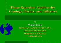 Flame Retardant Additives for Coatings, Plastics, and Adhesives by Walter Conti BUCKMAN LABORATORIES, INC. 1256 North McLean Blvd. Memphis, TN 38108-1241 1-800-282-5626 Mission • “We, the associates of Buckman Laboratories, will excel in providing measurable, cost-effective improvements in output and quality for our customers by delivering customer-specific services and products, and the creative application of knowledge” Buckman Laboratories Flame Retardant Additives for Coatings, Plastics, and Adhesives Definition of FIRE • Fire is one of the 4 Elements: EARTH, AIR, FIRE and WATER. • By Webster, Fire is defined as: – A Rapid, persistent chemical reaction that releases heat and light, esp. the exothermic combustion of a combustible substance with oxygen. Fire Flashover Upholstered Chair Fire (elapsed time 4:50 min/sec) TV/ Low Level Ignition (not flame retarded) TV/ Low Level Ignition (flame retarded) Introduction • Almost anything will burn. • The objective of flame retarding is to increase the resistance of a product to ignition and to reduce flame spread. Thus, the use of a flame retardant may prevent a small fire from becoming a major catastrophe. Introduction (con't.) • A National Bureau of Standards (U.S.) study comparing fire retarded and non-fire retarded products concluded that fire retardant additives decreased the overall fire hazard of their host products. FIRE Statistics • US has one of the highest fire death rates in the industrialized world • More than 2 million fires reported each year / cost of 8.1 billion dollars • Where fires occur in the home: – Kitchen 29% – Bedroom 13% – Living Room/Den 8% – Chimney 8% – Laundry Area 4% • Top causes of residential fires: – – – – Careless Smoking Arson Alternative heaters Cooking Determining the Fire Hazard of a Product • Factors needed to be considered in determining the fire hazard of a product are – – – – – – Ignitability Flammability Heat released when burned Heat release rate Smoke obscuration Toxicity of the smoke generated Flame Retardant Market • The overall market for flame retardant chemicals is controlled by government regulations, insurance underwriters, national or local building codes, special regulations and compliance with existing and anticipated standards. • Without these regulatory actions or mandatory standards, flame retardant chemicals probably would not be used to an appreciable extent. Flame Retardant Market • Fire Retardant additives in – – – – Plastics Adhesives Paints and Coatings Other 9.4% 0.2% 4.8% 8.1% (con't.) Desired Properties of a Flame Retardant • • • • • High Decomposition Temperature Low volatility Non-blooming or plate-out Minimal effect on final physical properties Low toxicity (no single additive meets all these requirements) 3 Things are Needed to Sustain FIRE • Flame • Oxygen • Fuel Phases in the course of a Fire Fire triangle (according to Emmons) Mechanisms of Flame Retardants • Endothermicity • Char former • Vapor phase ENDOTHERMICITY • Mode of action - heat absorber – Primarily utilize evaporative cooling provided by chemically bound water and diluting the oxygen in the gas-phase reaction • Examples – Alumina trihydrate and magnesium hydroxide • They are relatively inefficient • High use levels required comprimise products physical properties CHAR FORMER • Mode of action - Char former – As the material is broken down a char or carbon layer is formed. This char acts as a physical barrier excluding oxygen and fuel for the fire. • Examples – Barium/Calcium metaborates, phosphorus compounds, zinc borate. These products work best with a halogen donor of some sort (chlorinated resin, chlorinated wax, other synergistic flame retardant) VAPOR PHASE • Mode of action - Chemically inhibit flame – Free radicals generated during combustion are scavenged by halogens (which compete with oxygen - no oxygen, no flame) stopping the chain reaction of combustion. • Inexpensive • Examples – Halogenated materials (deca-brome type, chlorinated paraffin wax, phosphate esters, antimony tri and pentoxide) Major US Producers of Flame Retardant Chemicals • Product Alumina Trihydrate • Antimony Oxide • • Boron Compounds Brominated Phosphates • Chlorinated Cmpds • Chlorinated Phosphates • Molybdenum Cmpds • Phosphate Esters Company Alcoa LaRoche Chemical Reynolds Metals Solem Albermarle Anzon Cookson Laurel Buckman Laboratories Climax US Borax Ameribrom / Dead Sea Bromine Albermarle Ferro Great Lakes Chemical FMC Ferro Dover Chemical Occidental Pearsall Akzo Albright and Wilson AMAX Sherwin William Akzo Monsanto Tradename FlameGaurd Fireshield, Thermogaurd Flamebloc Firebrake Saytex Firemaster, Smokebloc Characteristics of Other Most Widely Used FR’s • Antimony Tri/Pentoxide (Sb2O3)– Pros • Inexpensive Commodity (large price swings $1 - $3) • Fine particle size • Track Record in many materials and applications – Cons • • • • • May Cause “Antimony Measles” in workers Halogen needed for optimal performance High loading levels, possibly decreased physical properties Higher product density Most supply is imported (commodity, large price swings) – See Technical Data Sheet Example Characteristics of Other Most Widely Used FR’s • Zinc Borate (ZnBO3) – Pros • Inexpensive • Similar RI of most thermoplastics (lower pigment levels) • Track Record in many materials and applications – Cons • High loading levels, possibly decreasing final physical properties • Halogen needed for optimal performance • High product density • Water of hydration Characteristics of Other Most Widely Used FR’s • Brominated Flame Retardant (BFR's) – Pros • Cost Effective • Track Record in many materials and applications – Cons • Halogen (Bromine) • Brominated materials under scrutiny in Europe, US may follow • Not readily biodegradable - environme