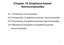 Chapter 10 Graphene-based Nanocomposites 10.1 Introduction of composites 10.2 Introduction of graphene-polymer nanocomposites 10.3 Processing of graphene-polymer nanocomposites 10.4 Mechanical properties of graphene-polymer nanocomposites 1 10.1 Introduction of composites Definition: A composites is a material having two or more distinct constituents or phases, and have to satisfy the following criteria: 1. Both constituents have to present in reasonable proportions, say greater than 5%; 2. The constituents phases have different properties, and hence the composite properties are noticeably different from the properties of the constituents; 3. A man-made composite is usually produced by intimately mixing and combining the constituents by various means. Nanocomposites: Composites contain two or more nano-sized fillers. (Nano-structural composites) 2 10.1.1 Category of fibers and matrix for composites Fibers: Natural fibers Synthetic organic fibers Aramid fiber Polyethylene fiber Synthetic inorganic fibers Glass fibers Alumina fibers Boron fibers Carbon fibers Si C fibers Whiskers(SiC is available in the form of whiskers, i.e., small single crystals):A few tens of microns in length and less than one micro in diameter. Matrix: Polymer (polymeric composites) Metals (metal matrix composites) Ceramic (ceramic matrix composites) Carbon (carbon/carbon composites) 3 10.1.2 Fillers and matrix for nanocomposites Fillers: Carbon nanotubes Graphene Matrix: Polymer (polymeric composites) Carbon (carbon/carbon composites) The major concern of CNT- or graphene-based nanocomposites is improvement in physical property (such as electrical conductivity) rather than mechanical properties of the nanocomposites. 4 10.1.3 Reinforcement-matrix interface of composites Wettability: Interfacial bonding is due to adhesion between the reinforcement and the matrix and to mechanical keying. Clearly, for adhesion to occur, the matrix must be brought into intimate contact with reinforcements. Wettability defines the extent to which a liquid will spread over a solid surface. Interfacial bonding: Once th ematrix has wet the reinforcement, and is therefore in intimate contact with the reinforcement, bonding will occur. (a) Mechanical bonding A mechanical interlocking or keying of two surfaces can lead to a reasonable bond. (b) Electrostatic bonding Bonding occurs between the matrix and the reinforcement when one surface is positively charges and the other negatively charged. (c) Chemical bonding The bonds formed between chemical groups on the reinforcement surface and compatible groups in the materix. (d) Reaction or interdiffusion bonding The atoms or molecules of the two components of the composite may interdiffuse at the interface. 5 10.2 Introduction of graphene-polymer nanocomposites Graphene with the following attracted characteristics:[10-1] @1 1. 2. 3. 4. 5. High specific surface area (2600 m2/g) High modulus of ~1 TPa High fracture strength of ∼130 Gpa, High failure strain of 25% High thermal conductivity of 4840−5300 W/mK (estimate using the shift in the Raman G peak) 6. High electron mobility as high as 15 000 cm2/(V sec). Challenges: 1. Producing large scale quantities and high quality of isolated pristine graphene sheets. 2. Uniform dispersion of graphene in polymer and bonding of graphene with polymer matrix.@2 6 To produce isolated pristine graphene sheets, the direct exfoliation in highly polar organic solvents such as dimethylformamide (DMF) and Nmethyl-pyrrolidone (NMP) by sonication or in chlorosulfonic acid through simple dissolution, but these methods are not currently suited for polymers since the colloidal suspensions cannot support high graphene concentrations and the stability of the mixture strongly depends on the surface energy of the solvent. [10-1] 7 10.3 Processing of graphene-polymer nanocomposites [10-2] Three primary routes for preparing graphene-polymer nanocomposites 1. In situ polymerization[10-1] In situ polymerization intercalates the graphene oxide with a hydrophilic polymer or polar monomers, then polymerizes the intercalated to isolate the single layer sheets. 2. Solution mixing[10-1] Solution casting or melt processing can produce nanocomposites from a variety of polymers in a highly scalable manner. While this is a simple approach, it has not yet been demonstrated to produce single layer graphene sheets without the use of stabilizers or surfactants that may negatively affect the composite, specifically the interface. 3. Melt blending Melt compounding utilizes both high-shear forces and high-temperature melting to blend the filler and matrix material. 8 10.3.1 In situ reduction and polymerization Dispersed GO in N,N-dimethylformamide (DMF) through vortex mixing and mild sonication to form a colloidal suspension of single layer GO sheets; Dissolved PVDF into the DMF/GO solution, then the mixture was casted onto a Telfon substrate to dry overnight at 60 °C under atmospheric. Once the solvent is entirely removed from the polymer matrix, the graphene oxide sheets become immobilized in the rigid polymer matrix (Figure 1a2). The in situ reduction process is then carried out by hot pressing the PVDF/GO film at 200 °C for 2 h, yielding nanocomposites with isolated single layers of reduced-graphene oxide (Figure 1a3). 9 The color of the film changes during heat treatment from light brown to black as shown in Figure 1b. Color change indicates removal of the oxygen functionalities and the partial restoration of the graphitic structure during thermal treatment. These results demonstrate a high level of exfoliation of the GO with a typical sheet thickness less than 1 nm. 10 FE-SEM AFM) Figure 1e,f shows the fracture surface of virgin PVDF and PVDF with reduced graphene oxide, respectively. The nanocomposites with reduced-graphene oxide become rough compared to the cross section of PVDF. The wrinkled surface indicates the reduced graphene oxide in the polymer as shown in arrow of Figure 1f. 