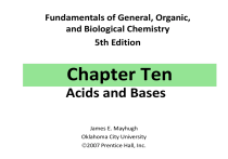 Fundamentals of General, Organic, and Biological Chemistry 5th Edition Chapter Ten Acids and Bases James E. Mayhugh Oklahoma City University 2007 Prentice Hall, Inc. Outline ► ► ► ► ► ► ► ► ► ► ► ► ► ► ► ► 10.1 Acids and Bases in Aqueous Solution 10.2 Some Common Acids and Bases 10.3 The Brønsted–Lowry Definition of Acids and Bases 10.4 Water as Both an Acid and a Base 10.5 Some Common Acid–Base Reactions 10.6 Acid and Base Strength 10.7 Acid Dissociation Constants 10.8 Dissociation of Water 10.9 Measuring Acidity in Aqueous Solution: pH 10.10 Working with pH 10.11 Laboratory Determination of Acidity 10.12 Buffer Solutions 10.13 Buffers in the Body 10.14 Acid and Base Equivalents 10.15 Titration 10.16 Acidity and Basicity of Salt Solutions Prentice Hall © 2007 Chapter Ten 2 10.1 Acids and Bases in Aqueous Solution ► An acid is a substance that produces hydrogen ions, H+, when dissolved in water. (Arrhenius definition) ► Hydronium ion: The H3O+ ion formed when an acid reacts with water. Prentice Hall © 2007 Chapter Ten 3 ► A base is a substance that produces hydroxide ions, OH-, when dissolved in water. (Arrhenius definition) ► Bases can be metal hydroxides that release OH- ions when they dissolve in water or compounds that undergo reactions with water that produce OH- ions. Prentice Hall © 2007 Chapter Ten 4 10.2 Some Common Acids and Bases ► Sulfuric acid, H2SO4, is manufactured in greater quantity than any other industrial chemical. It is the acid use in the petroleum and pharmaceutical industry’s, and found in automobile batteries. ► Hydrochloric acid, HCl, is “stomach acid” in the digestive systems of most mammals. ► Phosphoric acid, H3PO4, is used to manufacture phosphate fertilizers. The tart taste of many soft drinks is due to the presence of phosphoric acid. ► Nitric acid, HNO3, is a strong oxidizing agent that is used for many purposes. ► Acetic acid, CH3CO2H, is the primary organic constituent of vinegar. Chapter Ten Prentice Hall © 2007 5 ► Sodium hydroxide, NaOH, or lye, is used in the production of aluminum, glass, and soap. Drain cleaners often contain NaOH because it reacts with the fats and proteins found in grease and hair. ► Calcium hydroxide, Ca(OH)2 , or slaked lime, is made industrially by treating lime (CaO) with water. It is used in mortars and cements. An aqueous solution is often called limewater. ► Magnesium hydroxide, Mg(OH)2, or milk of magnesia, is an additive in foods, toothpaste, and many over-thecounter medications. Many antacids contain magnesium hydroxide, can also be used in mortars and cements. ► Ammonia, NH3, is used primarily as a fertilizer. A dilute solution of ammonia is frequently used around the house Prentice Hall ©as 2007a glass cleaner. 6 Chapter Ten Soap is manufactured by the reaction of vegetable oils and animal fats with the bases NaOH and KOH. Sodium hydroxide is also called caustic soda or lye and is the most commonly used of all bases. 10.3 The Brønsted-Lowry Definition of Acids and Bases ► A Brønsted–Lowry acid can donate H+ ions. ► Monoprotic acids can donate 1 H+ ion, diprotic acids can donate 2 H+ ions, and triprotic acids can donate 3 H+ ions. Prentice Hall © 2007 Chapter Ten 8 Acetic acid is an organic acid, which donates a hydrogen ion in solution. Just one of the hydrogen's on acetic acid is acidic. The hydrogen attached to the electronegative oxygen atom is the acidic hydrogen on acetic acid. ► A Brønsted–Lowry base accepts H+ ions. ► Putting the acid and base definitions together, an acid–base reaction is one in which a proton is transferred. The reaction need not occur in water. Prentice Hall © 2007 Chapter Ten 10 Which of the following would you expect to be a BrØnsted-Lowry acid or BrØnsted-Lowry base? 1. 2. 3. 4. Fe3+ H2CrO4 NH3 NO3– Which of the following would you expect to be a BrØnsted-Lowry acid? 1. 2. 3. 4. Fe3+ H2CrO4 NH3 NO3– (referred to as a Lewis Acid) acid: 2H+ + CrO42base: NH4+ base: HNO3 Which of the following would you expect to be a BrØnsted-Lowry base? 1. 2. 3. 4. HNO2 NH4+ Ni2+ PO43– Which of the following would you expect to be a BrØnsted-Lowry base? 1. 2. 3. 4. HNO2 NH4+ Ni2+ PO43– ► Conjugate acid–base pair: Two substances whose formulas differ by only a hydrogen ion, H+. ► Conjugate base: The substance formed by loss of H+ from an acid. ► Conjugate acid: The substance formed by addition of H+ to a base. Prentice Hall © 2007 Chapter Ten 15 ►Indentify the conjugate acid/base pairs HCO3-(aq) + H2O(l) ⇄ CO32-(aq) + H3O+(aq) HF(aq) + HPO42-(aq) ⇄ F-(aq) + H2PO4-(aq) Prentice Hall © 2007 Chapter Ten 17 ►Indentify the conjugate acid/base pairs acid base HCO3-(aq) + H2O(l) ⇄ CO32-(aq) + H3O+(aq) base acid acid base HF(aq) + HPO42-(aq) ⇄ F-(aq) + H2PO4-(aq) base Prentice Hall © 2007 acid Chapter Ten 18 10.4 Water as Both an Acid and a Base ► Water is neither an acid nor a base in the Arrhenius sense because it does not produce appreciable concentrations of either H+ or OH-. In the Brønsted– Lowry sense water is both an acid and a base. ► In its reaction with ammonia, water donates H+ to ammonia to form the ammonium ion. Prentice Hall © 2007 Chapter Ten 19 ► When water reacts as a Brønsted–Lowry base, it accepts H+ from an acid like HCl. ► Substances like water, which can react as either an acid or a base depending on the circumstances, are said to be amphoteric. Prentice Hall © 2007 Chapter Ten 20 10.5 Some Common Acid-Base Reactions ► Acids react with metal hydroxides to yield water and a salt in a neutralization reaction. The H+ ions and OH- ions are used up in the formation of water. HA(aq) + MOH(aq)H2O(l) +MA(aq) ► Carbonate and bicarbonate ions react with acid by accepting H+ ions to yield carbonic acid, which is unstable, and rapidly decomposes to yield carbon dioxide gas and water. H2CO3(aq)H2O(l) + CO2(g) Prentice Hall © 2007 Chapter Ten 21 ► Acids rea