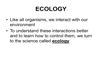 ECOLOGY • Like all organisms, we interact with our environment • To understand these interactions better and to learn how to control them, we turn to the science called ecology Interactions and Interdependence • Ecology is the scientific study of interactions among organisms and between organisms and their environment, or surroundings • The word ecology was coined in 1866 by the German biologist Ernst Haeckel. Haeckel based this term on the Greek word oikos, meaning house, which is also the root of the word economy • Haeckel saw the living world as a household with an economy in which each organism plays a role ECOLOGY • Nature's “houses” come in many sizes—from single cells to the entire planet • The largest of these houses is called the biosphere: – The biosphere contains the combined portions of the planet in which all of life exists, including land, water, and air, or atmosphere – It extends from about 8 kilometers above Earth's surface to as far as 11 kilometers below the surface of the ocean ECOLOGY • Interactions within the biosphere produce a web of inter-dependence between organisms and the environment in which they live • Whether it occurs on top of a glacier, in a forest, or deep within an ocean trench, the interdependence of life on Earth contributes to an ever-changing, or dynamic, biosphere ECOLOGY • The many levels of organization that ecologists study are shown below ECOLOGY ECOLOGY • • • • • Some ecologists study interactions between a particular kind of organism and its surroundings Such studies focus on the species level A species is a group of organisms so similar to one another that they can breed and produce fertile offspring Other ecologists study populations, or groups of individuals that belong to the same species and live in the same area Still other ecologists study communities, or assemblages of different populations that live together in a defined area ECOLOGY • • • • • Ecologists may study a particular ecosystem An ecosystem is a collection of all the organisms that live in a particular place, together with their nonliving, or physical, environment Larger systems called biomes are also studied by teams of ecologists A biome is a group of ecosystems that have the same climate and similar dominant communities The highest level of organization that ecologists study is the entire biosphere itself: area of the earth where life exist Ecological Methods • Ecologists use a wide range of tools and techniques to study the living world – Some use binoculars and field guides to assess changes in plant and wildlife communities – Others use studies of DNA to identify bacteria in the mud of coastal marshes – Still others use radio tags to track migrating wildlife or use data gathered by satellites • Regardless of the tools they use, scientists conduct modern ecological research using three basic approaches: observing, experimenting, and modeling • All of these approaches rely on the application of scientific methods to guide ecological inquiry Observing • Observing is often the first step in asking ecological questions • Some observations are simple: – What species live here? – How many individuals of each species are there? • Other observations are more complex and may form the first step in designing experiments and models Experimenting • Experiments can be used to test hypotheses • An ecologist may set up an artificial environment in a laboratory to imitate and manipulate conditions that organisms would encounter in the natural world • Other experiments are conducted within natural ecosystems Modeling • Many ecological phenomena occur over long periods of time or on such large spatial scales that they are difficult to study • Ecologists make models to gain insight into complex phenomena such as the effects of global warming on ecosystems • Many ecological models consist of mathematical formulas based on data collected through observation and experimentation • The predictions made by ecological models are often tested by further observations and experiments Energy Flow • At the core of every organism's interaction with the environment is its need for energy to power life's processes • Example: – Energy that ants use to carry objects many times their size or the energy that birds use to migrate thousands of miles – Think about the energy that you need to get out of bed in the morning! • The flow of energy through an ecosystem is one of the most important factors that determines the system's capacity to sustain life Producers • Without a constant input of energy, living systems cannot function • Sunlight is the main energy source for life on Earth: Photosynthesis – Of all the sun's energy that reaches Earth's surface, only a small amount—less than 1 percent—is used by living things – This seemingly small amount is enough to produce as much as 3.5 kilograms of living tissue per square meter a year in some tropical forests Producers • In a few ecosystems, some organisms obtain energy from a source other than sunlight • Some types of organisms rely on the energy stored in inorganic chemical compounds: Chemosynthesis – Example: mineral water that flows underground or boils out of hot springs and undersea vents is loaded with chemical energy Producers • Only plants, some algae, and certain bacteria can capture energy from sunlight or chemicals and use that energy to produce food • These organisms are called autotrophs: – Autotrophs use energy from the environment to fuel the assembly of simple inorganic compounds into complex organic molecules – These organic molecules combine and recombine to produce living tissue – Because they make their own food, autotrophs are also called producers • Both types of producers — those that capture energy from sunlight and those that capture chemical energy— are essential to the flow of energy through the biosphere 